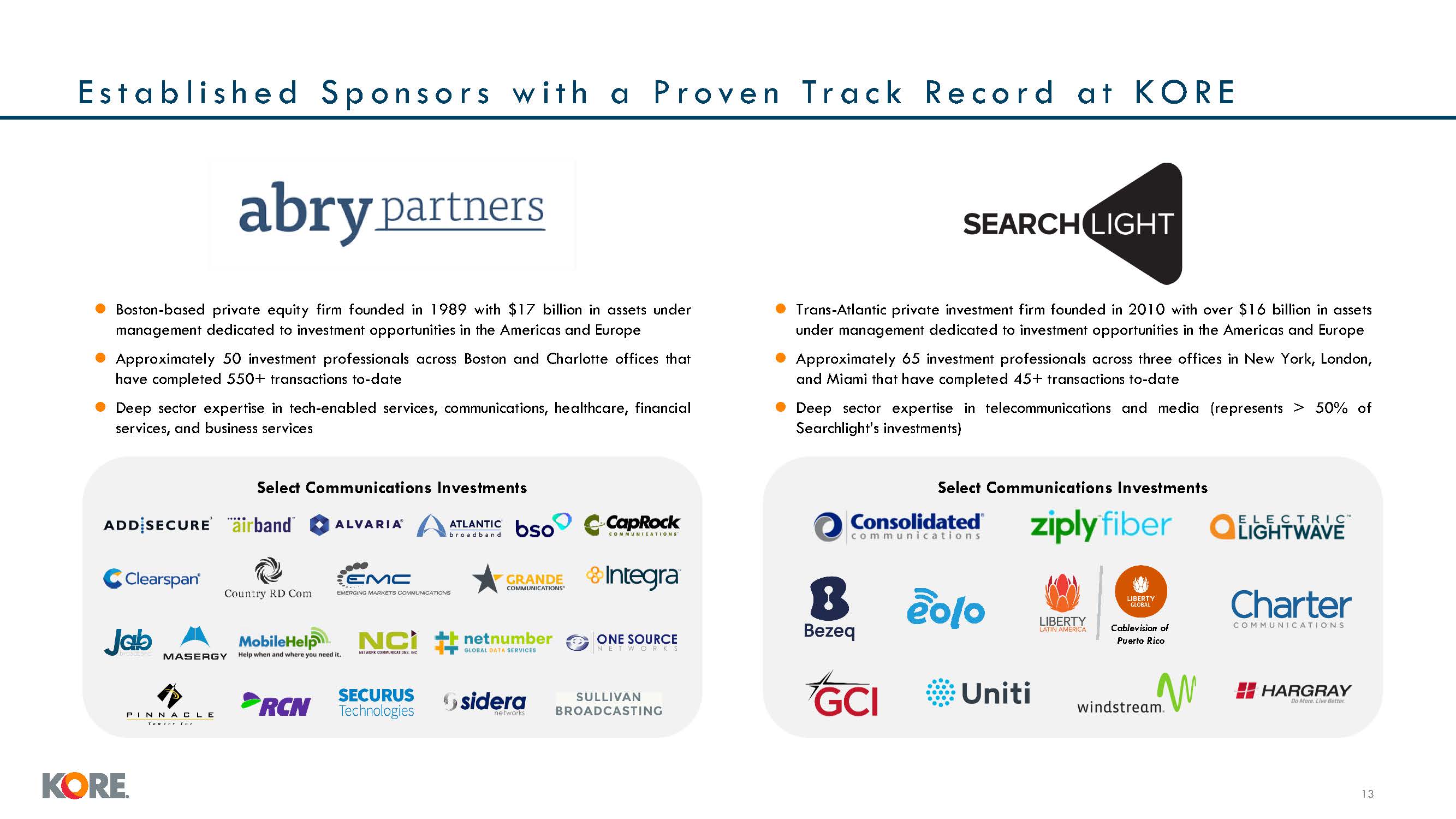 E s t a b l i s h e d S p o n s o r s w i t h a P r o v e n Tr a c k R e c o r d a t K O R E  Trans-Atlantic private investment firm founded in 2010 with over $16 billion in assets under management dedicated to investment opportunities in the Americas and Europe  Approximately 65 investment professionals across three offices in New York, London, and Miami that have completed 45+ transactions to-date  Deep sector expertise in telecommunications and media (represents > 50% of  Searchlight’s investments)  Select Communications Investments  Cablevision of Puerto Rico  Boston-based private equity firm founded in 1989 with $17 billion in assets under management dedicated to investment opportunities in the Americas and Europe  Approximately 50 investment professionals across Boston and Charlotte offices that have completed 550+ transactions to-date  Deep sector expertise in tech-enabled services, communications, healthcare, financial services, and business services  Select Communications Investments  13