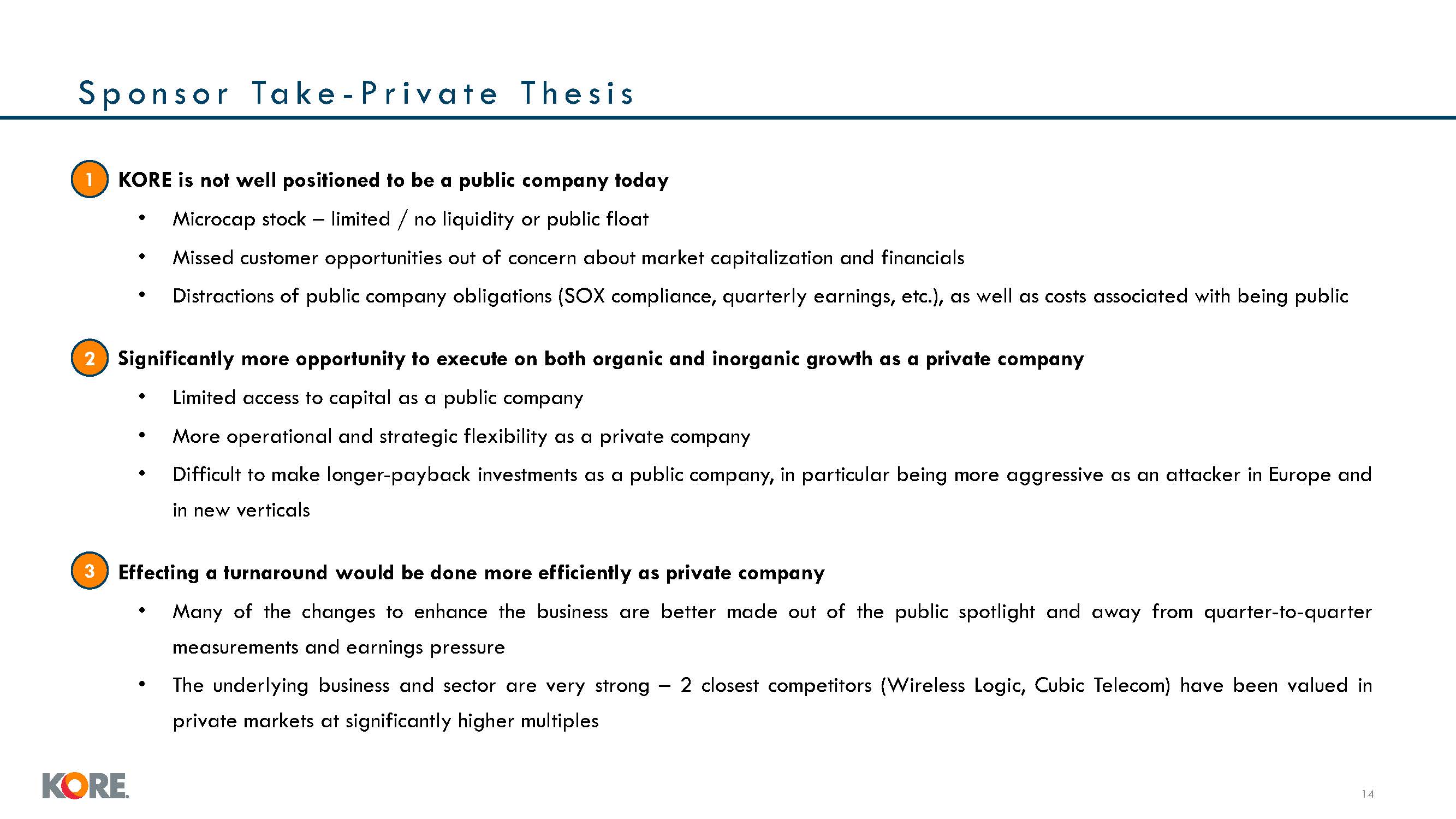 S p o n s o r Ta k e - P r i v a t e T h e s i s  •1 KORE is not well positioned to be a public company today  Microcap stock – limited / no liquidity or public float  Missed customer opportunities out of concern about market capitalization and financials  Distractions of public company obligations (SOX compliance, quarterly earnings, etc.), as well as costs associated with being public  •2 Significantly more opportunity to execute on both organic and inorganic growth as a private company  Limited access to capital as a public company  More operational and strategic flexibility as a private company  Difficult to make longer-payback investments as a public company, in particular being more aggressive as an attacker in Europe and in new verticals  •3 Effecting a turnaround would be done more efficiently as private company  Many of the changes to enhance the business are better made out of the public spotlight and away from quarter-to-quarter measurements and earnings pressure  The underlying business and sector are very strong – 2 closest competitors (Wireless Logic, Cubic Telecom) have been valued in private markets at significantly higher multiples  13