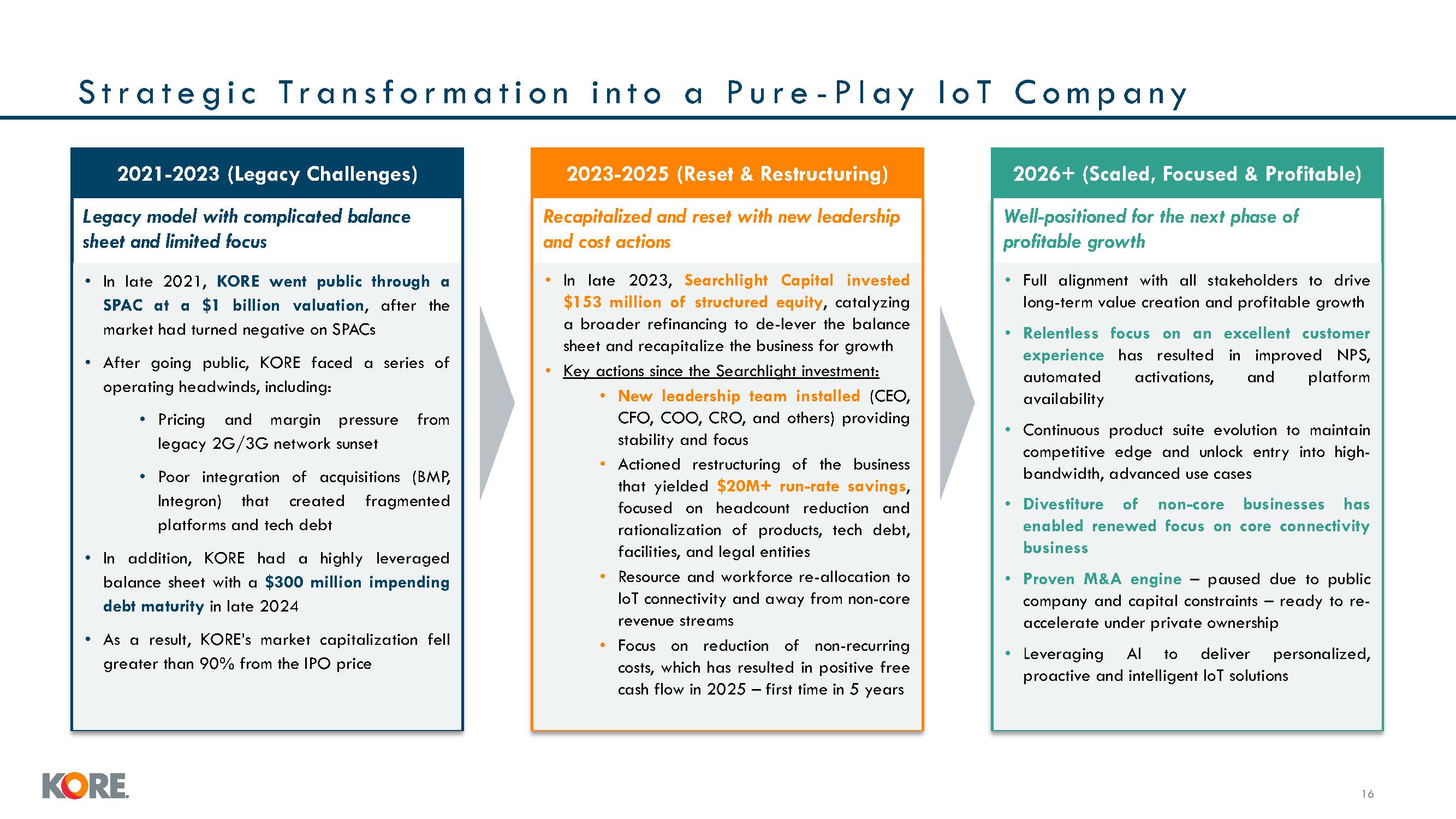 S t r a t e g i c Tr a n s f o r m a t i o n i n t o a P u r e - P l a y I o T C o m p a n y  2021-2023 (Legacy Challenges)  Legacy model with complicated balance sheet and limited focus  2023-2025 (Reset & Restructuring)  Recapitalized and reset with new leadership and cost actions  2026+ (Scaled, Focused & Profitable)  Well-positioned for the next phase of profitable growth  In late 2021, KORE went public through a SPAC at a $1 billion valuation, after the market had turned negative on SPACs  After going public, KORE faced a series of operating headwinds, including:  Pricing and margin pressure from  legacy 2G/3G network sunset   Poor integration of acquisitions (BMP, Integron) that created fragmented platforms and tech debt  In addition, KORE had a highly leveraged balance sheet with a $300 million impending debt maturity in late 2024  As a result, KORE’s market capitalization fell greater than 90% from the IPO price  In late 2023, Searchlight Capital invested  $153 million of structured equity, catalyzing a broader refinancing to de-lever the balance sheet and recapitalize the business for growth  Key actions since the Searchlight investment:   New leadership team installed (CEO, CFO, COO, CRO, and others) providing stability and focus   Actioned restructuring of the business that yielded $20M+ run-rate savings, focused on headcount reduction and rationalization of products, tech debt, facilities, and legal entities   Resource and workforce re-allocation to IoT connectivity and away from non-core revenue streams   Focus on reduction of non-recurring costs, which has resulted in positive free cash flow in 2025 – first time in 5 years   Full alignment with all stakeholders to drive long-term value creation and profitable growth   Relentless focus on an excellent customer experience has resulted in improved NPS, automated activations, and platform availability   Continuous product suite evolution to maintain competitive edge and unlock entry into high-bandwidth, advanced use cases   Divestiture of non-core businesses has enabled renewed focus on core connectivity business   Proven M&A engine – paused due to public company and capital constraints – ready to re-accelerate under private ownership   Leveraging AI to deliver personalized, proactive and intelligent IoT solutions  16