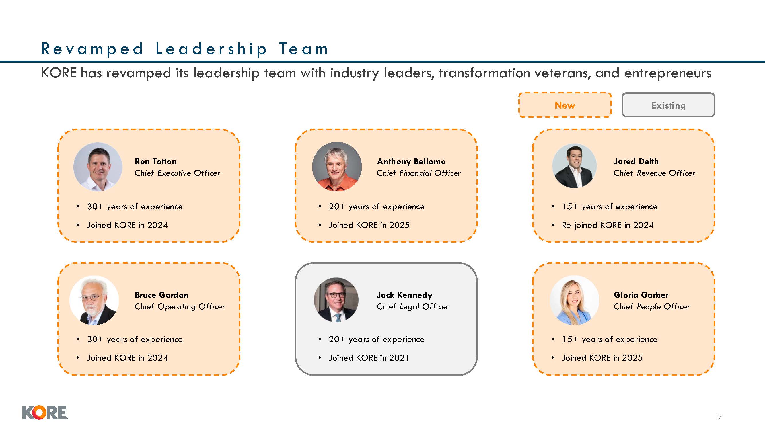 R e v a m p e d L e a d e r s h i p Te a m  Ron Totton  Chief Executive Officer  Bruce Gordon  Chief Operating Officer  Jared Deith  Chief Revenue Officer  Anthony Bellomo  Chief Financial Officer  Jack Kennedy  Chief Legal Officer  Gloria Garber  Chief People Officer  KORE has revamped its leadership team with industry leaders, transformation veterans, and entrepreneurs  New Existing  30+ years of experience  Joined KORE in 2024  16  30+ years of experience  Joined KORE in 2024  20+ years of experience  Joined KORE in 2021  15+ years of experience  Joined KORE in 2025  20+ years of experience  Joined KORE in 2025  15+ years of experience  Re-joined KORE in 2024