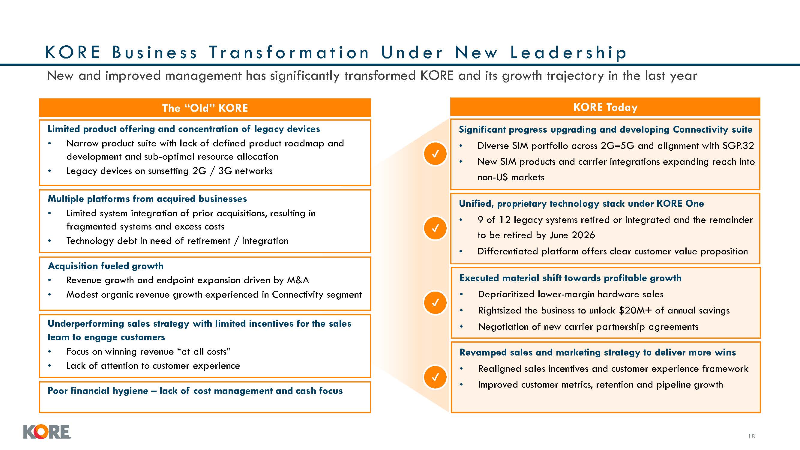 K O R E B u s i n e s s Tr a n s f o r m a t i o n U n d e r N e w L e a d e r s h i p  Limited product offering and concentration of legacy devices  Narrow product suite with lack of defined product roadmap and development and sub-optimal resource allocation  Legacy devices on sunsetting 2G / 3G networks  Multiple platforms from acquired businesses  Limited system integration of prior acquisitions, resulting in fragmented systems and excess costs  Technology debt in need of retirement / integration  Acquisition fueled growth  Revenue growth and endpoint expansion driven by M&A  Modest organic revenue growth experienced in Connectivity segment  Underperforming sales strategy with limited incentives for the sales team to engage customers   ocus on winning revenue “at all costs”  Lack of attention to customer experience  The “Old” KORE  Significant progress upgrading and developing Connectivity suite  Diverse SIM portfolio across 2G–5G and alignment with SGP.32  New SIM products and carrier integrations expanding reach into non-US markets  Unified, proprietary technology stack under KORE One  9 of 12 legacy systems retired or integrated and the remainder to be retired by June 2026  Differentiated platform offers clear customer value proposition  Executed material shift towards profitable growth  Deprioritized lower-margin hardware sales  Rightsized the business to unlock $20M+ of annual savings  Negotiation of new carrier partnership agreements  Revamped sales and marketing strategy to deliver more wins  Realigned sales incentives and customer experience framework  Improved customer metrics, retention and pipeline growth  KORE Today  New and improved management has significantly transformed KORE and its growth trajectory in the last year  Poor financial hygiene – lack of cost management and cash focus  16