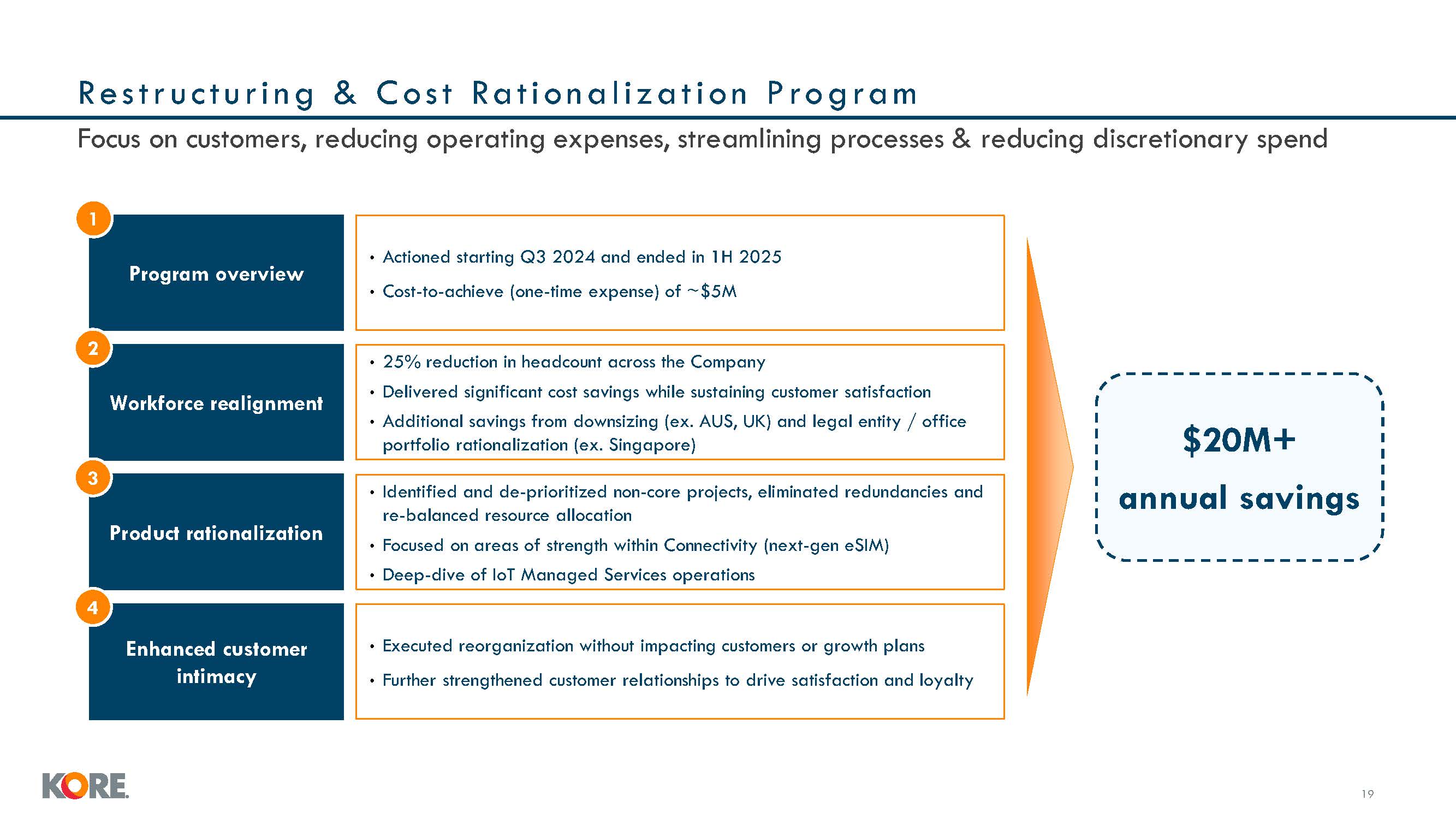 Workforce realignment  Product rationalization  Res t r u c t u r i n g & C os t Ration a l i z at i on Program  $20M+  annual savings  Focus on customers, reducing operating expenses, streamlining processes & reducing discretionary spend  Program overview  Actioned starting Q3 2024 and ended in 1H 2025  Cost-to-achieve (one-time expense) of ~$5M  1  25% reduction in headcount across the Company  Delivered significant cost savings while sustaining customer satisfaction  Additional savings from downsizing (ex. AUS, UK) and legal entity / office  portfolio rationalization (ex. Singapore)  2  Identified and de-prioritized non-core projects, eliminated redundancies and  re-balanced resource allocation  Focused on areas of strength within Connectivity (next-gen eSIM)  Deep-dive of IoT Managed Services operations  3  Enhanced customer  intimacy  Executed reorganization without impacting customers or growth plans  Further strengthened customer relationships to drive satisfaction and loyalty  4  16