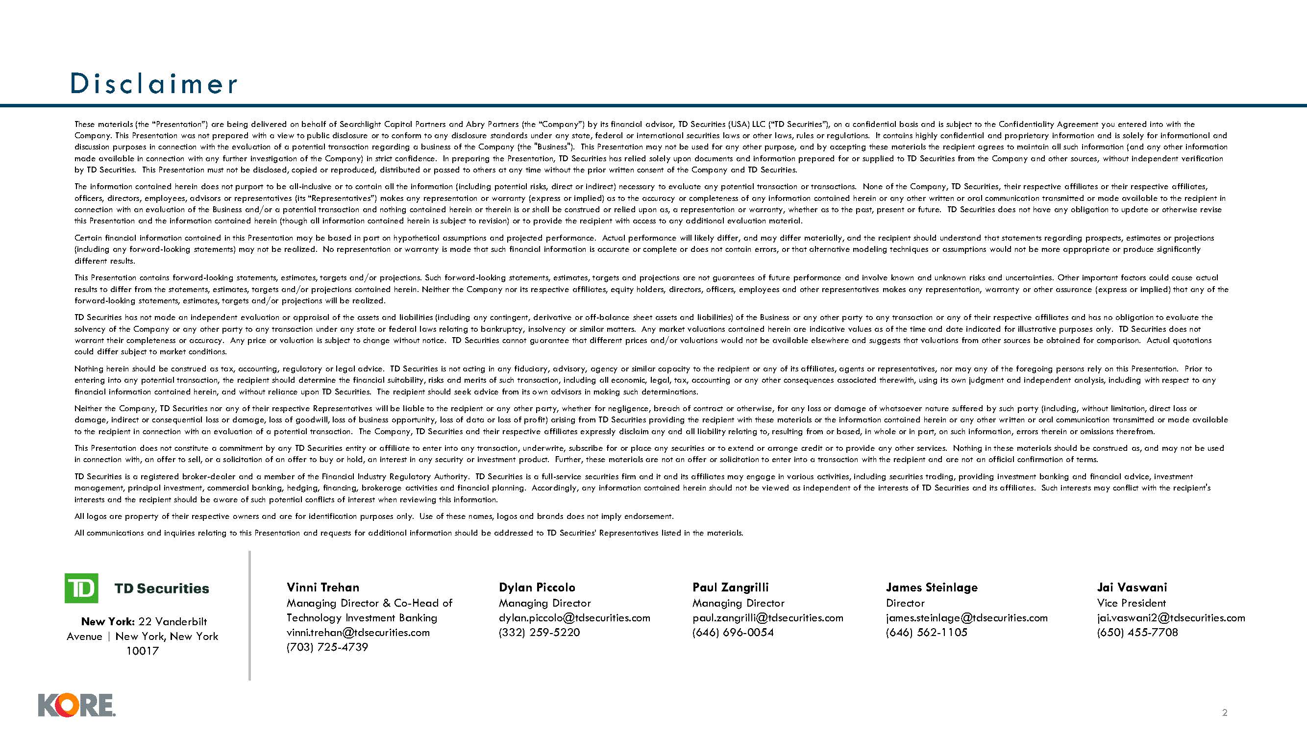 D i s c l a imer  These materials (the “Presentation”) are being delivered on behalf of Searchlight Capital Partners and Abry Partners (the “Company”) by its financial advisor, TD Securities (USA) LLC (“TD Securities”), on a confidential basis and is subject to the Confidentiality Agreement you entered into with the Company. This Presentation was not prepared with a view to public disclosure or to conform to any disclosure standards under any state, federal or international securities laws or other laws, rules or regulations. It contains highly confidential and proprietary information and is solely for informational and discussion purposes in connection with the evaluation of a potential transaction regarding a business of the Company (the "Business"). This Presentation may not be used for any other purpose, and by accepting these materials the recipient agrees to maintain all such information (and any other information made available in connection with any further investigation of the Company) in strict confidence. In preparing the Presentation, TD Securities has relied solely upon documents and information prepared for or supplied to TD Securities from the Company and other sources, without independent verification by TD Securities. This Presentation must not be disclosed, copied or reproduced, distributed or passed to others at any time without the prior written consent of the Company and TD Securities.  The information contained herein does not purport to be all-inclusive or to contain all the information (including potential risks, direct or indirect) necessary to evaluate any potential transaction or transactions. None of the Company, TD Securities, their respective affiliates or their respective affiliates, officers, directors, employees, advisors or representatives (its “Representatives”) makes any representation or warranty (express or implied) as to the accuracy or completeness of any information contained herein or any other written or oral communication transmitted or made available to the recipient in connection with an evaluation of the Business and/or a potential transaction and nothing contained herein or therein is or shall be construed or relied upon as, a representation or warranty, whether as to the past, present or future. TD Securities does not have any obligation to update or otherwise revise this Presentation and the information contained herein (though all information contained herein is subject to revision) or to provide the recipient with access to any additional evaluation material.  Certain financial information contained in this Presentation may be based in part on hypothetical assumptions and projected performance. Actual performance will likely differ, and may differ materially, and the recipient should understand that statements regarding prospects, estimates or projections (including any forward-looking statements) may not be realized. No representation or warranty is made that such financial information is accurate or complete or does not contain errors, or that alternative modeling techniques or assumptions would not be more appropriate or produce significantly different results.  This Presentation contains forward-looking statements, estimates, targets and/or projections. Such forward-looking statements, estimates, targets and projections are not guarantees of future performance and involve known and unknown risks and uncertainties. Other important factors could cause actual results to differ from the statements, estimates, targets and/or projections contained herein. Neither the Company nor its respective affiliates, equity holders, directors, officers, employees and other representatives makes any representation, warranty or other assurance (express or implied) that any of the forward-looking statements, estimates, targets and/or projections will be realized.  TD Securities has not made an independent evaluation or appraisal of the assets and liabilities (including any contingent, derivative or off-balance sheet assets and liabilities) of the Business or any other party to any transaction or any of their respective affiliates and has no obligation to evaluate the solvency of the Company or any other party to any transaction under any state or federal laws relating to bankruptcy, insolvency or similar matters. Any market valuations contained herein are indicative values as of the time and date indicated for illustrative purposes only. TD Securities does not warrant their completeness or accuracy. Any price or valuation is subject to change without notice. TD Securities cannot guarantee that different prices and/or valuations would not be available elsewhere and suggests that valuations from other sources be obtained for comparison. Actual quotations could differ subject to market conditions.  Nothing herein should be construed as tax, accounting, regulatory or legal advice. TD Securities is not acting in any fiduciary, advisory, agency or similar capacity to the recipient or any of its affiliates, agents or representatives, nor may any of the foregoing persons rely on this Presentation. Prior to entering into any potential transaction, the recipient should determine the financial suitability, risks and merits of such transaction, including all economic, legal, tax, accounting or any other consequences associated therewith, using its own judgment and independent analysis, including with respect to any financial information contained herein, and without reliance upon TD Securities. The recipient should seek advice from its own advisors in making such determinations.  Neither the Company, TD Securities nor any of their respective Representatives will be liable to the recipient or any other party, whether for negligence, breach of contract or otherwise, for any loss or damage of whatsoever nature suffered by such party (including, without limitation, direct loss or damage, indirect or consequential loss or damage, loss of go