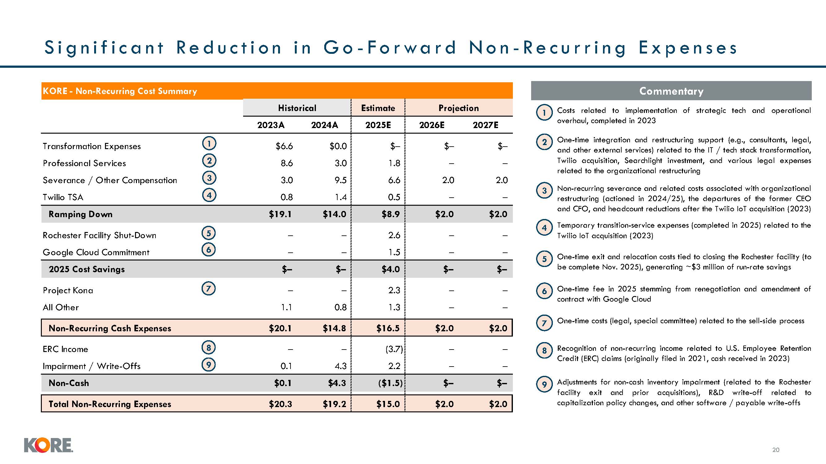S i g n i f i c a n t R e d u c t i o n i n G o - F o r wa r d N o n - R e c u r r i n g E x p e n s e s  Commentary  1  Costs related to implementation of strategic tech and operational overhaul, completed in 2023  KORE - Non-Recurring Cost Summary  Historical  Estimate  Projection  2023A 2024A  2025E  2026E 2027E  Transformation Expenses 1 $6.6 $0.0  Professional Services 2 8.6 3.0  Severance / Other Compensation 3 3.0 9.5  Twilio TSA 4 0.8 1.4   –  1.8  6.6  0.5   – –  – –  2.0 2.0  – –  Ramping Down $19.1 $14.0  $8.9  $2.0 $2.0  Rochester Facility Shut-Down 5 – –  Google Cloud Commitment 6 – –  2.6  1.5  – –  – –  2025 Cost Savings $– $–  $4.0  $– $–  Project Kona 7 – –  All Other 1.1 0.8  2.3  1.3  – –  – –  Non-Recurring Cash Expenses $20.1 $14.8  $16.5  $2.0 $2.0  ERC Income 8 – –  Impairment / Write-Offs 9 0.1 4.3  (3.7)  2.2  – –  – –  Non-Cash $0.1 $4.3  ($1.5)  $– $–  Total Non-Recurring Expenses $20.3 $19.2  $15.0  $2.0 $2.0  7  One-time costs (legal, special committee) related to the sell-side process  2  One-time integration and restructuring support (e.g., consultants, legal, and other external services) related to the IT / tech stack transformation, Twilio acquisition, Searchlight investment, and various legal expenses related to the organizational restructuring  Non-recurring severance and related costs associated with organizational restructuring (actioned in 2024/25), the departures of the former CEO and CFO, and headcount reductions after the Twilio IoT acquisition (2023)  Temporary transition-service expenses (completed in 2025) related to the Twilio IoT acquisition (2023)  3  4  5  One-time exit and relocation costs tied to closing the Rochester facility (to be complete Nov. 2025), generating ~$3 million of run-rate savings  6  One-time fee in 2025 stemming from renegotiation and amendment of contract with Google Cloud  8  Recognition of non-recurring income related to U.S. Employee Retention Credit (ERC) claims (originally filed in 2021, cash received in 2023)  9  16  Adjustments for non-cash inventory impairment (related to the Rochester facility exit and prior acquisitions), R&D write-off related to capitalization policy changes, and other software / payable write-offs