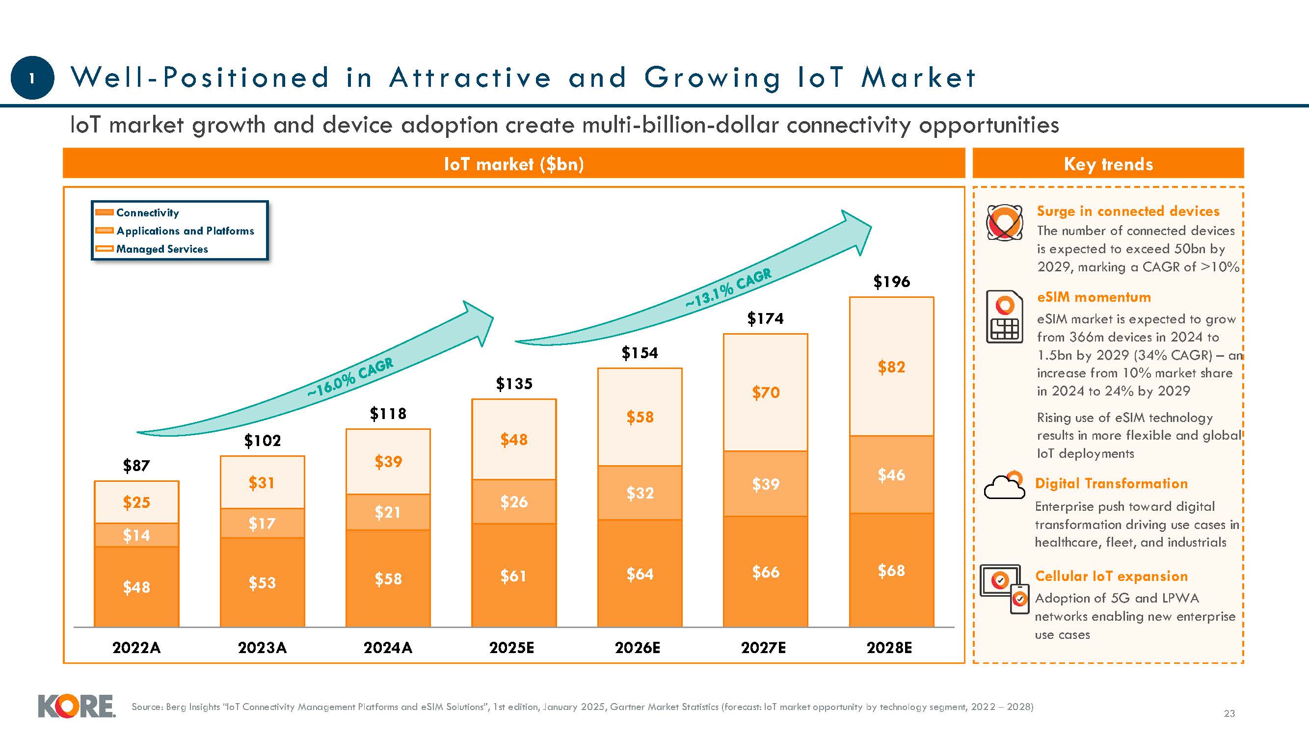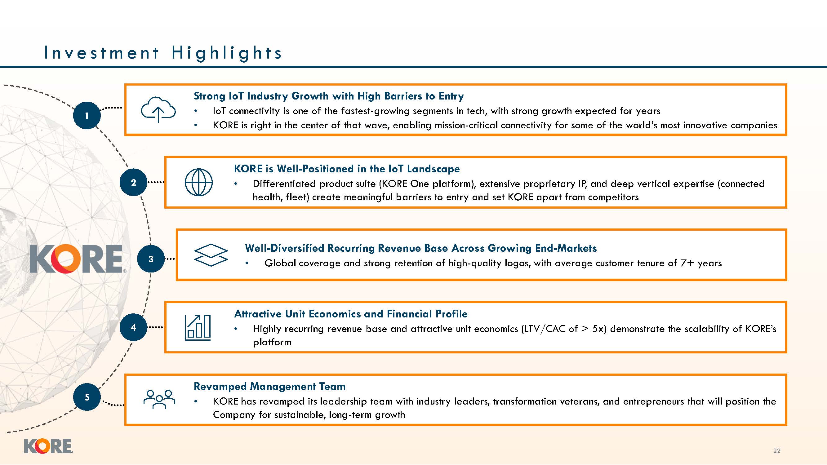 I n v e s t m e n t H i g h l i g h t s  Strong IoT Industry Growth with High Barriers to Entry  IoT connectivity is one of the fastest-growing segments in tech, with strong growth expected for years  KORE is right in the center of that wave, enabling mission-critical connectivity for some of the world’s most innovative companies  KORE is Well-Positioned in the IoT Landscape  Differentiated product suite (KORE One platform), extensive proprietary IP, and deep vertical expertise (connected health, fleet) create meaningful barriers to entry and set KORE apart from competitors  Well-Diversified Recurring Revenue Base Across Growing End-Markets  Global coverage and strong retention of high-quality logos, with average customer tenure of 7+ years  Attractive Unit Economics and Financial Profile  Highly recurring revenue base and attractive unit economics (LTV/CAC of > x) demonstrate the scalability of KORE’s  platform  Revamped Management Team  KORE has revamped its leadership team with industry leaders, transformation veterans, and entrepreneurs that will position the Company for sustainable, long-term growth  2  5  1  3  4  22