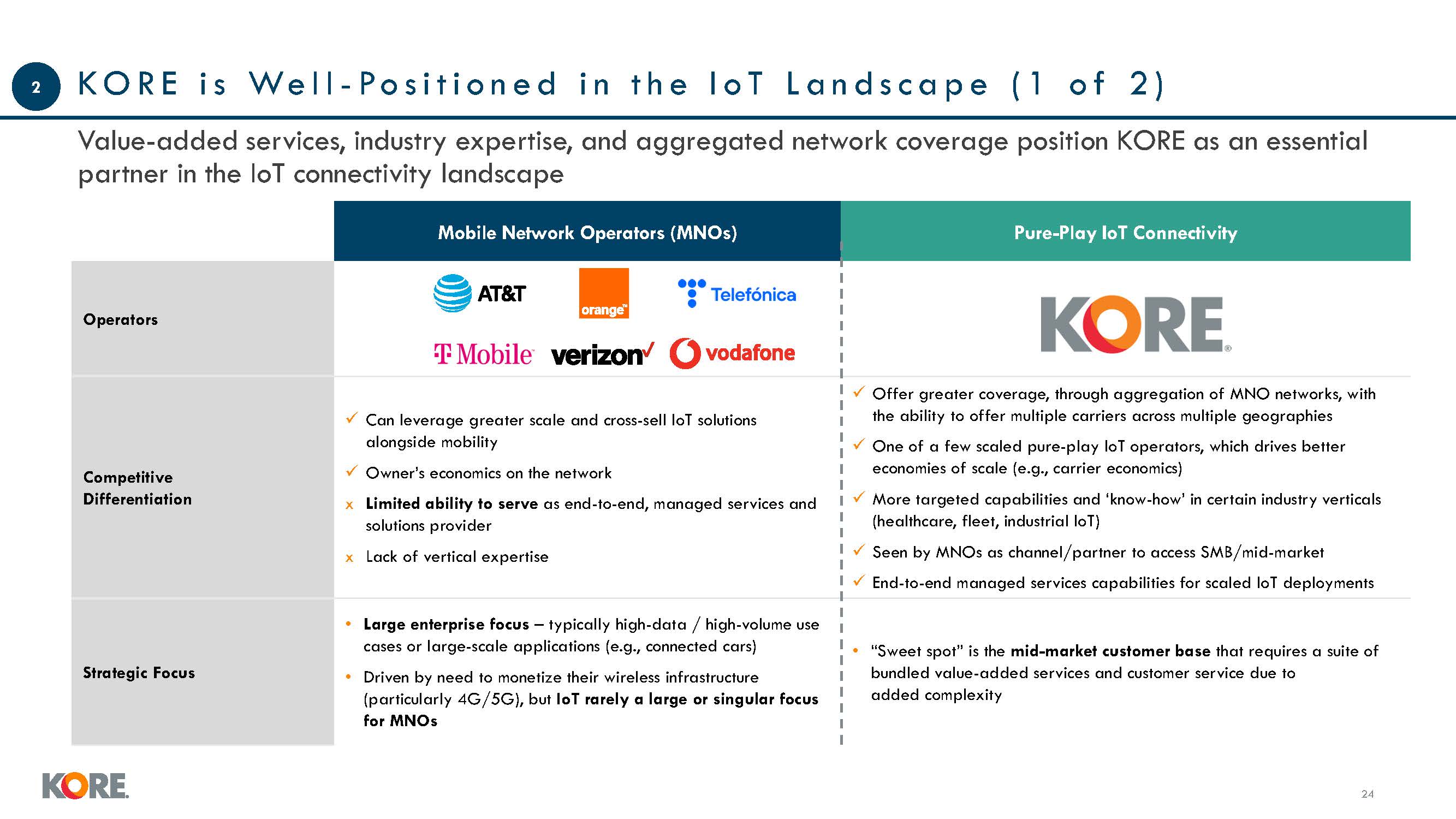 K O R E i s We l l - Po s i t i o n e d i n t h e I o T L a n d s c a p e ( 1 o f 2 )  Mobile Network Operators (MNOs)  Pure-Play IoT Connectivity  Operators  Competitive Differentiation  Can leverage greater scale and cross-sell IoT solutions  alongside mobility  Owner’s economics on the network  x Limited ability to serve as end-to-end, managed services and solutions provider  x Lack of vertical expertise  Offer greater coverage, through aggregation of MNO networks, with the ability to offer multiple carriers across multiple geographies  One of a few scaled pure-play IoT operators, which drives better  economies of scale (e.g., carrier economics)  More targeted capabilities and ‘know-how’ in certain industry verticals  (healthcare, fleet, industrial IoT)  Seen by MNOs as channel/partner to access SMB/mid-market  End-to-end managed services capabilities for scaled IoT deployments  Strategic Focus  Large enterprise focus – typically high-data / high-volume use  cases or large-scale applications (e.g., connected cars)   Driven by need to monetize their wireless infrastructure (particularly 4G/5G), but IoT rarely a large or singular focus for MNOs   “Sweet spot” is the mid-market customer base that requires a suite of bundled value-added services and customer service due to  added complexity  2  24  Value-added services, industry expertise, and aggregated network coverage position KORE as an essential partner in the IoT connectivity landscape