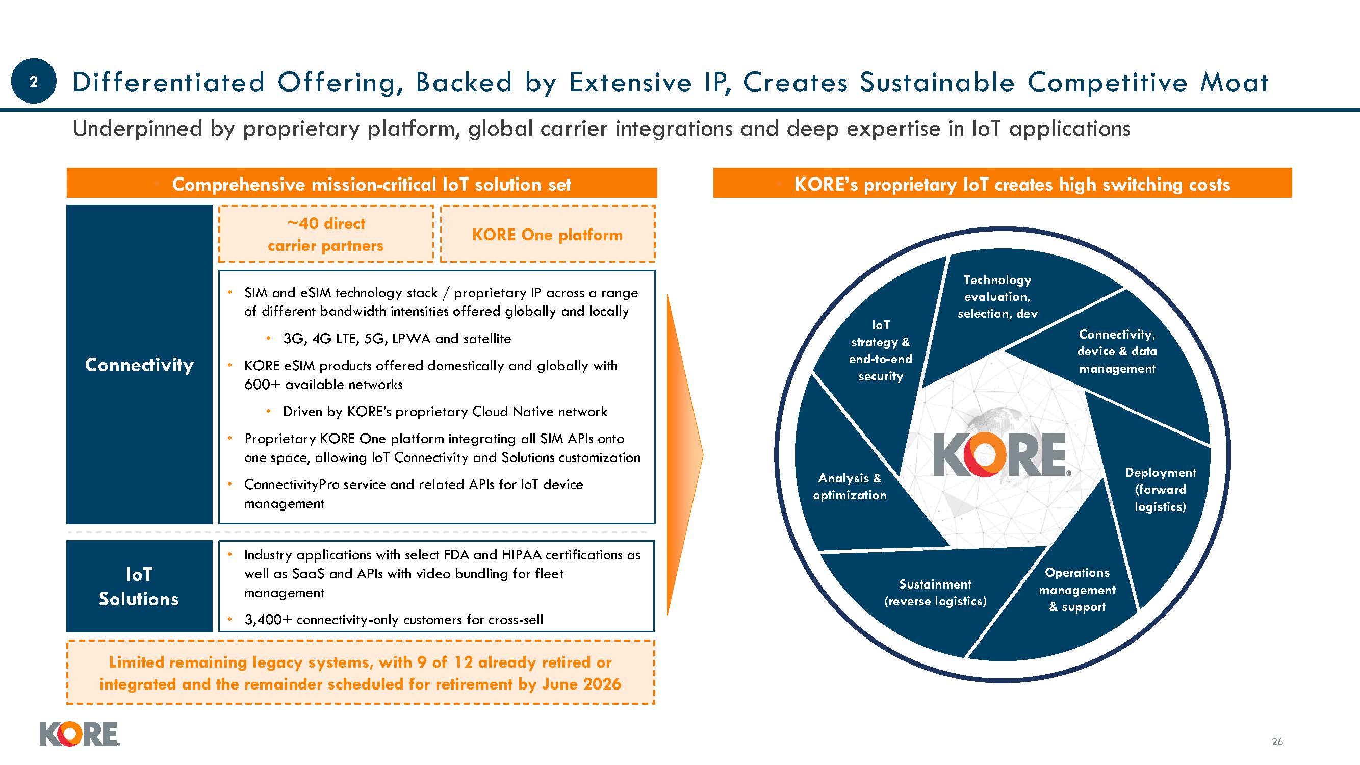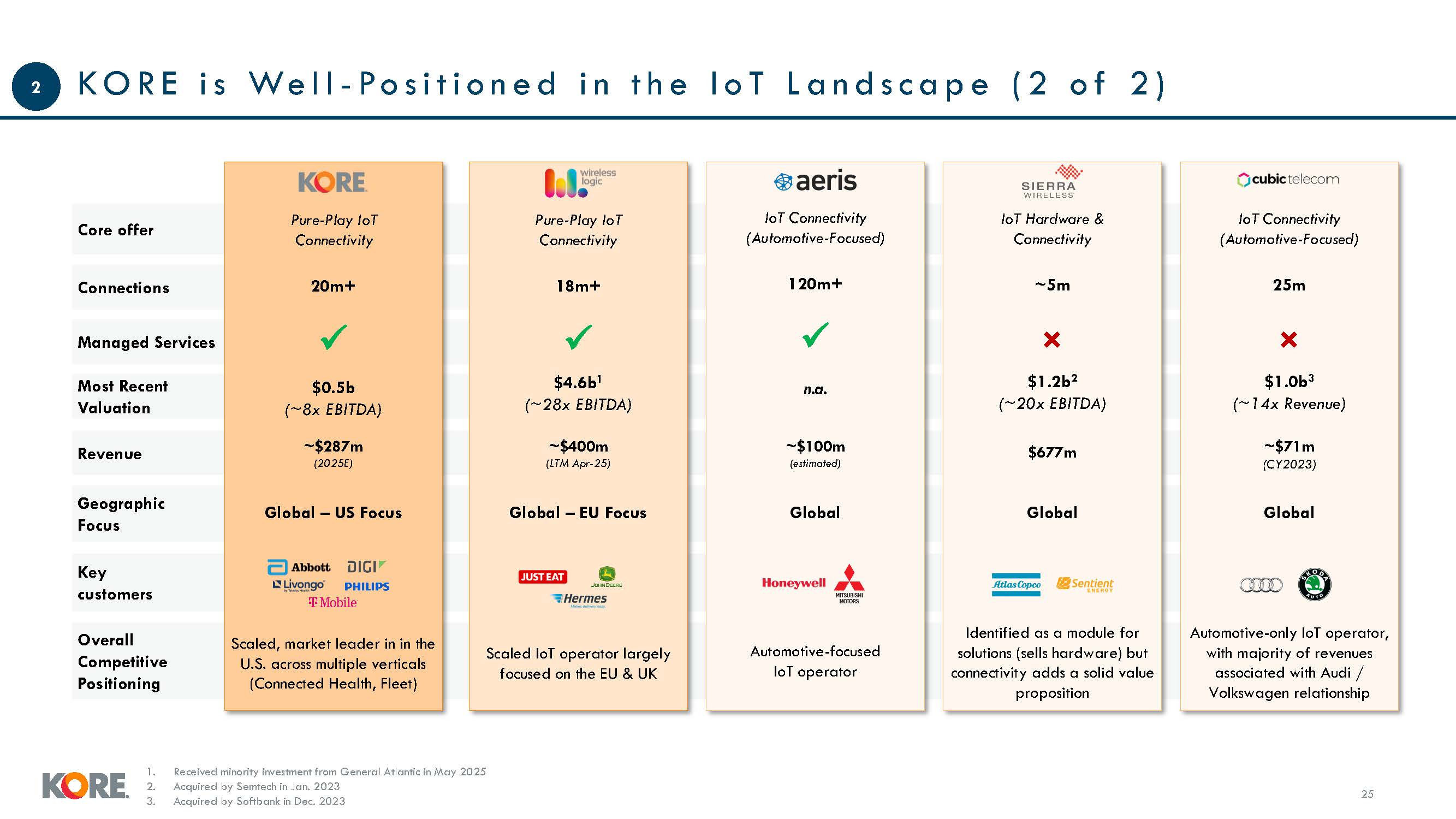 Managed Services  Overall Competitive Positioning  Most Recent Valuation  K O R E i s We l l - Po s i t i o n e d i n t h e I o T L a n d s c a p e ( 2 o f 2 )  25  2  Revenue  Key customers  Geographic Focus  Connections  Core offer  Pure-Play IoT Connectivity  18m+    $4.6b1  (~28x EBITDA)  ~$400m  (LTM Apr-25)  Global – EU Focus  Scaled IoT operator largely focused on the EU & UK  IoT Connectivity (Automotive-Focused)  120m+    n.a.  ~$100m  (estimated)  Global  Automotive-focused IoT operator  IoT Hardware & Connectivity  ~5m  ×  $1.2b2  (~20x EBITDA)  $677m  Global  Identified as a module for solutions (sells hardware) but connectivity adds a solid value proposition  IoT Connectivity (Automotive-Focused)  25m  ×  $1.0b3  (~14x Revenue)  ~$71m  (CY2023)  Global  Automotive-only IoT operator, with majority of revenues associated with Audi / Volkswagen relationship  Pure-Play IoT Connectivity  20m+    $0.5b  (~8x EBITDA)  ~$287m  (2025E)  Global – US Focus  Scaled, market leader in in the  U.S. across multiple verticals (Connected Health, Fleet)  Received minority investment from General Atlantic in May 2025  Acquired by Semtech in Jan. 2023  Acquired by Softbank in Dec. 2023