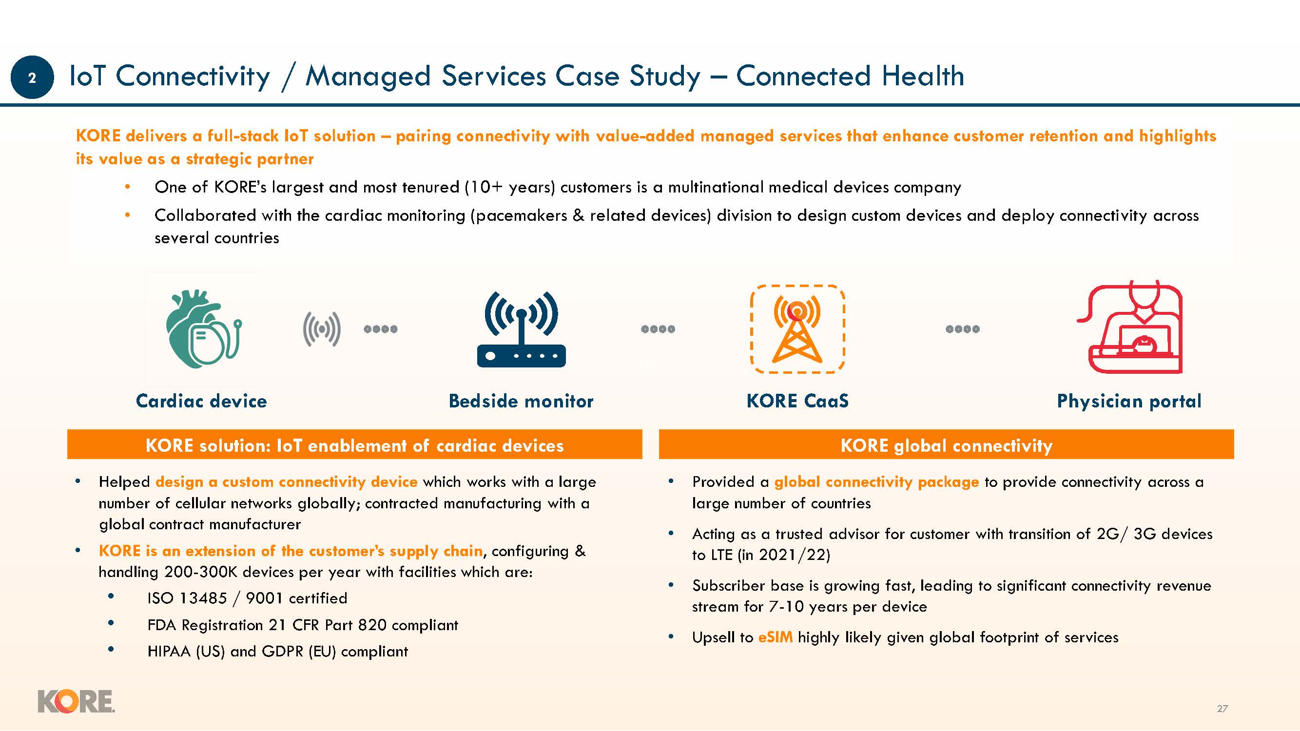 U.S.  IoT Connectivity / Managed Services Case Study – Connected Health  KORE global connectivity  Provided a global connectivity package to provide connectivity across a large number of countries  Acting as a trusted advisor for customer with transition of 2G/ 3G devices  to LTE (in 2021/22)  Subscriber base is growing fast, leading to significant connectivity revenue stream for 7-10 years per device  Upsell to eSIM highly likely given global footprint of services  KORE solution: IoT enablement of cardiac devices  Helped design a custom connectivity device which works with a large number of cellular networks globally; contracted manufacturing with a global contract manufacturer  KORE is an extension of the customer’s supply chain, configuring & handling 200-300K devices per year with facilities which are:  ISO 13485 / 9001 certified  FDA Registration 21 CFR Part 820 compliant  HIPAA (US) and GDPR (EU) compliant  KORE CaaS Physician portal  Cardiac device Bedside monitor  KORE delivers a full-stack IoT solution – pairing connectivity with value-added managed services that enhance customer retention and highlights its value as a strategic partner  One of KORE’s largest and most tenured (10+ years) customers is a multinational medical devices company  Collaborated with the cardiac monitoring (pacemakers & related devices) division to design custom devices and deploy connectivity across several countries  2  26
