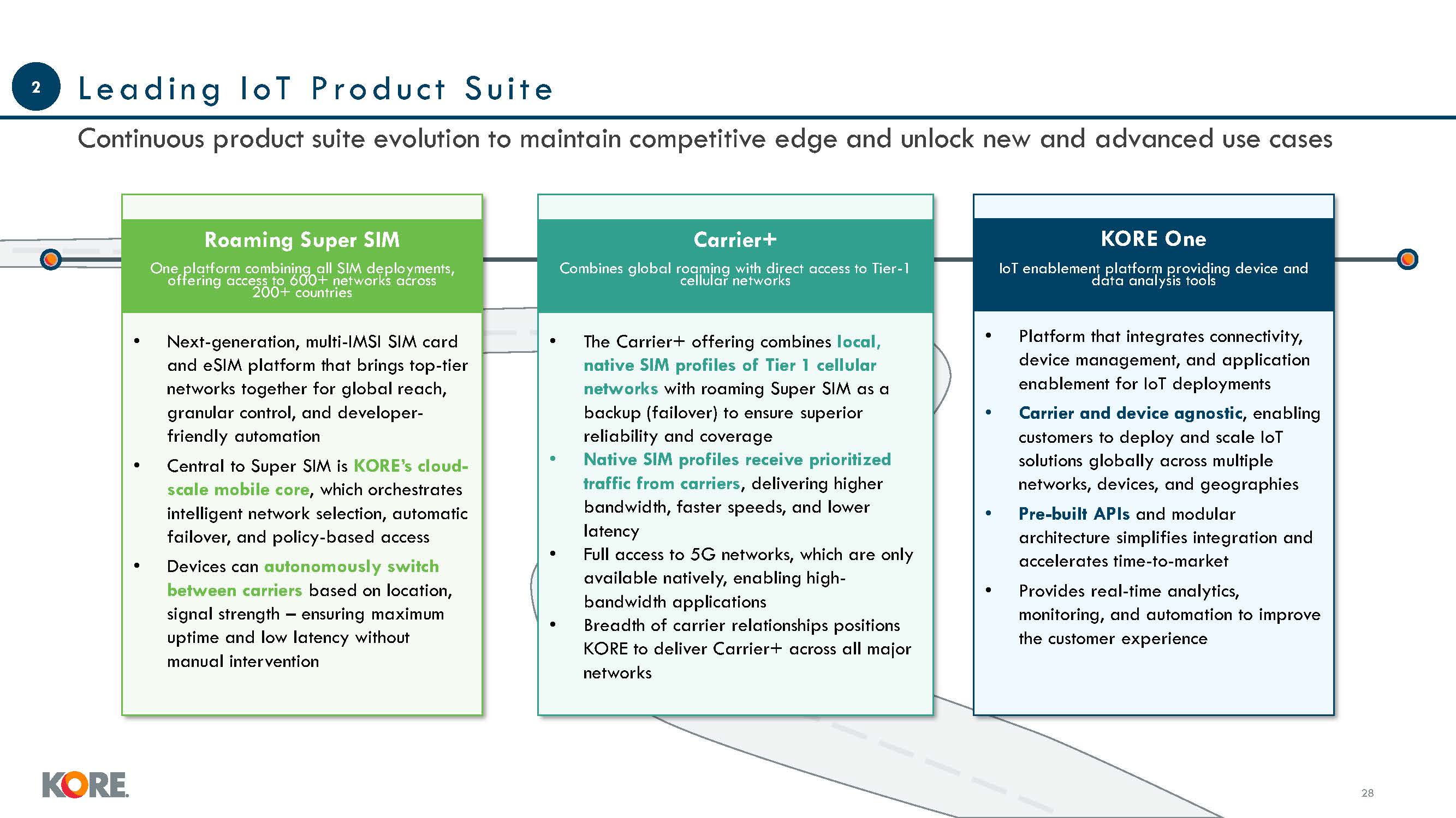 Leadin g I o T Produ c t Su i t e  Continuous product suite evolution to maintain competitive edge and unlock new and advanced use cases  Platform that integrates connectivity, device management, and application enablement for IoT deployments  Carrier and device agnostic, enabling customers to deploy and scale IoT solutions globally across multiple networks, devices, and geographies  Pre-built APIs and modular architecture simplifies integration and accelerates time-to-market  Provides real-time analytics, monitoring, and automation to improve the customer experience  KORE One  IoT enablement platform providing device and  data analysis tools  Next-generation, multi-IMSI SIM card and eSIM platform that brings top-tier networks together for global reach, granular control, and developer-friendly automation  Central to Super SIM is KORE’s cloud-scale mobile core, which orchestrates intelligent network selection, automatic failover, and policy-based access  Devices can autonomously switch between carriers based on location, signal strength – ensuring maximum uptime and low latency without manual intervention  Roaming Super SIM  One platform combining all SIM deployments,  offering access to 600+ networks across  200+ countries  The Carrier+ offering combines local, native SIM profiles of Tier 1 cellular networks with roaming Super SIM as a backup (failover) to ensure superior reliability and coverage  Native SIM profiles receive prioritized traffic from carriers, delivering higher bandwidth, faster speeds, and lower latency  Full access to 5G networks, which are only available natively, enabling high-bandwidth applications  Breadth of carrier relationships positions KORE to deliver Carrier+ across all major networks  Carrier+  Combines global roaming with direct access to Tier-1  cellular networks  2  26