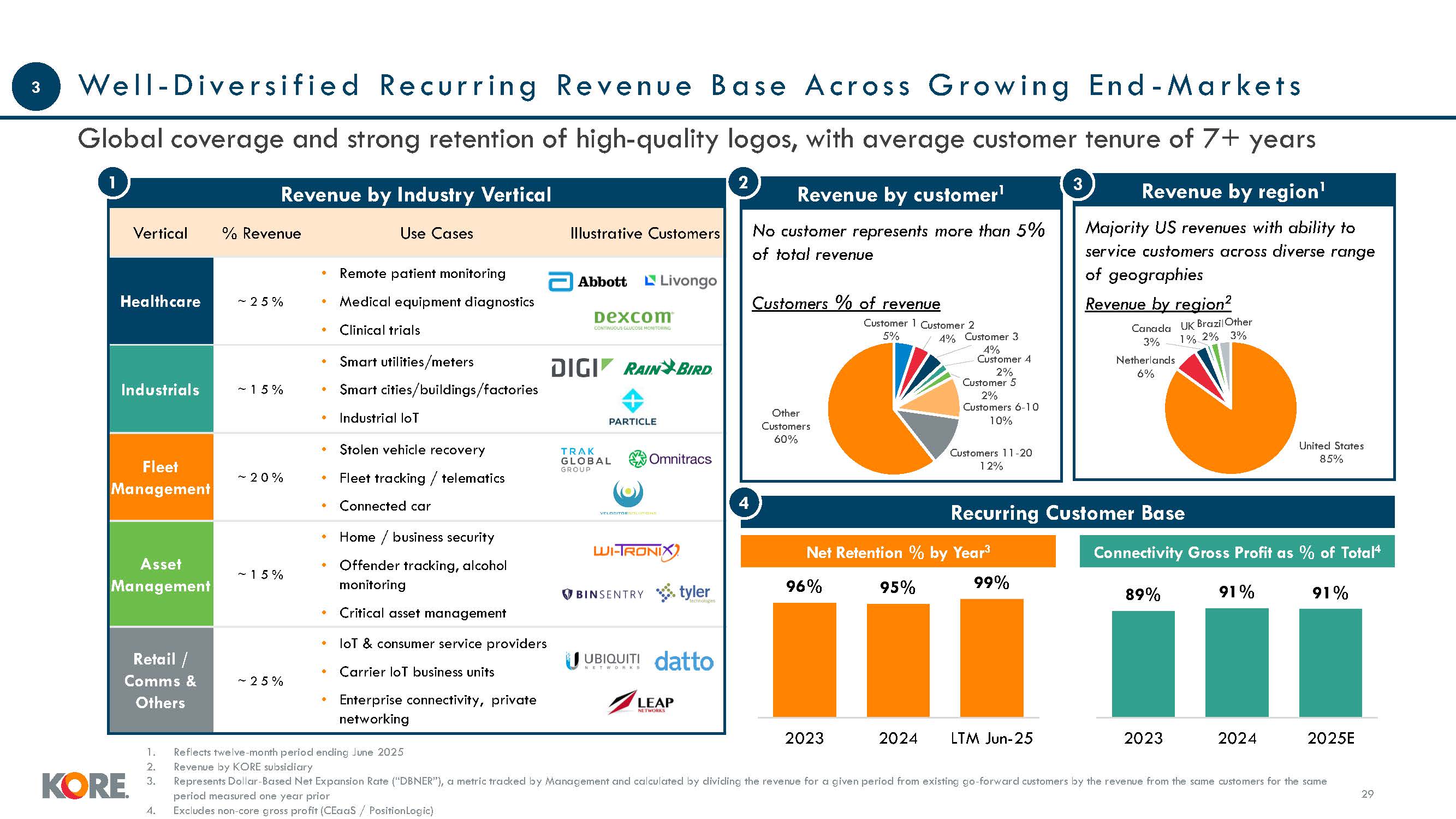 We l l - D i ve r s i f i e d Re c u r r i n g Re ve n u e B a s e A c ro s s G row i n g E n d - M a r ke t s  Global coverage and strong retention of high-quality logos, with average customer tenure of 7+ years  29  Revenue by customer1  2  Revenue by region1  3  Reflects twelve-month period ending June 2025  Revenue by KORE subsidiary  Represents Dollar- ased et Expansion Rate (“D ER”), a metric tracked by Management and calculated by dividing the revenue for a given period from existing go-forward customers by the revenue from the same customers for the same period measured one year prior  Excludes non-core gross profit (CEaaS / PositionLogic)  Recurring Customer Base  4  Net Retention % by Year3  1  Revenue by Industry Vertical  Vertical  % Revenue  Use Cases  Illustrative Customers  Healthcare  ~ 2 5 %  Remote patient monitoring  Medical equipment diagnostics  Clinical trials  Industrials  ~ 1 5 %  Smart utilities/meters  Smart cities/buildings/factories  Industrial IoT  Fleet Management  ~ 2 0 %  Stolen vehicle recovery  Fleet tracking / telematics  Connected car  Asset Management  ~ 1 5 %  Home / business security  Offender tracking, alcohol monitoring  Critical asset management  Retail / Comms & Others  ~ 2 5 %  IoT & consumer service providers  Carrier IoT business units  Enterprise connectivity, private networking  No customer represents more than 5% of total revenue  Customers % of revenue  Customer 1 Customer 2  5%  4%  4% Customer 3  Customer 4  2%  Customer 5  2%  Customers 6-10  10%  Customers 11-20  12%  Other Customers 60%  United States 85%  3%  Netherlands 6%  Majority US revenues with ability to service customers across diverse range of geographies  Revenue by region2  Canada UK BrazilOther  1% 2% 3%  96% 95%  99%  2023 2024 LTM Jun-25 2023 2024 2025E  Connectivity Gross Profit as % of Total4  89%  91% 91%  3