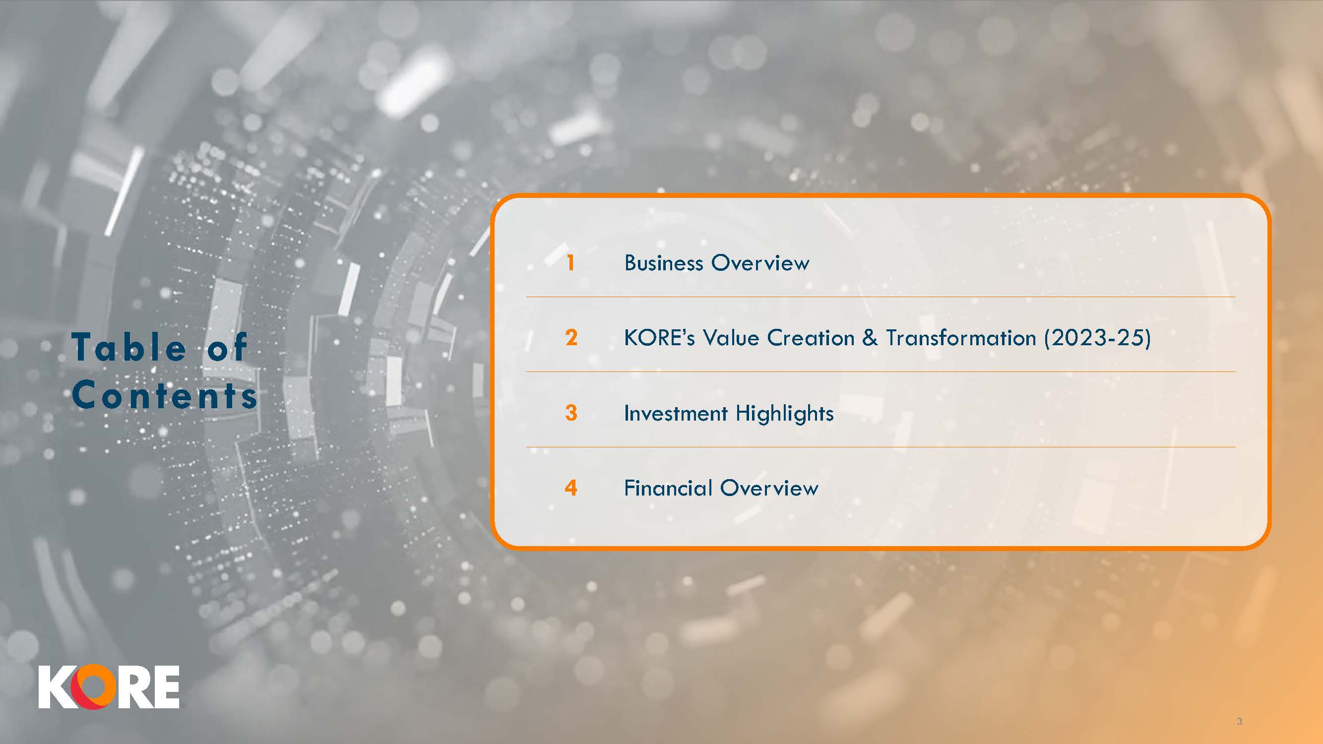 Table of Contents  1 Business Overview  2  2 KORE’s Value Creation & Transformation (2023-25)  3 Investment Highlights  4 Financial Overview