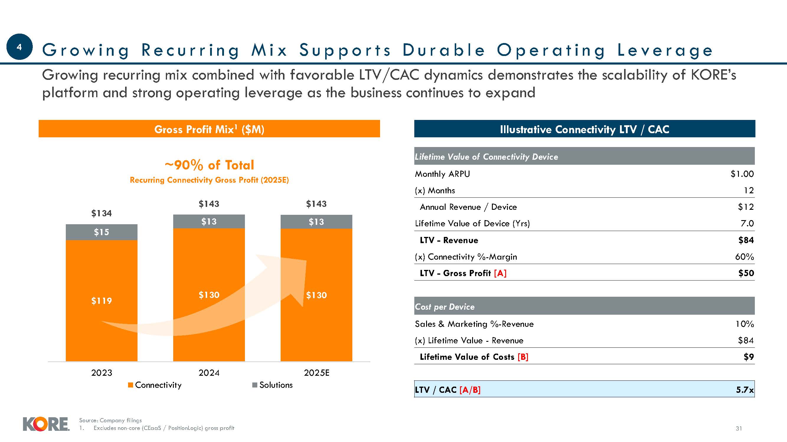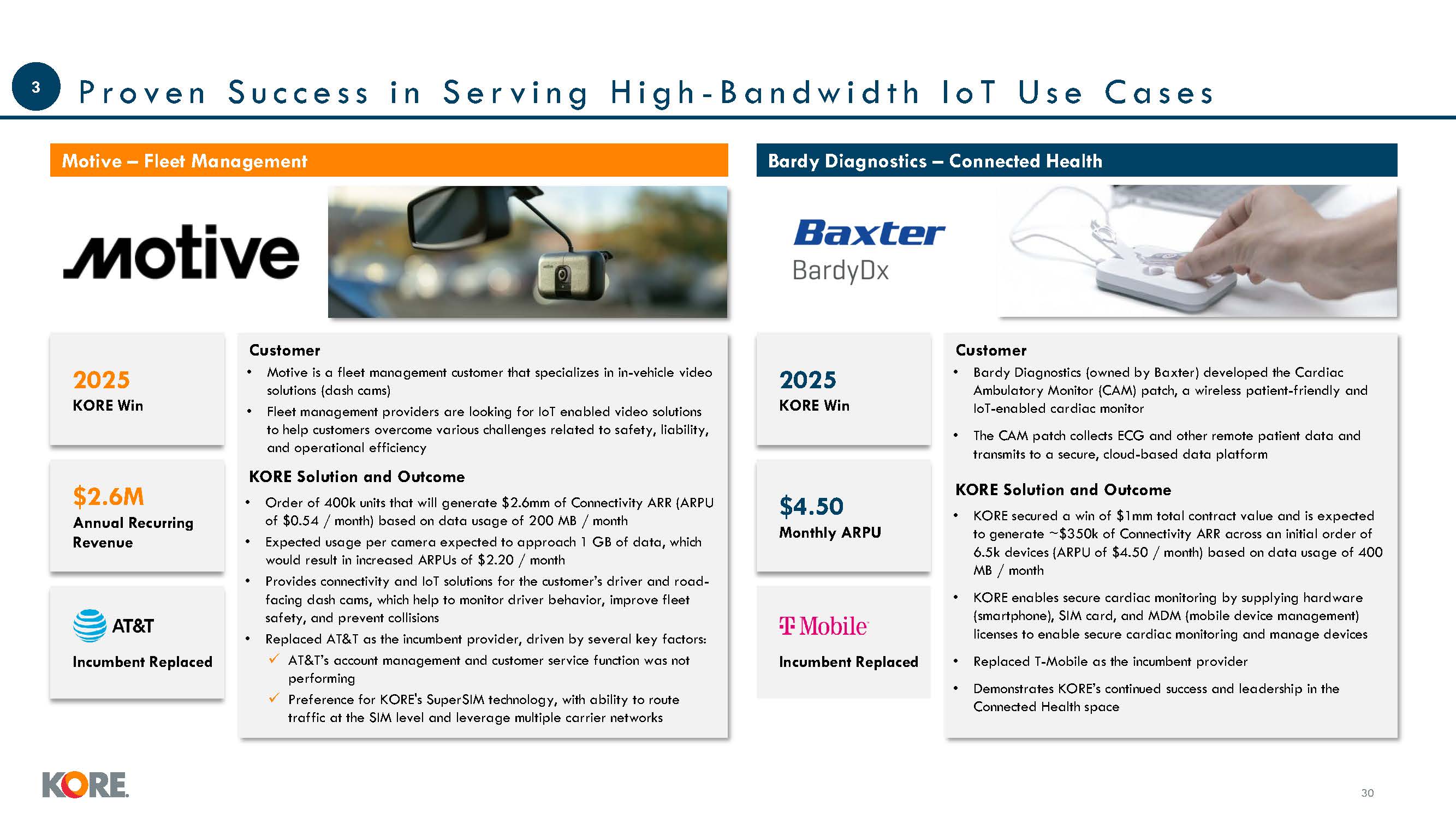 P r o v e n S u c c e s s i n S e r v i n g H i g h - B a n d w i d t h I o T U s e C a s e s  30  Motive – Fleet Management  Bardy Diagnostics – Connected Health  2025  KORE Win  $2.6M  Annual Recurring  Revenue  Incumbent Replaced  Customer  Motive is a fleet management customer that specializes in in-vehicle video solutions (dash cams)  Fleet management providers are looking for IoT enabled video solutions to help customers overcome various challenges related to safety, liability, and operational efficiency  KORE Solution and Outcome  Order of 400k units that will generate $2.6mm of Connectivity ARR (ARPU of $0.54 / month) based on data usage of 200 MB / month  Expected usage per camera expected to approach 1 GB of data, which would result in increased ARPUs of $2.20 / month  Provides connectivity and IoT solutions for the customer’s driver and road-facing dash cams, which help to monitor driver behavior, improve fleet safety, and prevent collisions  Replaced AT&T as the incumbent provider, driven by several key factors:  AT&T’s account management and customer service function was not  performing  Preference for KORE's SuperSIM technology, with ability to route traffic at the SIM level and leverage multiple carrier networks  3  2025  KORE Win  $4.50  Monthly ARPU  Customer  Bardy Diagnostics (owned by Baxter) developed the Cardiac Ambulatory Monitor (CAM) patch, a wireless patient-friendly and IoT-enabled cardiac monitor  The CAM patch collects ECG and other remote patient data and transmits to a secure, cloud-based data platform  KORE Solution and Outcome  KORE secured a win of $1mm total contract value and is expected  to generate ~$350k of Connectivity ARR across an initial order of  6.5k devices (ARPU of $4.50 / month) based on data usage of 400 MB / month  KORE enables secure cardiac monitoring by supplying hardware (smartphone), SIM card, and MDM (mobile device management) licenses to enable secure cardiac monitoring and manage devices  Replaced T-Mobile as the incumbent provider  Demonstrates KORE’s continued success and leadership in the  Connected Health space  Incumbent Replaced