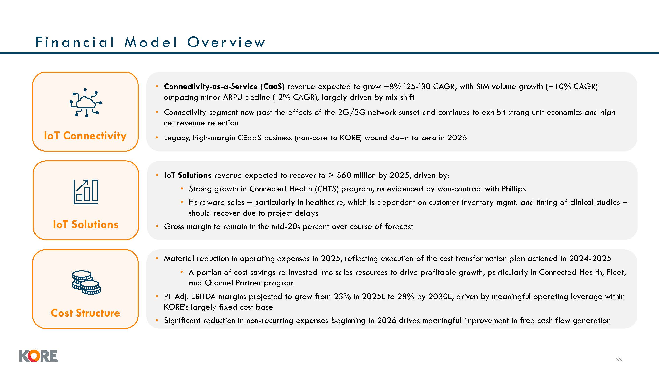 F i n a n c i a l M o d e l Over v i ew  33  Connectivity-as-a-Service (CaaS) revenue expected to grow +8% ’2 -’30 CAGR, with SIM volume growth (+10% CAGR)  outpacing minor ARPU decline (-2% CAGR), largely driven by mix shift  Connectivity segment now past the effects of the 2G/3G network sunset and continues to exhibit strong unit economics and high  net revenue retention  Legacy, high-margin CEaaS business (non-core to KORE) wound down to zero in 2026  IoT Connectivity  IoT Solutions revenue expected to recover to > $60 million by 2025, driven by:  Strong growth in Connected Health (CHTS) program, as evidenced by won-contract with Phillips  Hardware sales – particularly in healthcare, which is dependent on customer inventory mgmt. and timing of clinical studies –  should recover due to project delays  Gross margin to remain in the mid-20s percent over course of forecast  IoT Solutions  Material reduction in operating expenses in 2025, reflecting execution of the cost transformation plan actioned in 2024-2025  A portion of cost savings re-invested into sales resources to drive profitable growth, particularly in Connected Health, Fleet, and Channel Partner program  PF Adj. EBITDA margins projected to grow from 23% in 2025E to 28% by 2030E, driven by meaningful operating leverage within  KORE’s largely fixed cost base  Significant reduction in non-recurring expenses beginning in 2026 drives meaningful improvement in free cash flow generation  Cost Structure