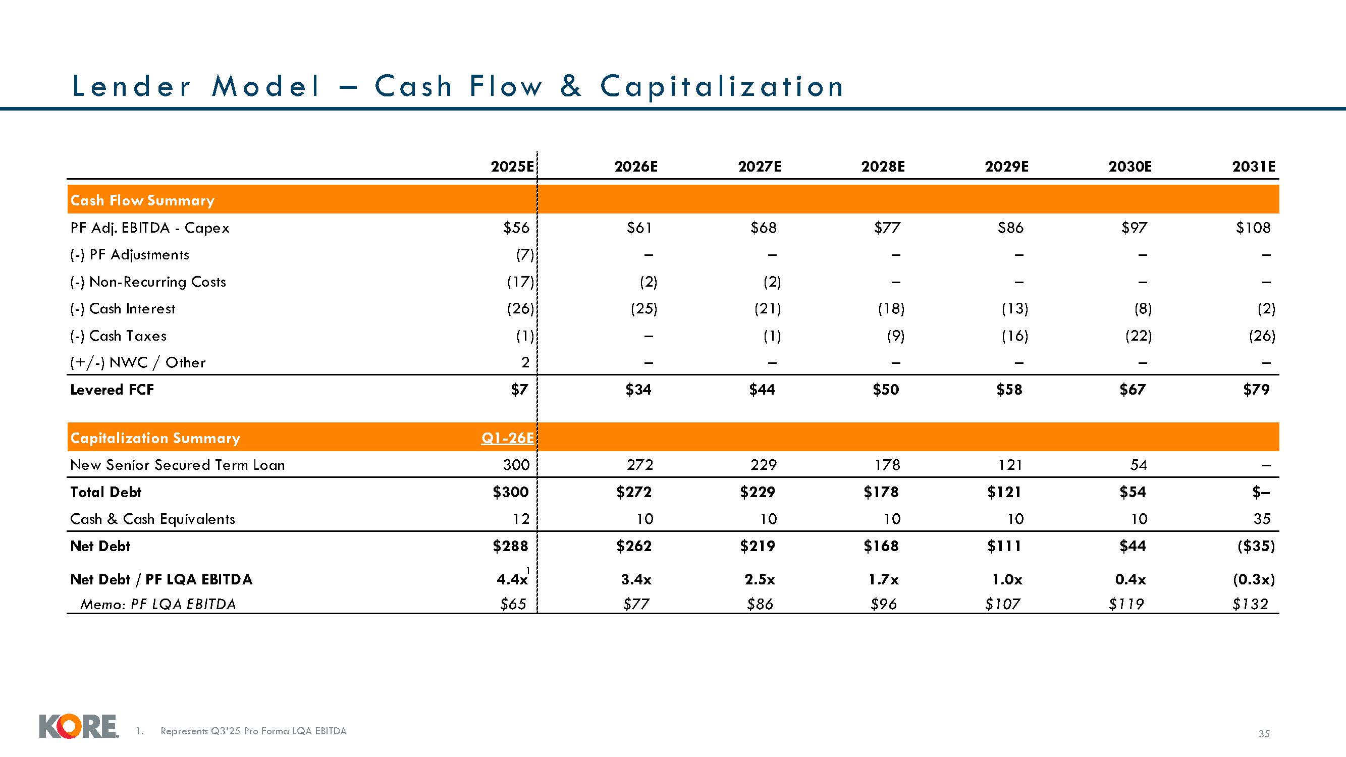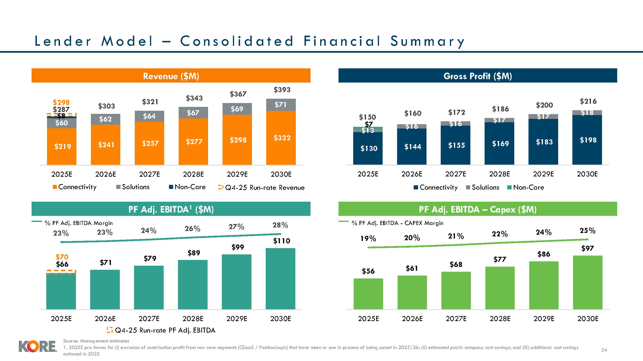 L e n d e r M o d e l – C o n s o l i d a t e d F i n a n c i a l S u m m a r y  34  Revenue ($M)  Gross Profit ($M)  PF Adj. EBITDA1 ($M)  PF Adj. EBITDA – Capex ($M)  $219  $241  $257  $277  $298  $322  $62  $64  $67  $69  $71  $8  $60  $303  $321  $343  $367  $393  2025E 2026E  Connectivity  2027E  Solutions  2028E  Non-Core  $298  $287  2029E 2030E  Q4-25 Run-rate Revenue  $71  $79  $89  $99  23%  23%  24%  28%  $110  26%  27%  2025E 2026E 2027E 2028E 2029E 2030E 2025E 2026E 2027E 2028E 2029E  $56  $61  $68  $77  $86  $97  19%  20%  21%  22%  24%  25%  2030E  $130  $144  $155  $169  $183  $198  $13  $16  $16  $17  $17  $7  $150  $160  $172  $186  $216  $18  $200  2025E  2026E  2027E  2028E  Solutions  2030E  Connectivity  2029E  Non-Core  % PF Adj. EBITDA Margin  $70  $66  % PF Adj. EBITDA - CAPEX Margin  Q4-25 Run-rate PF Adj. EBITDA  Source: Management estimates  1. 2025E pro forma for (i) exclusion of contribution profit from non-core segments (CEaaS / PositionLogic) that have been or are in-process of being sunset in 2025/26; (ii) estimated public company cost savings; and (iii) additional cost savings actioned in 2025