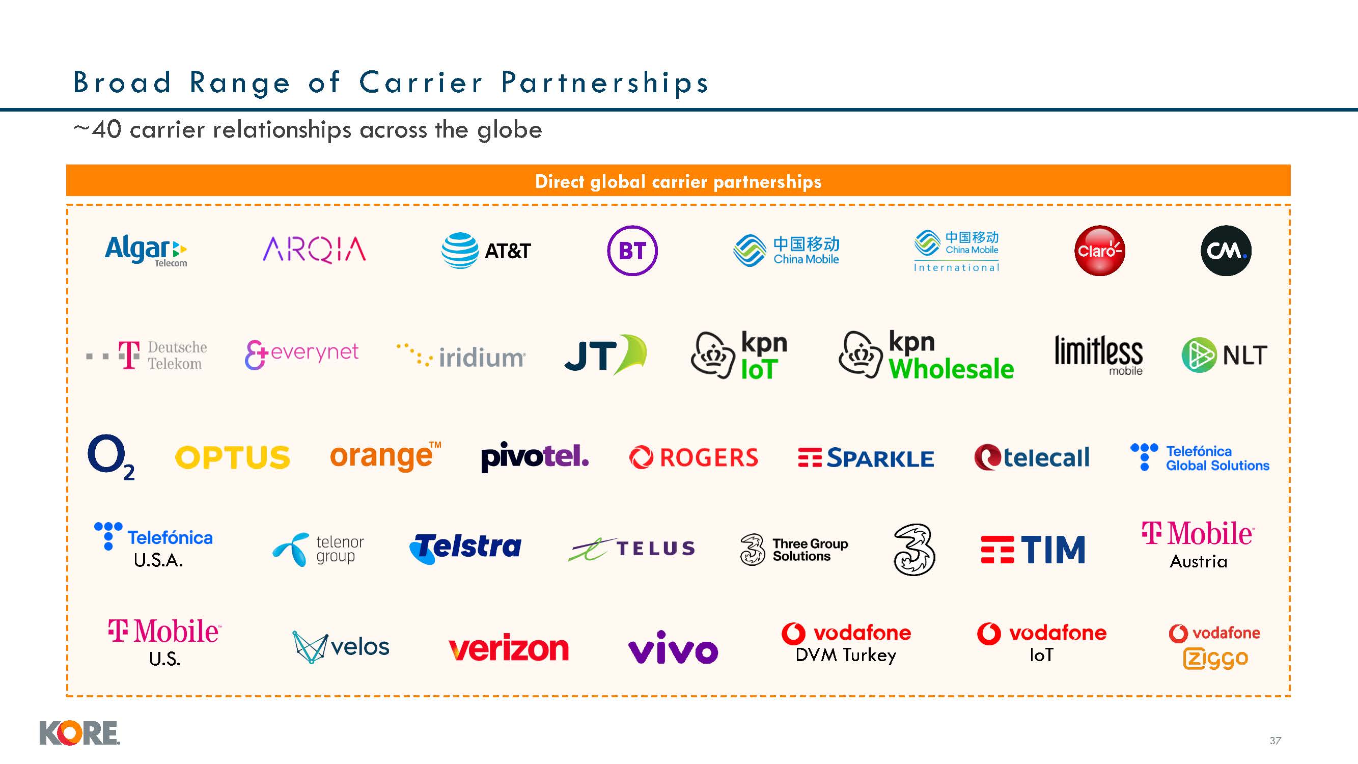 ~40 carrier relationships across the globe  Direct global carrier partnerships  Broad Ran ge of C ar r i er Par t n er s h i ps  U.S.A.  Austria  U.S.  DVM Turkey  IoT  37