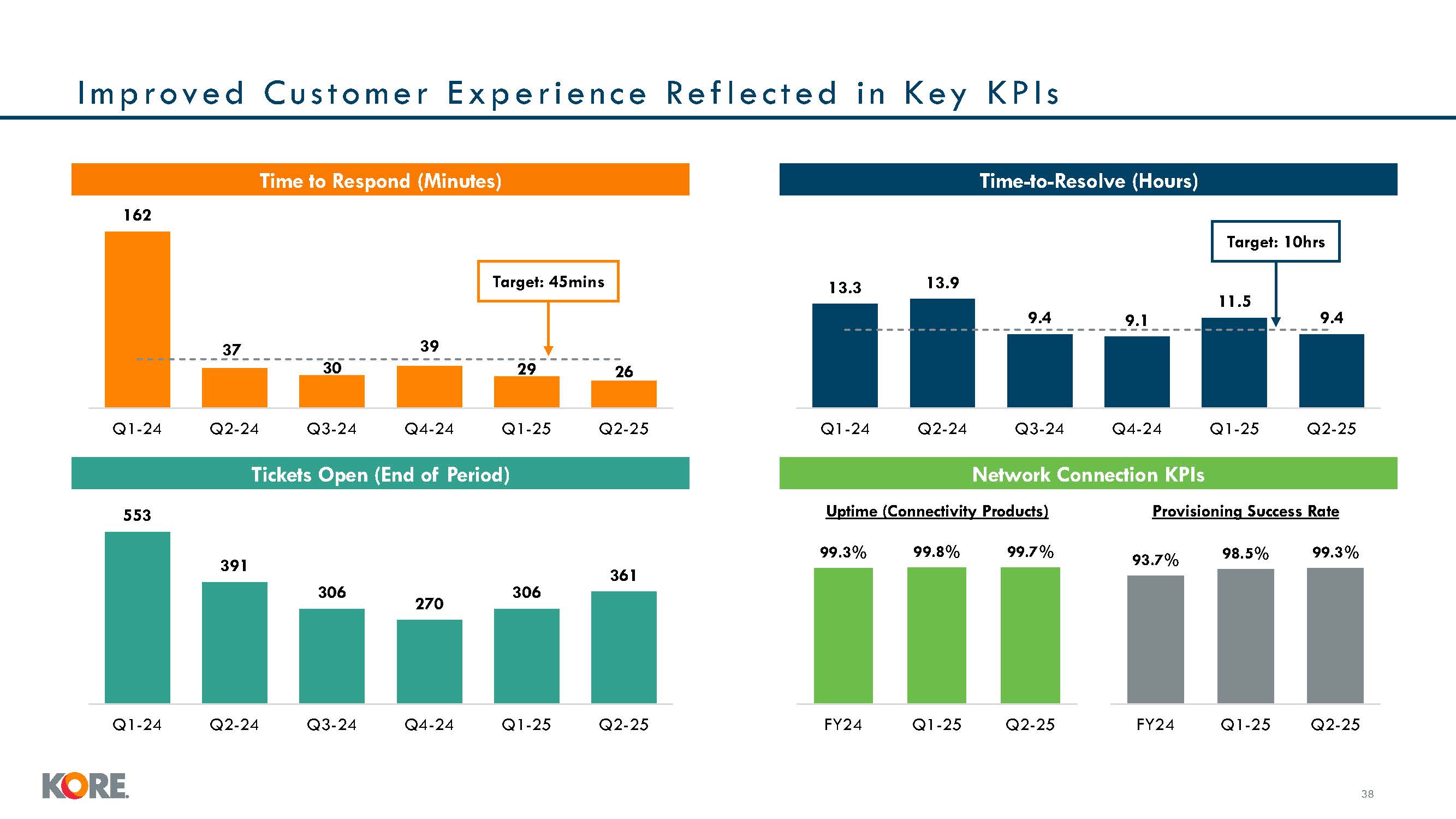 Time to Respond (Minutes)  Time-to-Resolve (Hours)  Tickets Open (End of Period)  Uptime (Connectivity Products) Provisioning Success Rate  162  37  30  39  29  26  Q1-24 Q2-24 Q3-24 Q4-24 Q1-25 Q2-25  13.3  13.9  9.4  9.1  11.5  9.4  Q1-24 Q2-24 Q3-24 Q4-24 Q1-25 Q2-25  553  391  306  270  306  361  Q1-24  Q2-24  Q3-24  Q4-24  Q1-25  Q2-25  99.3% 99.8% 99.7%  FY24  Q1-25  Q2-25  Improved C u s t omer E xper i en ce Ref l ected i n Key KPIs  93.7%  98.5% 99.3%  FY24  Q1-25  Q2-25  Target: 45mins  Target: 10hrs  37  Network Connection KPIs