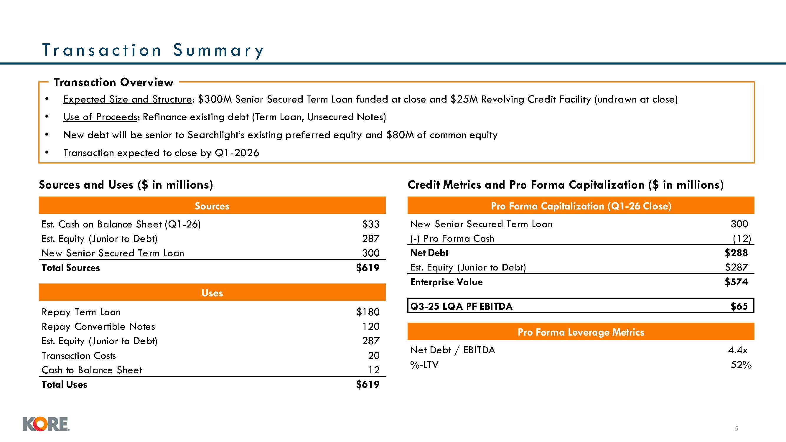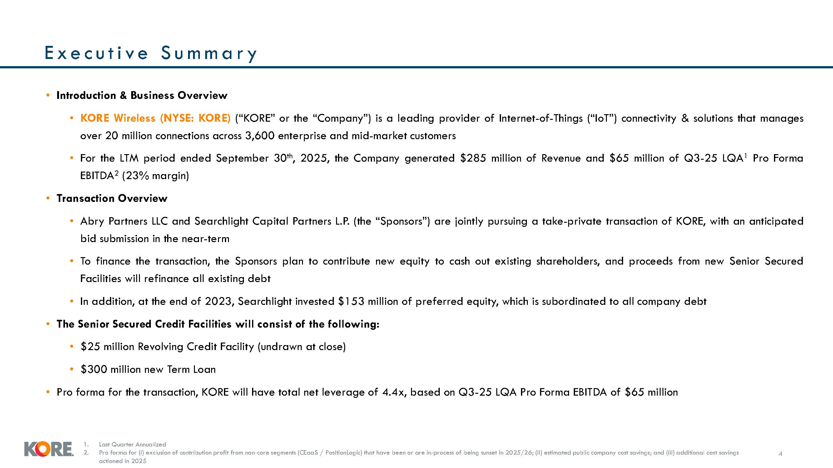 E x e c u t i v e S u m m a r y  4  Introduction & Business Overview  KORE Wireless (NYSE: KORE) (“KORE” or the “Company”) is a leading provider of Internet-of-Things (“IoT”) connectivity & solutions that manages over 20 million connections across 3,600 enterprise and mid-market customers  For the LTM period ended September 30th, 2025, the Company generated $285 million of Revenue and $65 million of Q3-25 LQA1 Pro Forma EBITDA2 (23% margin)  Transaction Overview  Abry Partners LLC and Searchlight Capital Partners L.P. (the “Sponsors”) are jointly pursuing a take-private transaction of KORE, with an anticipated bid submission in the near-term  To finance the transaction, the Sponsors plan to contribute new equity to cash out existing shareholders, and proceeds from new Senior Secured Facilities will refinance all existing debt  In addition, at the end of 2023, Searchlight invested $153 million of preferred equity, which is subordinated to all company debt  The Senior Secured Credit Facilities will consist of the following:  $25 million Revolving Credit Facility (undrawn at close)  $300 million new Term Loan  Pro forma for the transaction, KORE will have total net leverage of 4.4x, based on Q3-25 LQA Pro Forma EBITDA of $65 million  Last Quarter Annualized  Pro forma for (i) exclusion of contribution profit from non-core segments (CEaaS / PositionLogic) that have been or are in-process of being sunset in 2025/26; (ii) estimated public company cost savings; and (iii) additional cost savings actioned in 2025
