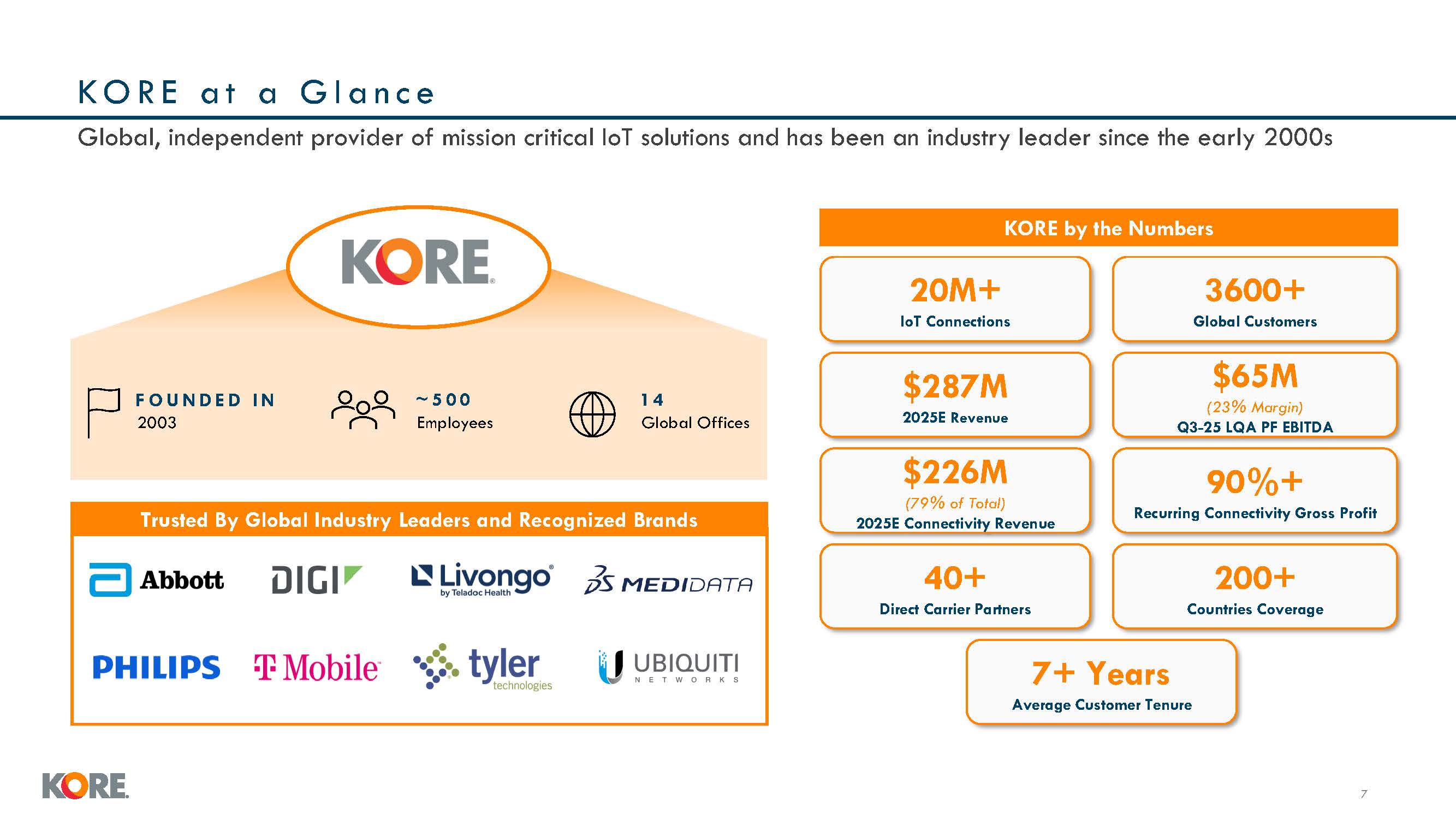 K O R E a t a G l a n c e  Global, independent provider of mission critical IoT solutions and has been an industry leader since the early 2000s  KORE by the Numbers  90%+  Recurring Connectivity Gross Profit  $287M  2025E Revenue  $226M  (79% of Total)  2025E Connectivity Revenue  3600+  Global Customers  20M+  IoT Connections  $65M  (23% Margin)  Q3-25 LQA PF EBITDA  Trusted By Global Industry Leaders and Recognized Brands  F O U N D E D I N  2003  ~ 5 0 0  Employees  14   Global Offices  7+ Years  Average Customer Tenure  200+  Countries Coverage  40+  Direct Carrier Partners  7