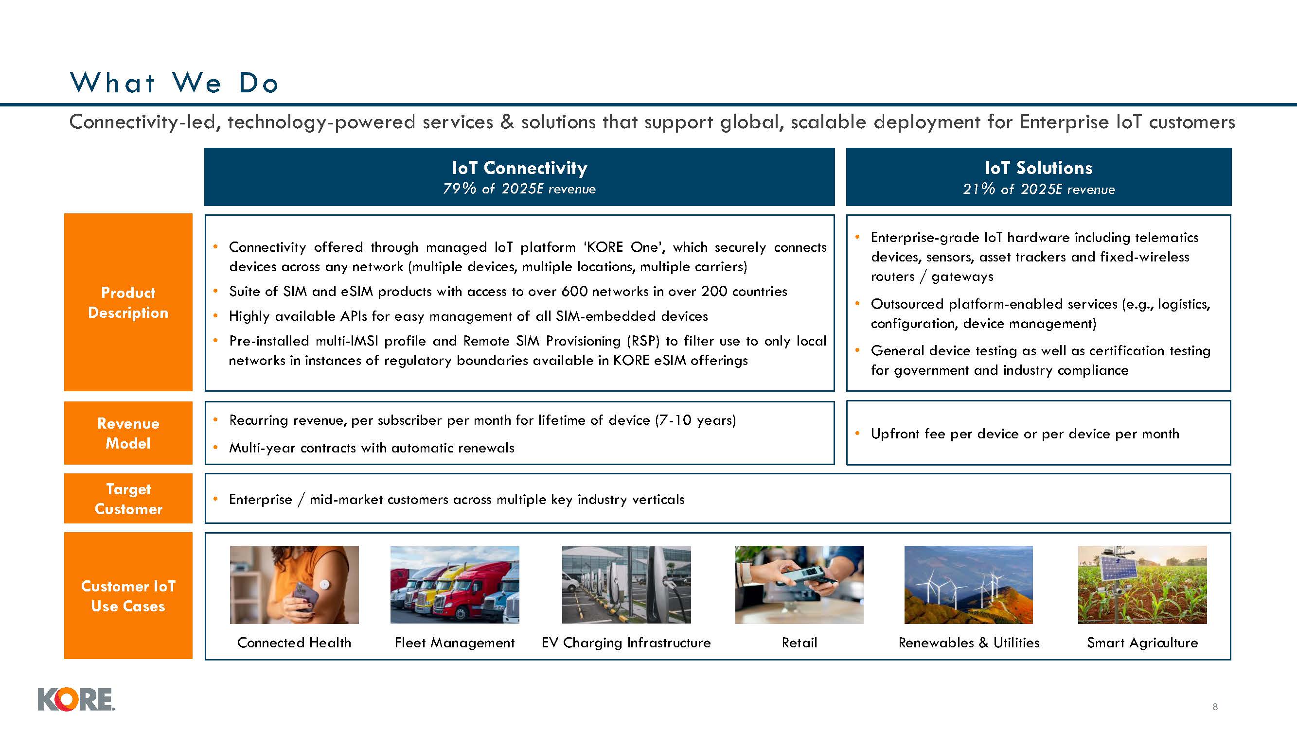Wh at We D o  Connectivity-led, technology-powered services & solutions that support global, scalable deployment for Enterprise IoT customers  IoT Solutions  21% of 2025E revenue  IoT Connectivity  79% of 2025E revenue  Product Description  Connectivity offered through managed IoT platform ‘KORE One’, which securely connects  devices across any network (multiple devices, multiple locations, multiple carriers)  Suite of SIM and eSIM products with access to over 600 networks in over 200 countries  Highly available APIs for easy management of all SIM-embedded devices   Pre-installed multi-IMSI profile and Remote SIM Provisioning (RSP) to filter use to only local networks in instances of regulatory boundaries available in KORE eSIM offerings   Enterprise-grade IoT hardware including telematics devices, sensors, asset trackers and fixed-wireless routers / gateways   Outsourced platform-enabled services (e.g., logistics, configuration, device management)   General device testing as well as certification testing for government and industry compliance  Revenue Model  Recurring revenue, per subscriber per month for lifetime of device (7-10 years)  Multi-year contracts with automatic renewals  Upfront fee per device or per device per month  Target Customer  Enterprise / mid-market customers across multiple key industry verticals  Customer IoT Use Cases  Connected Health Fleet Management EV Charging Infrastructure Retail Renewables & Utilities Smart Agriculture  7