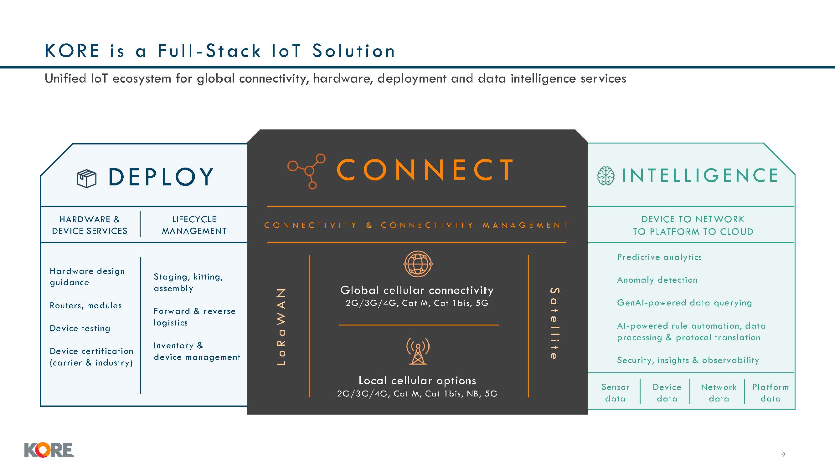 DEVICE TO NETWORK TO PLATFORM TO CLOUD  L o R a W A N  S a t e l l i t e  C O N N E C T I V I T Y & C O N N E C T I V I T Y M A N A G E M E N T  Hardware design guidance  Routers, modules  Device testing  Device certification (carrier & industry)  Staging, kitting, assembly  Forward & reverse logistics  Inventory &  device management  HARDWARE &  DEVICE SERVICES  LIFECYCLE  MANAGEMENT  Predictive analytics  Anomaly detection  GenAI-powered data querying  AI-powered rule automation, data processing & protocol translation  Security, insights & observability  Sensor data  Device data  Platform data  Network data  DEPLOY  I N T E L L I G E N C E  C O N N E C T  Local cellular options  2G/3G/4G, Cat M, Cat 1bis, NB, 5G  Global cellular connectivity  2G/3G/4G, Cat M, Cat 1bis, 5G  KORE i s a F u l l - S tac k I o T Solu t i on  Unified IoT ecosystem for global connectivity, hardware, deployment and data intelligence services  7