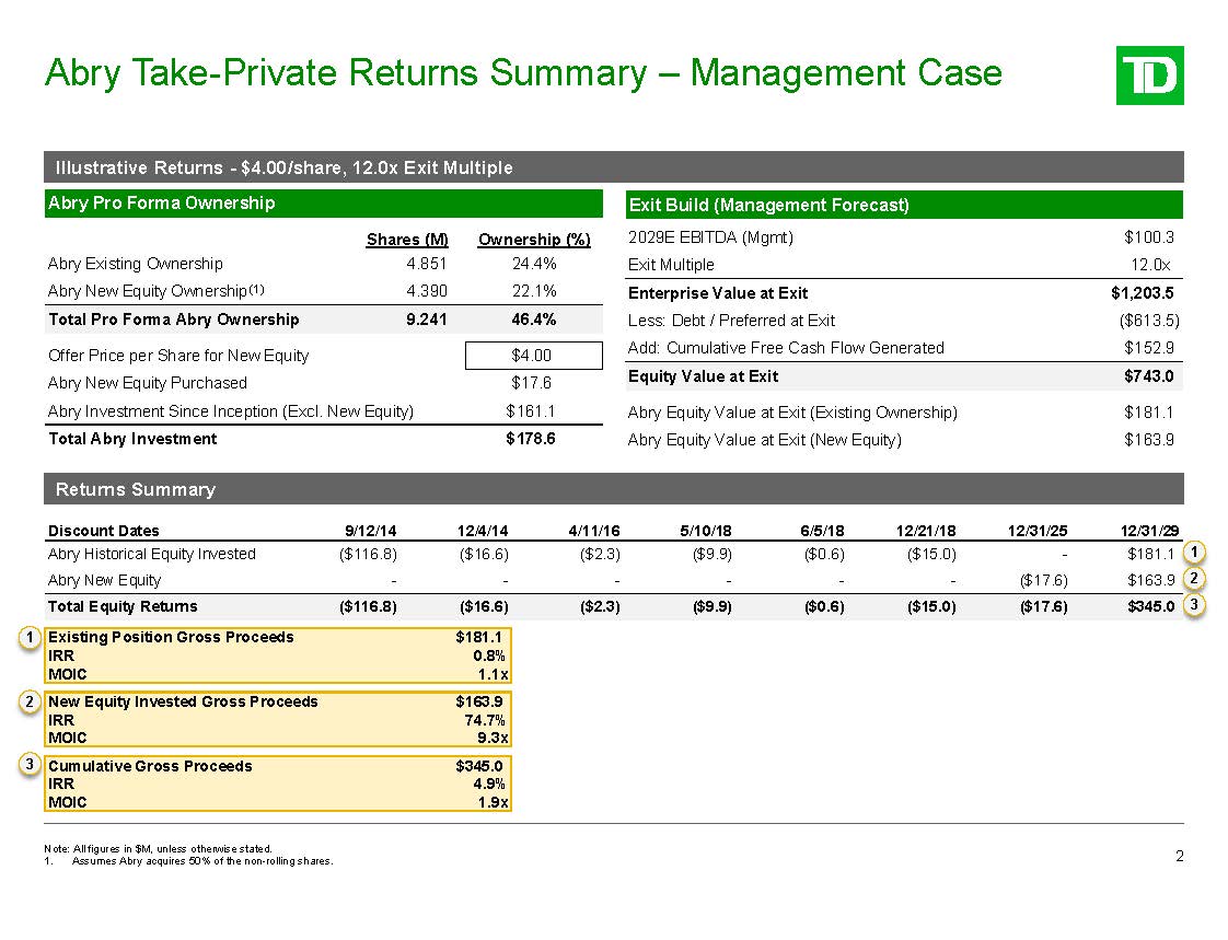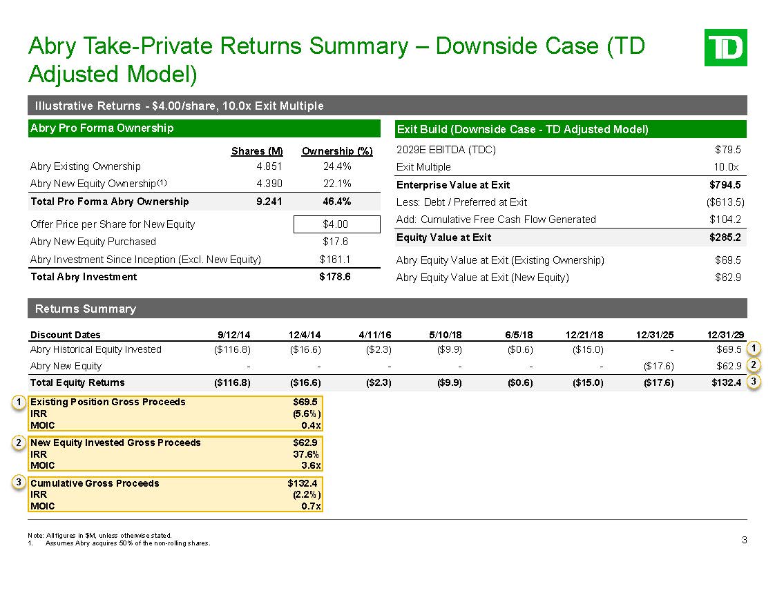 Abry Take-Private Returns Summary – Downside Case (TD  Adjusted Model)  Illustrative Returns - $4.00/share, 10.0x Exit Multiple  Abry Pro Forma Ownership  Exit Build (Downside Case - TD Adjusted Model)  Abry Existing Ownership  Shares (M)  4.851  Ownership (%)  24.4%  2029E EBITDA (TDC)  Exit Multiple  $79.5 10.0x  Abry New Equity Ownership (1)  4.390  22.1%  Enterprise Value at Exit  $794.5  Total Pro Forma Abry Ownership  9.241  46.4%  Less: Debt / Preferred at Exit  ($613.5)  Returns Summary  3  1  2  3  Offer Price per Share for New Equity  $4.00  Abry New Equity Purchased  $17.6  Equity Value at Exit  $285.2  Abry Investment Since Inception (Excl. New Equity)  $161.1  Abry Equity Value at Exit (Existing Ownership)  $69.5  Total Abry Investment  $178.6  Abry Equity Value at Exit (New Equity)  $62.9  Add: Cumulative Free Cash Flow Generated  $104.2  Discount Dates 9/12/14 12/4/14 4/11/16 5/10/18 6/5/18 12/21/18 12/31/25 12/31/29  Abry Historical Equity Invested ($116.8) ($16.6) ($2.3) ($9.9) ($0.6) ($15.0) - Abry New Equity - - - - - - ($17.6)  $69.5  $62.9  Total Equity Returns ($116.8) ($16.6) ($2.3) ($9.9) ($0.6) ($15.0) ($17.6) $132.4  1 Existing Position Gross Proceeds IRR  MOIC  $69.5 (5.6%)  0.4x  2 New Equity Invested Gross Proceeds IRR  MOIC  $62.9 37.6%  3.6x  Cumulative Gross Proceeds IRR  MOIC  $132.4 (2.2%)  0.7x  Note: All figures in $M, unless otherwise stated.  2  1.  Assumes Abry acquires 50% of the non-rolling shares.