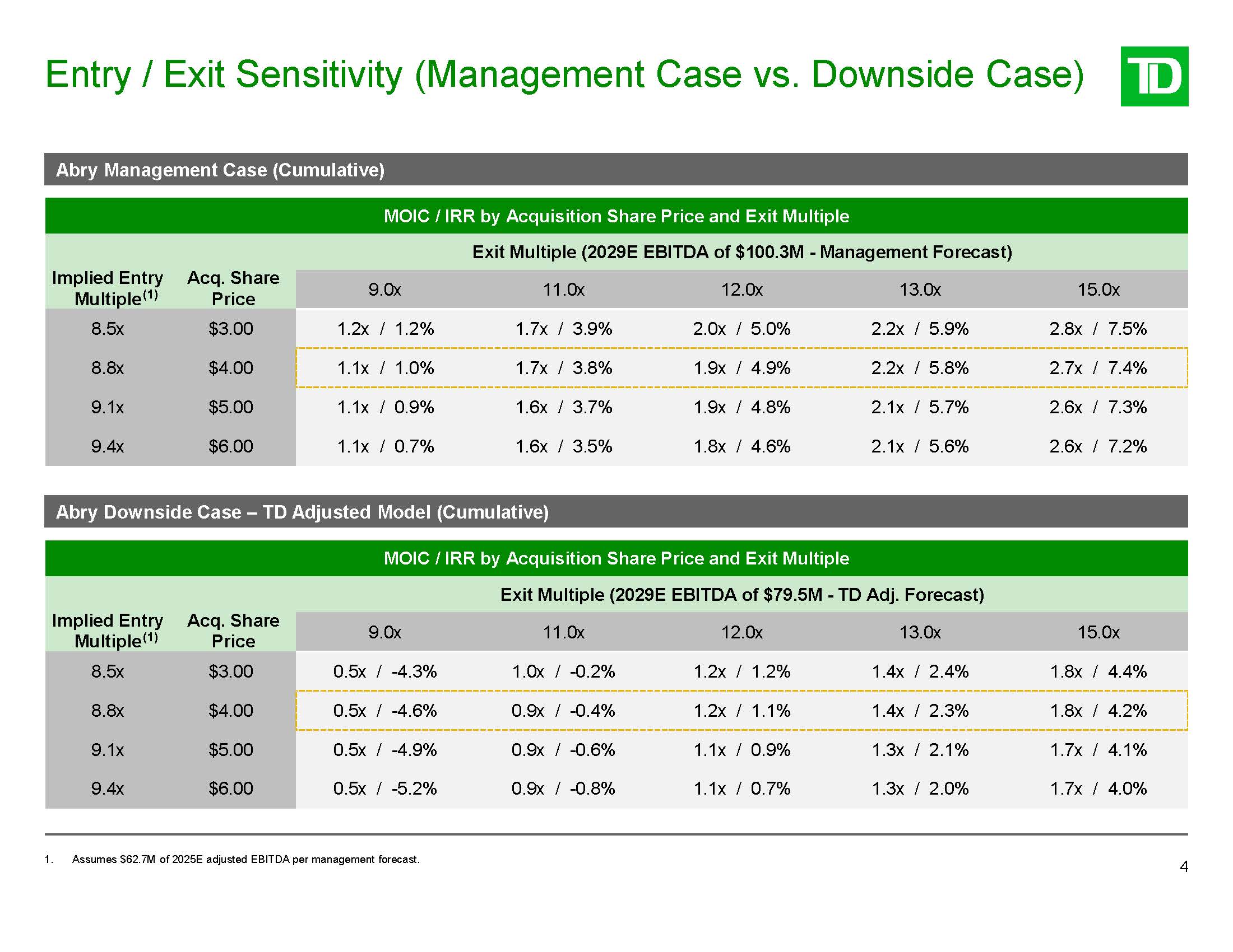 MOIC / IRR by Acquisition Share Price and Exit Multiple  Exit Multiple (2029E EBITDA of $79.5M - TD Adj. Forecast)  Implied Entry  Multiple (1)  Acq. Share  Price  9.0x 11.0x 12.0x 13.0x 15.0x  8.5x  $3.00  0.5x  / -4.3%  1.0x  / -0.2%  1.2x  / 1.2%  1.4x  / 2.4%  1.8x  / 4.4%  8.8x  $4.00  0.5x  / -4.6%  0.9x  / -0.4%  1.2x  / 1.1%  1.4x  / 2.3%  1.8x  / 4.2%  9.1x  $5.00  0.5x  / -4.9%  0.9x  / -0.6%  1.1x  / 0.9%  1.3x  / 2.1%  1.7x  / 4.1%  9.4x  $6.00  0.5x  / -5.2%  0.9x  / -0.8%  1.1x  / 0.7%  1.3x  / 2.0%  1.7x  / 4.0%  1.  Assumes $62.7M of 2025E adjusted EBITDA per management forecast.  4  MOIC / IRR by Acquisition Share Price and Exit Multiple  Exit Multiple (2029E EBITDA of $100.3M - Management Forecast)  Implied Entry  Multiple (1)  Acq. Share  Price  9.0x 11.0x 12.0x 13.0x 15.0x  8.5x  $3.00  1.2x  / 1.2%  1.7x  / 3.9%  2.0x  / 5.0%  2.2x  / 5.9%  2.8x  / 7.5%  8.8x  $4.00  1.1x  / 1.0%  1.7x  / 3.8%  1.9x  / 4.9%  2.2x  / 5.8%  2.7x  / 7.4%  9.1x  $5.00  1.1x  / 0.9%  1.6x  / 3.7%  1.9x  / 4.8%  2.1x  / 5.7%  2.6x  / 7.3%  9.4x  $6.00  1.1x  / 0.7%  1.6x  / 3.5%  1.8x  / 4.6%  2.1x  / 5.6%  2.6x  / 7.2%  Entry / Exit Sensitivity (Management Case vs. Downside Case)  Abry Management Case (Cumulative)  Abry Downside Case – TD Adjusted Model (Cumulative)