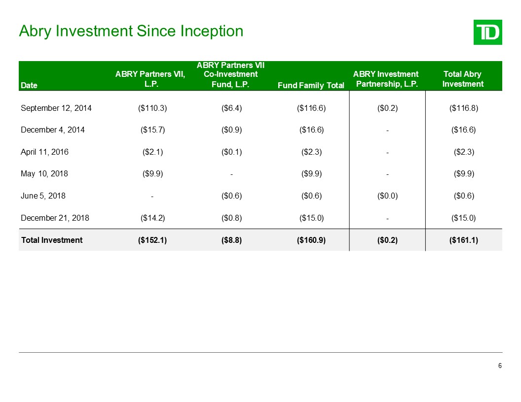 Abry Investment Since Inception  6  Date  ABRY Partners VII, L.P.  ABRY Partners VII  Co-Investment Fund, L.P.  Fund Family Total  ABRY Investment Partnership, L.P.  Total Abry Investment  September 12, 2014  ($110.3)  ($6.4)  ($116.6)  ($0.2)  ($116.8)  December 4, 2014  ($15.7)  ($0.9)  ($16.6)  -  ($16.6)  April 11, 2016  ($2.1)  ($0.1)  ($2.3)  -  ($2.3)  May 10, 2018  ($9.9)  -  ($9.9)  -  ($9.9)  June 5, 2018  -  ($0.6)  ($0.6)  ($0.0)  ($0.6)  December 21, 2018  ($14.2)  ($0.8)  ($15.0)  -  ($15.0)  Total Investment  ($152.1)  ($8.8)  ($160.9)  ($0.2)  ($161.1)