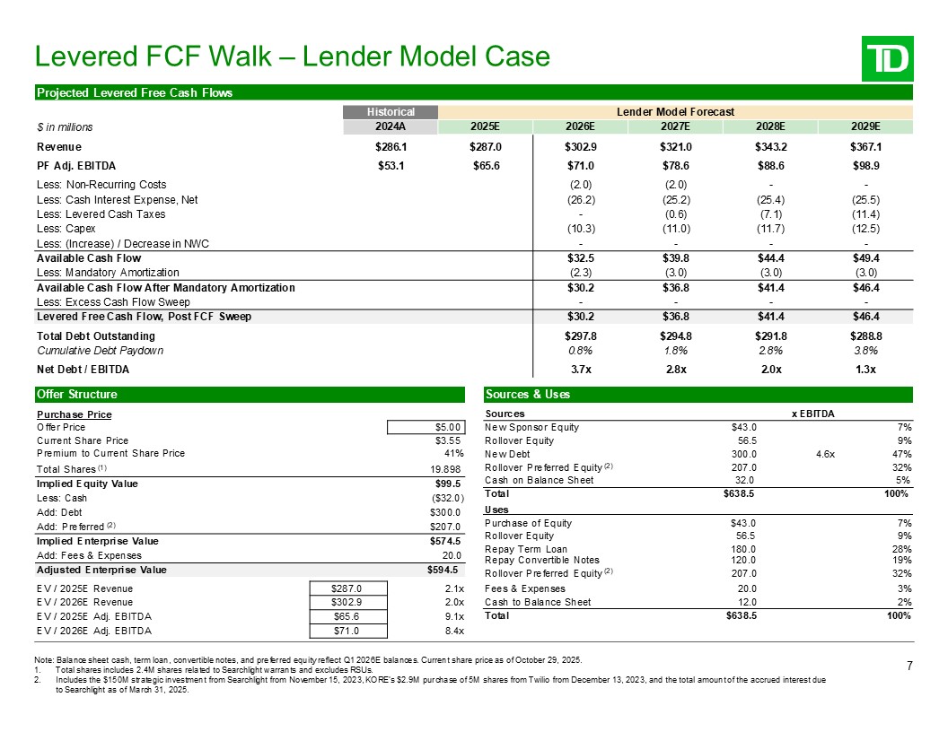 Projected Levered Free Cash Flows  $ in millions  Historical  TD Adjusted Forecast  2024A  2025E  2026E  2027E  2028E  2029E  Revenue  $286.1  $287.0  $302.9  $321.0  $343.2  $367.1  PF Adj. EBITDA  $53.1  $65.6  $71.0  $74.6  $78.3  $82.2  Less: Non-Recurring Costs  (2.0)  (2.0)  -  -  Less: Cash Interest Expense, Net  (26.2)  (25.2)  (25.4)  (25.5)  Less: Levered Cash Taxes  -  (0.3)  (4.9)  (8.5)  Less: Capex  (10.3)  (11.0)  (11.7)  (12.5)  Less: (Increase) / Decrease in NWC  -  -  -  -  Available Cash Flow  $32.5  $36.1  $36.3  $35.6  Less: Mandatory Amortization  (2.3)  (3.0)  (3.0)  (3.0)  Available Cash Flow After Mandatory Amortization  $30.2  $33.1  $33.3  $32.6  Less: Excess Cash Flow Sweep  -  -  -  -  Levered Free Cash Flow, Post FCF Sweep  $30.2  $33.1  $33.3  $32.6  Total Debt Outstanding  $297.8  $294.8  $291.8  $288.8  Cumulative Debt Paydown  0.8%  1.8%  2.8%  3.8%  Net Debt / EBITDA  3.7x  3.1x  2.5x  1.9x  Levered FCF Walk – Downside Case (TD Adjusted Model)  8  Add: Fees & Expenses  20.0  $287.0  $302.9  $65.6  $71.0  Cash on Balance Sheet 32.0 5%  Total $638.5 100%   Uses   Implied Equity Value  $99.5  Less: Cash  ($32.0)  Add: Debt  $300.0  Add: Preferred (4)  $207.0  Implied Enterprise Value  $574.5  Offer Structure  Sources & Uses  Purchase Price  Sources  x EBITDA  Offer Price  $5.00  New Sponsor Equity  $43.0  7%  Current Share Price  $3.55  Rollover Equity  56.5  9%  Premium to Current Share Price  41%  New Debt  300.0  4.6x  47%  Total Shares (1)  19.898  Rollover Preferred Equity (2)  207.0  32%  Purchase of Equity  $43.0  7%  Rollover Equity  56.5  9%  Repay Term Loan  180.0  28%  Repay Convertible Notes  120.0  19%  Adjusted Enterprise Value  $594.5  Rollover Preferred Equity (2)  207.0  32%  EV / 2025E Revenue  2.1x  Fees & Expenses  20.0  3%  EV / 2026E Revenue  2.0x  Cash to Balance Sheet  12.0  2%  EV / 2025E Adj. EBITDA  9.1x  Total  $638.5  100%  EV / 2026E Adj. EBITDA  8.4x  Note: Balance sheet cash, term loan, convertible notes, and preferred equity reflect Q1 2026E balances. Current share price as of October 29, 2025.  Total shares includes 2.4M shares related to Searchlight warrants and excludes RSUs.  Includes the $150M strategic investment from Searchlight from November 15, 2023, KORE’s $2.9M purchase of 5M shares from Twilio from December 13, 2023, and the total amount of the accrued interest due to Searchlight as of March 31, 2025.