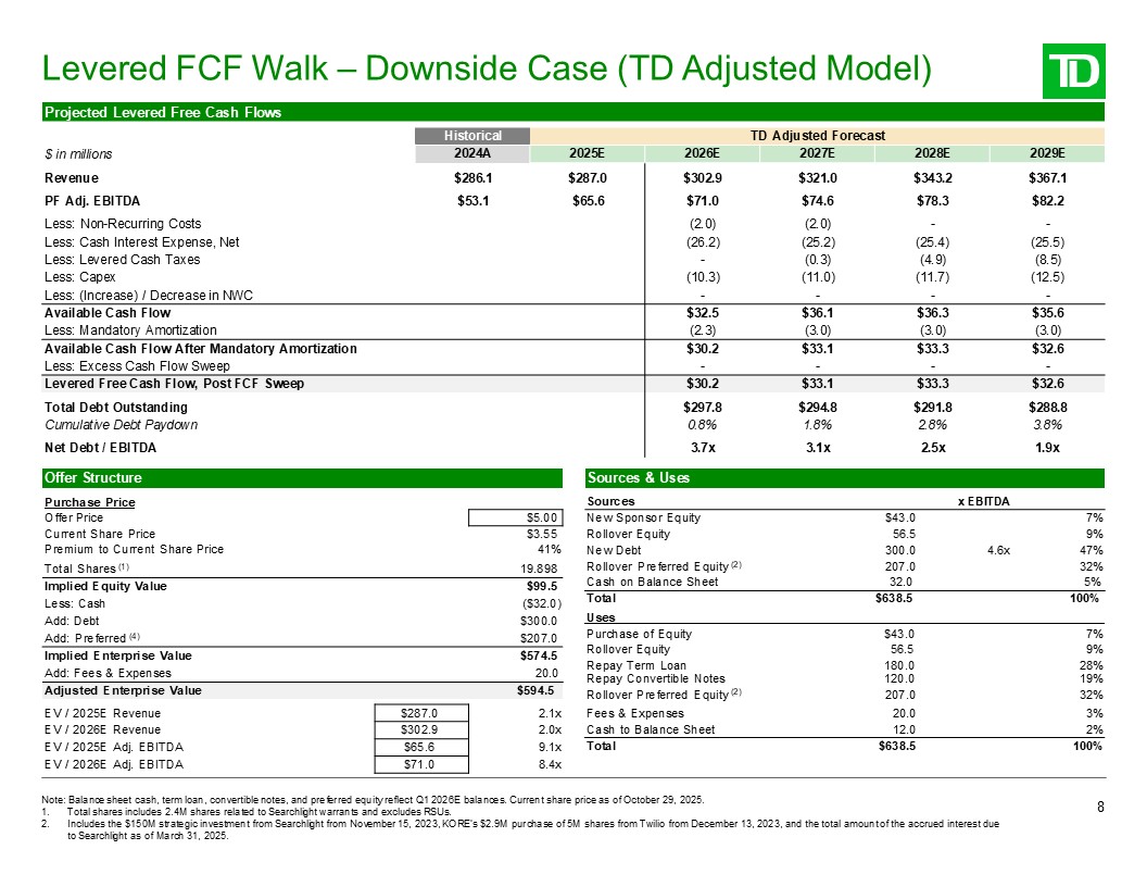 Levered FCF Walk – Lender Model Case  7  Note: Balance sheet cash, term loan, convertible notes, and preferred equity reflect Q1 2026E balances. Current share price as of October 29, 2025.  Total shares includes 2.4M shares related to Searchlight warrants and excludes RSUs.  Includes the $150M strategic investment from Searchlight from November 15, 2023, KORE’s $2.9M purchase of 5M shares from Twilio from December 13, 2023, and the total amount of the accrued interest due to Searchlight as of March 31, 2025.  Implied Equity Value  $99.5  Less: Cash  ($32.0)  Add: Debt  $300.0  Add: Preferred (2)  $207.0  Implied Enterprise Value  $574.5  Add: Fees & Expenses  20.0  $287.0  $302.9  $65.6  $71.0  Cash on Balance Sheet 32.0 5%  Total $638.5 100%   Uses   Offer Structure  Sources & Uses  Purchase Price  Sources  x EBITDA  Offer Price  $5.00  New Sponsor Equity  $43.0  7%  Current Share Price  $3.55  Rollover Equity  56.5  9%  Premium to Current Share Price  41%  New Debt  300.0  4.6x  47%  Total Shares (1)  19.898  Rollover Preferred Equity (2)  207.0  32%  Purchase of Equity  $43.0  7%  Rollover Equity  56.5  9%  Repay Term Loan  180.0  28%  Repay Convertible Notes  120.0  19%  Adjusted Enterprise Value  $594.5  Rollover Preferred Equity (2)  207.0  32%  EV / 2025E Revenue  2.1x  Fees & Expenses  20.0  3%  EV / 2026E Revenue  2.0x  Cash to Balance Sheet  12.0  2%  EV / 2025E Adj. EBITDA  9.1x  Total  $638.5  100%  EV / 2026E Adj. EBITDA  8.4x  Projected Levered Free Cash Flows  $ in millions  Historical  Lender Model Forecast  2024A  2025E  2026E  2027E  2028E  2029E  Revenue  $286.1  $287.0  $302.9  $321.0  $343.2  $367.1  PF Adj. EBITDA  $53.1  $65.6  $71.0  $78.6  $88.6  $98.9  Less: Non-Recurring Costs  (2.0)  (2.0)  -  -  Less: Cash Interest Expense, Net  (26.2)  (25.2)  (25.4)  (25.5)  Less: Levered Cash Taxes  -  (0.6)  (7.1)  (11.4)  Less: Capex  (10.3)  (11.0)  (11.7)  (12.5)  Less: (Increase) / Decrease in NWC  -  -  -  -  Available Cash Flow  $32.5  $39.8  $44.4  $49.4  Less: Mandatory Amortization  (2.3)  (3.0)  (3.0)  (3.0)  Available Cash Flow After Mandatory Amortization  $30.2  $36.8  $41.4  $46.4  Less: Excess Cash Flow Sweep  -  -  -  -  Levered Free Cash Flow, Post FCF Sweep  $30.2  $36.8  $41.4  $46.4  Total Debt Outstanding  $297.8  $294.8  $291.8  $288.8  Cumulative Debt Paydown  0.8%  1.8%  2.8%  3.8%  Net Debt / EBITDA  3.7x  2.8x  2.0x  1.3x
