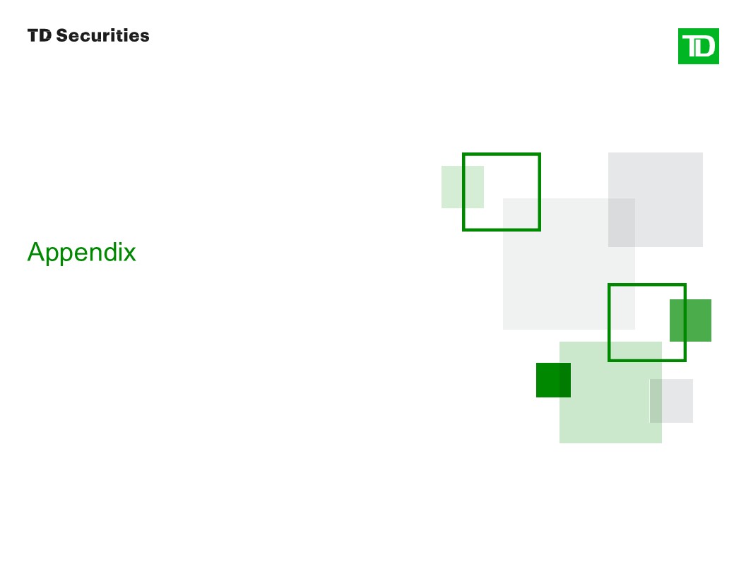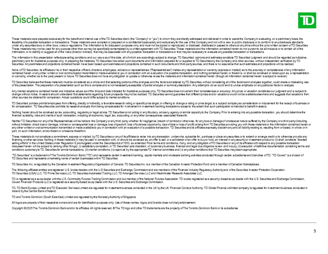 Disclaimer  These materials were prepared exclusively for the benefit and internal use of the TD Securities client (the “Company” or “you”) to whom they are directly addressed and delivered in order to assist the Company in evaluating, on a preliminary basis, the feasibility of a possible transaction or transactions. These materials were compiled or prepared on a confidential basis solely and exclusively for the use of the Company and not with a view to public disclosure or to conform to any disclosure standards under any securities laws or other laws, rules or regulations. The information is for discussion purposes only, and must not be copied or reproduced, or disclosed, distributed or passed to others at any time without the prior written consent of TD Securities. These materials may not be used for any purpose other than as may be specifically contemplated by a written agreement with TD Securities. These materials and the information contained herein do not purport to be all-inclusive or to contain all of the information, or to identify or suggest all of the risks (direct or indirect), that may be associated with any possible transaction or transactions or that may be necessary to evaluate any possible transaction or transactions.  The information in this presentation reflects prevailing conditions and our views as of this date, all of which are accordingly subject to change. TD Securities’ opinions and estimates constitute TD Securities’ judgment and should be regarded as indicative, preliminary and for illustrative purposes only. In preparing the materials, TD Securities has relied upon documents and information prepared for or supplied to TD Securities by the Company and other sources, without independent verification by TD Securities. Any estimates and projections contained herein have been based upon estimates and projections contained in such documents and third-party sources, and there is no assurance that such estimates and projections will be realized.  None of TD Securities, its affiliates or its or their respective officers, directors, employees, advisors or representatives (“Representatives”) makes any representation or warranty (express or implied) as to the accuracy or completeness of any information contained herein or any other written or oral communication transmitted or made available to you in connection with an evaluation of a possible transaction, and nothing contained herein or therein is, or shall be construed or relied upon as, a representation or warranty, whether as to the past, present or future. TD Securities does not have any obligation to update or otherwise revise the materials and information contained herein (though all information contained herein is subject to revision).  TD Securities believes that these materials must be considered as a whole and that selecting portions of the analyses and the factors considered by TD Securities, without considering all of the factors and analyses together, could create a misleading view of the presentation. The preparation of a presentation such as this is complex and is not necessarily susceptible of partial analysis or summary description. Any attempt to do so could lend to undue emphasis on any particular factor or analysis.  Any market valuations contained herein are indicative values as of the time and date indicated for illustrative purposes only. TD Securities does not warrant their completeness or accuracy. Any price or valuation constitutes our judgment and is subject to change without notice. Investors should understand that statements regarding future prospects may not be realized. TD Securities cannot guarantee that different prices and/or valuations would not be available elsewhere and suggests that valuations from other sources be obtained for comparison. Actual quotations could differ subject to market conditions.  TD Securities’ policies prohibit employees from offering, directly or indirectly, a favorable research rating or specific price target, or offering to change a rating or price target, to a subject company as consideration or inducement for the receipt of business or for compensation. TD Securities also prohibits its research analysts from being compensated for involvement in investment banking transactions except to the extent that such participation is intended to benefit investors.  Nothing herein should be construed as tax, accounting, regulatory or legal advice. TD Securities is not acting in any fiduciary, advisory, agency or similar capacity to the Company. Prior to entering into any possible transaction, you should determine the financial suitability, risks and merits of such transaction, including all economic, legal, tax, accounting or any other consequences associated therewith.  Neither TD Securities nor any of its Representatives will be liable to the Company or any third party, whether for negligence, breach of contract or otherwise, for any loss or damage of whatsoever nature suffered by the Company or a third party (including, without limitation, direct loss or damage, indirect or consequential loss or damage, loss of goodwill, loss of business opportunity, loss of data or loss of profit) arising from TD Securities providing you with these materials or the information contained herein or any other written or oral communication transmitted or made available to you in connection with an evaluation of a possible transaction. TD Securities and its affiliates expressly disclaim any and all liability relating to, resulting from or based, in whole or in part, on such information, errors therein or omissions therefrom.  These materials do not constitute a commitment, express or implied, by TD Securities or any of its affiliates to enter into any transaction, underwrite, subscribe for, purchase or place any securities or to extend or arrange credit or to otherwise provide any financing or other services. Nothing in these materials (i) may be used