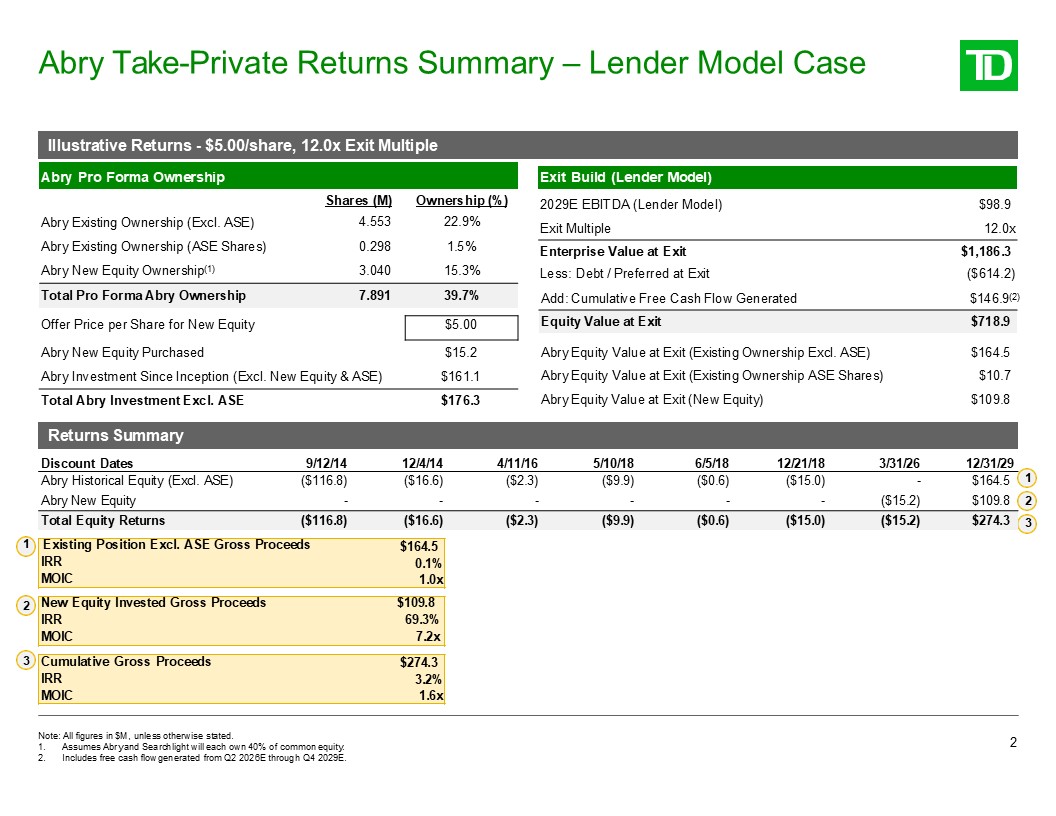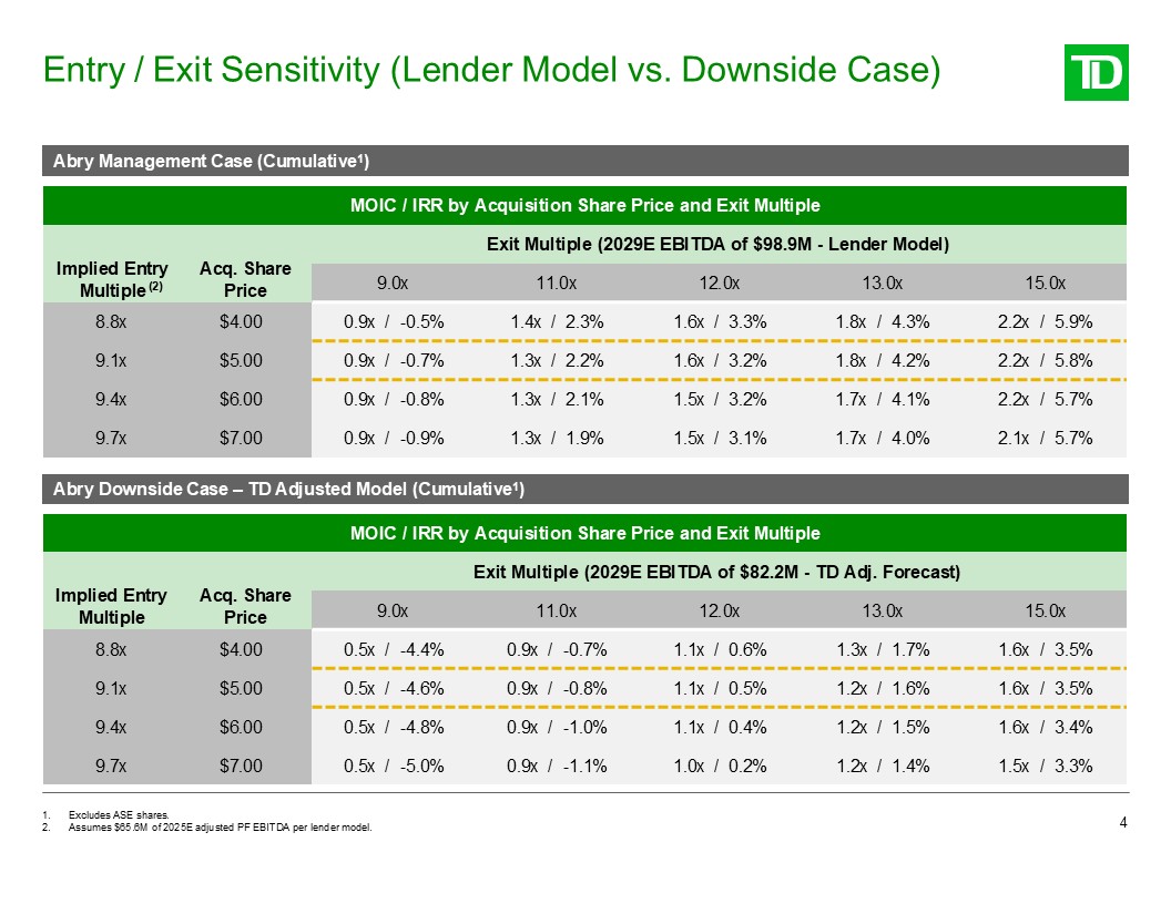 Exit Build (Downside Case - TD Adjusted Model)  2029E EBITDA (TDC Adjusted)  $82.2  Exit Multiple  10.0x  Enterprise Value at Exit  $822.0  Less: Debt / Preferred at Exit  ($614.2)  Offer Price per Share for New Equity  $5.00  Equity Value at Exit  $329.1  Abry New Equity Purchased  $15.2  Abry Equity Value at Exit (Existing Ownership Excl. ASE)  $75.3  Abry Investment Since Inception (Excl. New Equity & ASE)  $161.1  Abry Equity Value at Exit (Existing Ownership ASE Shares)  $4.9  Total Abry Investment Excl. ASE  $176.3  Abry Equity Value at Exit (New Equity)  $50.3  Add: Cumulative Free Cash Flow Generated  $121.3(2)  Abry Take-Private Returns Summary – Downside Case (TD  Adjusted Model)  3  Abry Pro Forma Ownership  Abry Existing Ownership (Excl. ASE)  Shares (M)  4.553  Ownership (%)  22.9%  Abry Existing Ownership (ASE Shares)  0.298  1.5%  Abry New Equity Ownership(1)  3.040  15.3%  Total Pro Forma Abry Ownership  7.891  39.7%  Illustrative Returns - $5.00/share, 10.0x Exit Multiple  Returns Summary  Note: All figures in $M, unless otherwise stated.  Assumes Abry and Searchlight will each own 40% of common equity.  Includes free cash flow generated from Q2 2026E through Q4 2029E.  1 Existing Position Excl. ASE Gross Proceeds IRR  MOIC  2  3  Discount Dates  9/12/14  12/4/14  4/11/16  5/10/18  6/5/18  12/21/18  3/31/26  12/31/29  Abry Historical Equity (Excl. ASE)  ($116.8)  ($16.6)  ($2.3)  ($9.9)  ($0.6)  ($15.0)  -  $75.3  1  Abry New Equity  -  -  -  -  -  -  ($15.2)  $50.3  2  Total Equity Returns  ($116.8)  ($16.6)  ($2.3)  ($9.9)  ($0.6)  ($15.0)  ($15.2)  $125.6  3  $75.3 (5.1%)  0.5x  New Equity Invested Gross Proceeds IRR  MOIC  $50.3 37.5%  3.3x  Cumulative Gross Proceeds IRR  MOIC  $125.6 (2.5%)  0.7x
