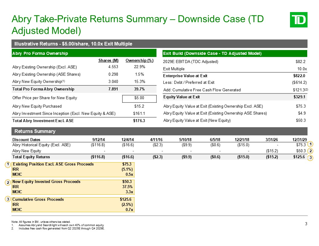 Abry Take-Private Returns Summary – Lender Model Case  2  Abry Pro Forma Ownership  Abry Existing Ownership (Excl. ASE)  Shares (M)  4.553  Ownership (%)  22.9%  Abry Existing Ownership (ASE Shares)  0.298  1.5%  Abry New Equity Ownership(1)  3.040  15.3%  Total Pro Forma Abry Ownership  7.891  39.7%  Illustrative Returns - $5.00/share, 12.0x Exit Multiple  Returns Summary  Note: All figures in $M, unless otherwise stated.  Assumes Abry and Searchlight will each own 40% of common equity.  Includes free cash flow generated from Q2 2026E through Q4 2029E.  1 Existing Position Excl. ASE Gross Proceeds IRR  MOIC  2  3  Discount Dates  9/12/14  12/4/14  4/11/16  5/10/18  6/5/18  12/21/18  3/31/26  12/31/29  Abry Historical Equity (Excl. ASE)  ($116.8)  ($16.6)  ($2.3)  ($9.9)  ($0.6)  ($15.0)  -  $164.5  1  Abry New Equity  -  -  -  -  -  -  ($15.2)  $109.8  2  Total Equity Returns  ($116.8)  ($16.6)  ($2.3)  ($9.9)  ($0.6)  ($15.0)  ($15.2)  $274.3  3  Offer Price per Share for New Equity  $5.00  Equity Value at Exit  $718.9  Abry New Equity Purchased  $15.2  Abry Equity Value at Exit (Existing Ownership Excl. ASE)  $164.5  Abry Investment Since Inception (Excl. New Equity & ASE)  $161.1  Abry Equity Value at Exit (Existing Ownership ASE Shares)  $10.7  Total Abry Investment Excl. ASE  $176.3  Abry Equity Value at Exit (New Equity)  $109.8  Exit Build (Lender Model)  2029E EBITDA (Lender Model)  $98.9  Exit Multiple  12.0x  Enterprise Value at Exit  $1,186.3  Less: Debt / Preferred at Exit  ($614.2)  Add: Cumulative Free Cash Flow Generated  $146.9(2)  $164.5  0.1%  1.0x  New Equity Invested Gross Proceeds IRR  MOIC  $109.8 69.3%  7.2x  Cumulative Gross Proceeds IRR  MOIC  $274.3  3.2%  1.6x