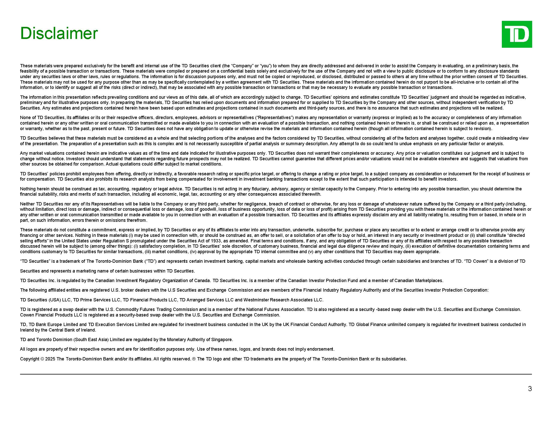 connection with an evaluation of a possible transaction. TD Securities and its affiliates expressly disclaim any and all liability relating to, resulting from or based, in whole or in part, on such information, errors therein or omissions