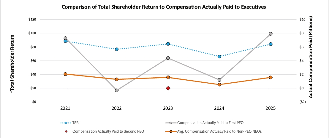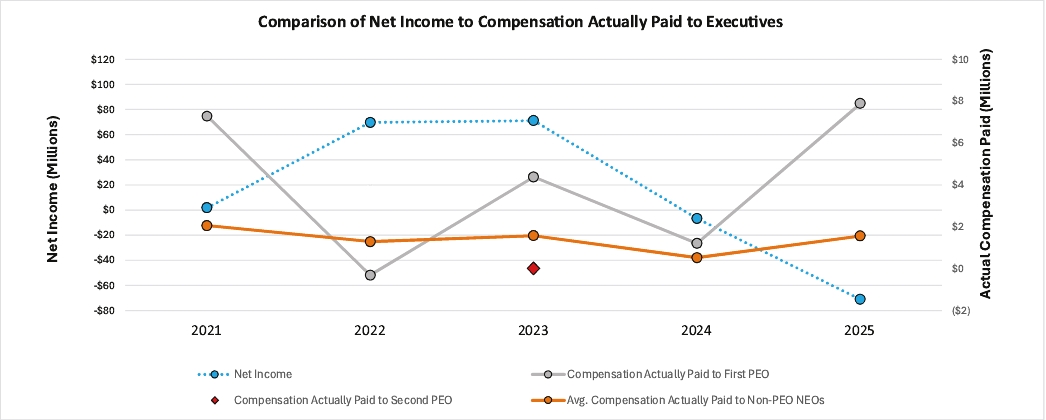 Pay vs. Performance | | | | | | | | | | | | | | | | | | | | | | | | | | | | | | | 2025 | | | $4,992,440 | | | N/A | | | $7,909,365 | | | N/A | | | $1,406,253 | | | $1,566,083 | | | $84 | | | $103 | | | ($71,100) | | | $172,000(6) | | | 2024 | | | $4,092,116 | | | N/A | | | $1,213,158 | | | N/A | | | $1,243,731 | | | $524,539 | | | $66 | | | $105 | | | ($6,700) | | | $238,200 | | | 2023 | | | $4,669,022 | | | N/A | | | $4,385,674 | | | N/A | | | $1,553,253 | | | $1,574,071 | | | $85 | | | $108 | | | $71,200 | | | $259,900 | | | 2022 | | | $8,958,314 | | | $4,378,660 | | | ($306,892) | | | $3,755,039 | | | $2,232,721 | | | $1,293,593 | | | $77 | | | $97 | | | $69,800 | | | $276,800 | | | 2021 | | | $8,953,055 | | | N/A | | | $7,292,777 | | | N/A | | | $2,421,693 | | | $2,056,217 | | | $89 | | | $117 | | | $1,800 | | | $227,600 | | | | | | | | | | | | | | | | | | | | | | | | | | | | | | | | | | |