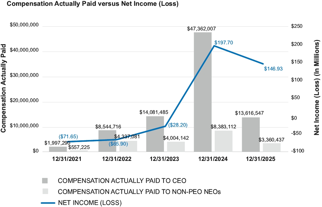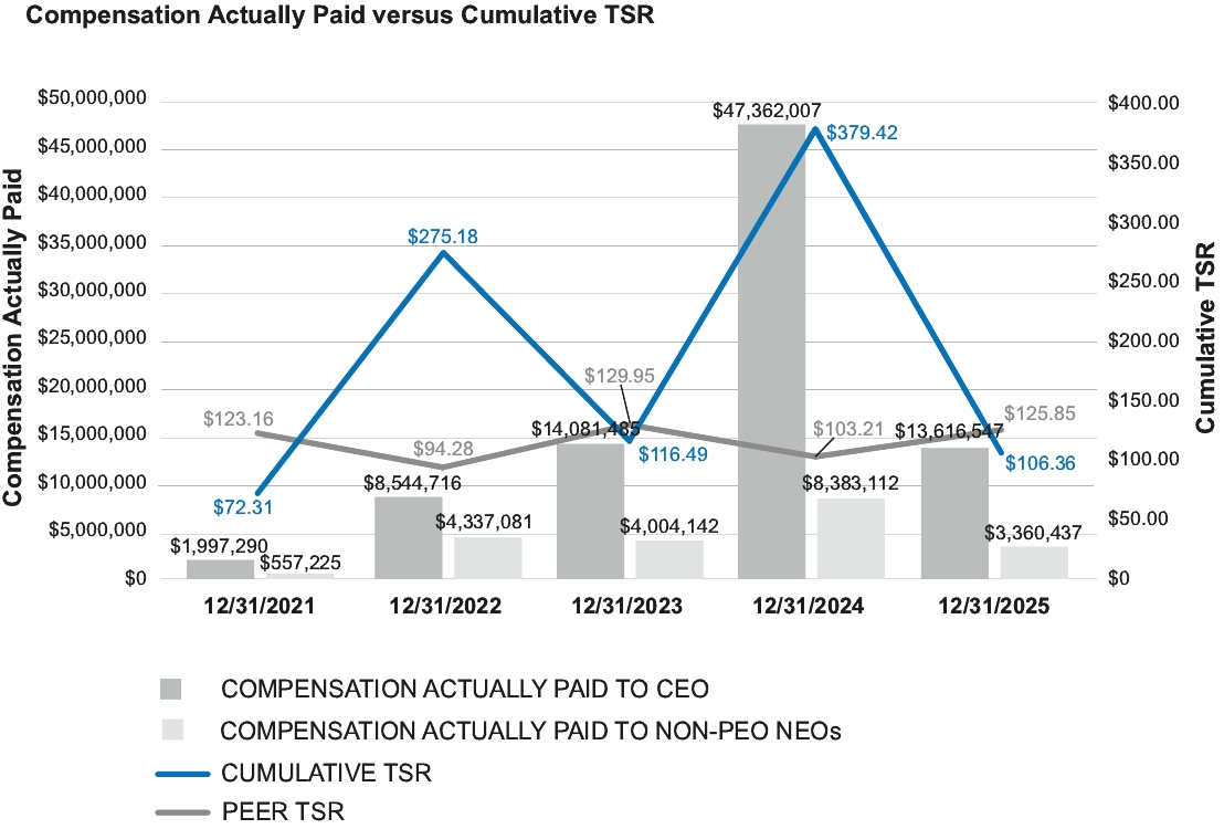 PAY VERSUS PERFORMANCE The following tables provide information regarding fiscal years ended December 31, 2025, 2024, 2023, 2022 and 2021 in satisfaction of Item 402(v) of Regulation S-K. For the most recently completed fiscal year, we did not use any financial performance measure to link Compensation Actually Paid to our named executive officers to the Company’s performance; accordingly, this disclosure does not present a company-selected measure in the table below nor a tabular list of our most important performance measures, as permitted by the SEC. | | | | | | | | | | | | | | | | | | | | | | | | | 2025 | | | 10,237,326 | | | 13,616,547 | | | 2,869,742 | | | 3,360,437 | | | 106.36 | | | 125.85 | | | 146.93 | | | 2024 | | | 7,918,734 | | | 47,362,007 | | | 2,319,752 | | | 8,383,112 | | | 379.42 | | | 103.21 | | | 197.70 | | | 2023 | | | 6,039,649 | | | 14,081,485 | | | 1,965,360 | | | 4,004,142 | | | 116.49 | | | 129.95 | | | (28.20) | | | 2022 | | | 2,649,501 | | | 8,544,716 | | | 1,601,064 | | | 4,337,081 | | | 275.18 | | | 94.28 | | | (65.90) | | | 2021 | | | 4,361,250 | | | 1,997,290 | | | 1,730,385 | | | 557,225 | | | 72.31 | | | 123.16 | | | (71.65) | | | | | | | | | | | | | | | | | | | | | | | | | |