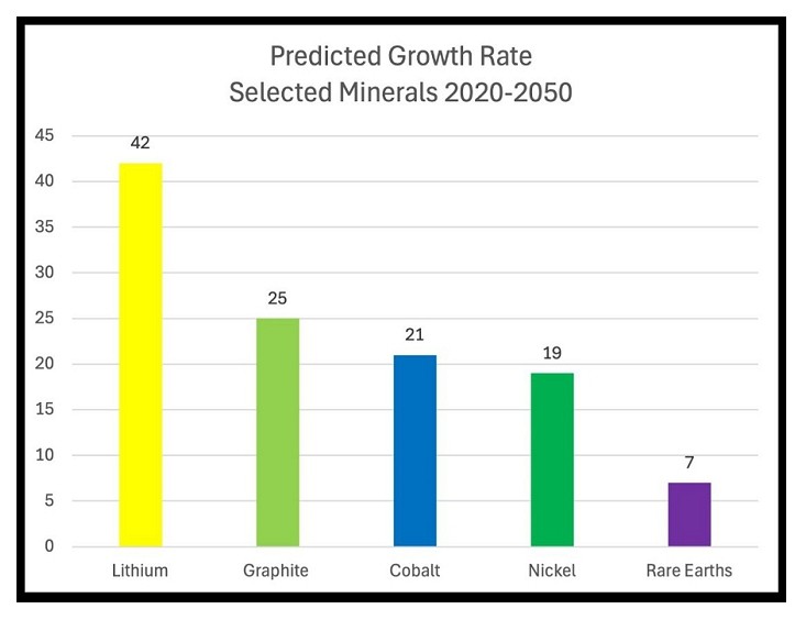 The chart in figure 1 depicts the projected growth of the demand for specific minerals that provide the base material for the manufacturing of electrical vehicle and energy storage batteries. The growth rate for projected demand in 2050 is presented using 2020 as the base of comparison (Source: https://www.iea.org/reports/the-role-of-critical-minerals-in-clean-energy-transitions; The Role of Critical Minerals in Clean Energy Transitions”).