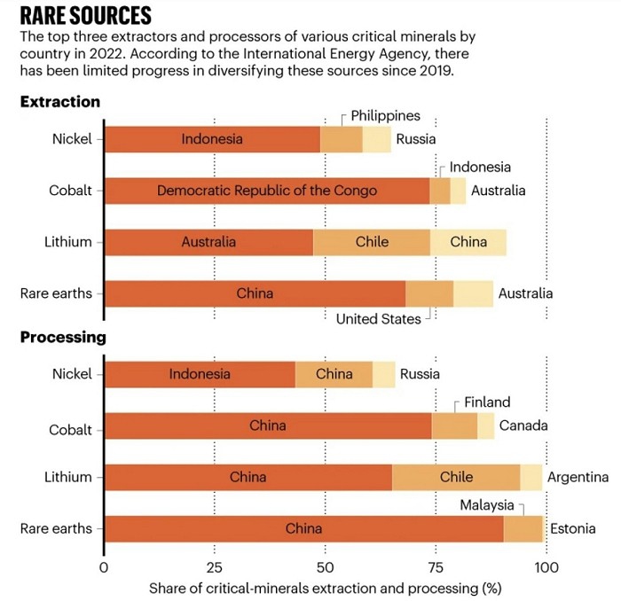 Many of these critical minerals are mined and processed in a small number of countries, as illustrated in the chart in Figure 2 (Source: “The global fight for critical minerals is costly and damaging,” Nature, July 19, 2023).