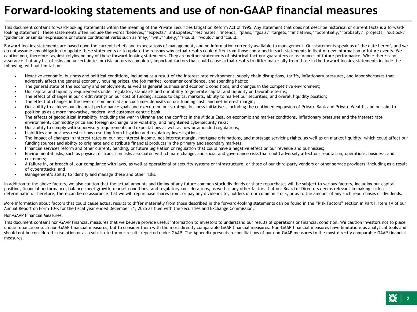 2 Forward-looking statements and use of non-GAAP financial measures This document contains forward-looking statements within the meaning of the Private Securities Litigation Reform Act of 1995. Any statement that does not describe historical or current facts is a forward- looking statement. These statements often include the words "believes," "expects," "anticipates," "estimates," "intends," "plans," "goals," "targets," "initiatives," "potentially," "probably," "projects," "outlook," "guidance" or similar expressions or future conditional verbs such as "may," "will," "likely," "should," "would," and "could." Forward-looking statements are based upon the current beliefs and expectations of management, and on information currently available to management. Our statements speak as of the date hereof, and we do not assume any obligation to update these statements or to update the reasons why actual results could differ from those contained in such statements in light of new information or future events. We caution you, therefore, against relying on any of these forward-looking statements. They are neither statements of historical fact nor guarantees or assurances of future performance. While there is no assurance that any list of risks and uncertainties or risk factors is complete, important factors that could cause actual results to differ materially from those in the forward-looking statements include the following, without limitation: • Negative economic, business and political conditions, including as a result of the interest rate environment, supply chain disruptions, tariffs, inflationary pressures, and labor shortages that adversely affect the general economy, housing prices, the job market, consumer confidence, and spending habits; • The general state of the economy and employment, as well as general business and economic conditions, and changes in the competitive environment; • Our capital and liquidity requirements under regulatory standards and our ability to generate capital and liquidity on favorable terms; • The effect of changes in our credit ratings on our cost of funding, access to capital markets, ability to market our securities, and overall liquidity position; • The effect of changes in the level of commercial and consumer deposits on our funding costs and net interest margin; • Our ability to achieve our financial performance goals and execute on our strategic business initiatives, including the continued expansion of Private Bank and Private Wealth, and our aim to position us as a more innovative, modern, and customer-centric bank; • The effects of geopolitical instability, including the war in Ukraine and the conflict in the Middle East, on economic and market conditions, inflationary pressures and the interest rate environment, commodity price and foreign exchange rate volatility, and heightened cybersecurity risks; • Our ability to comply with supervisory requirements and expectations as well as new or amended regulations; • Liabilities and business restrictions resulting from litigation and regulatory investigations; • The impact of changes in interest rates on our net interest income, net interest margin, mortgage originations, and mortgage servicing rights, as well as on market liquidity, which could affect our funding sources and ability to originate and distribute financial products in the primary and secondary markets; • Financial services reform and other current, pending, or future legislation or regulation that could have a negative effect on our revenue and businesses; • Environmental risks, such as physical or transition risks associated with climate change, and social and governance risks that could adversely affect our reputation, operations, business, and customers; • A failure in, or breach of, our compliance with laws, as well as operational or security systems or infrastructure, or those of our third-party vendors or other service providers, including as a result of cyberattacks; and • Management’s ability to identify and manage these and other risks. In addition to the above factors, we also caution that the actual amounts and timing of any future common stock dividends or share repurchases will be subject to various factors, including our capital position, financial performance, balance sheet growth, market conditions, and regulatory considerations, as well as any other factors that our Board of Directors deems relevant in making such a determination. Therefore, there can be no assurance that we will repurchase shares from, or pay any dividends to, holders of our common stock, or as to the amount of any such repurchases or dividends. More information about factors that could cause actual results to differ materially from those described in the forward-looking statements can be found in the “Risk Factors” section in Part I, Item 1A of our Annual Report on Form 10-K for the fiscal year ended December 31, 2025 as filed with the Securities and Exchange Commission. Non-GAAP Financial Measures: This document contains non-GAAP financial measures that we believe provide useful information to investors to understand our results of operations or financial condition. We caution investors not to place undue reliance on such non-GAAP financial measures, but to consider them with the most directly comparable GAAP financial measures. Non-GAAP financial measures have limitations as analytical tools and should not be considered in isolation or as a substitute for our results reported under GAAP. The Appendix presents reconciliations of our non-GAAP measures to the most directly comparable GAAP financial measures.