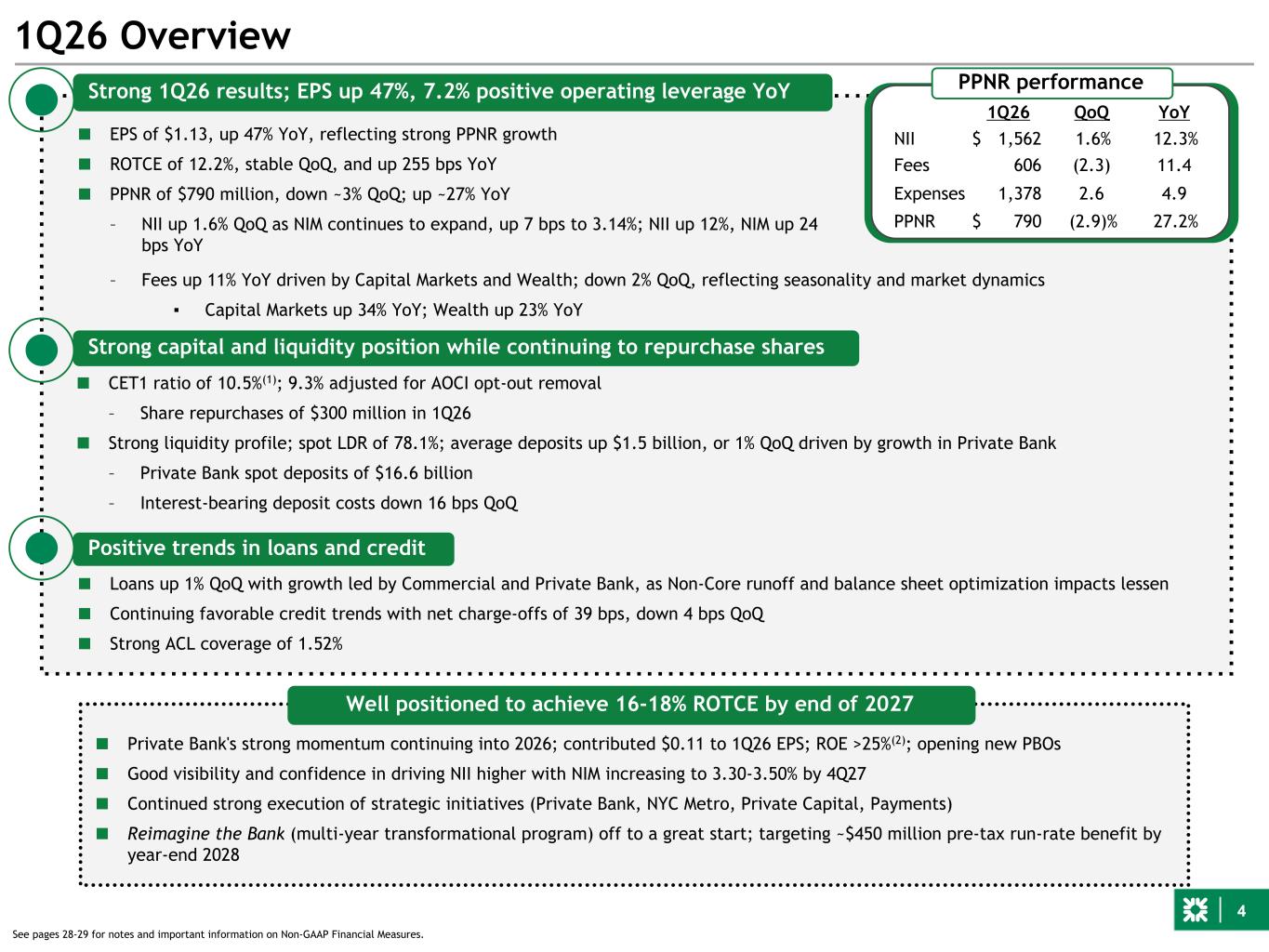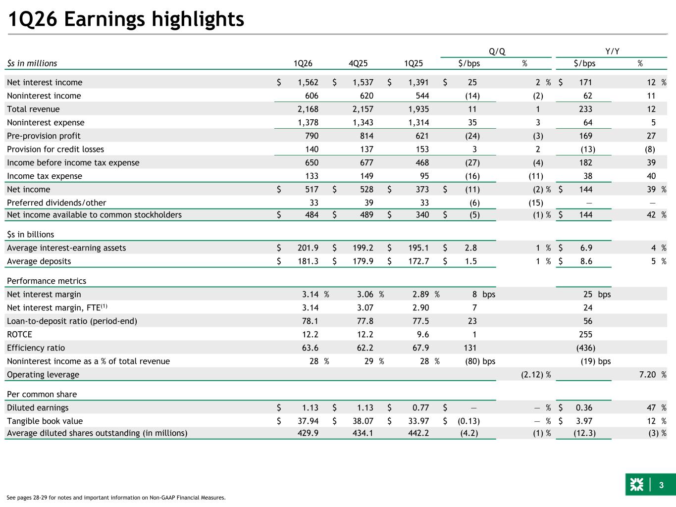 3 1Q26 Earnings highlights 1Q26 4Q25 1Q25 Q/Q Y/Y $s in millions $/bps % $/bps % Net interest income $ 1,562 $ 1,537 $ 1,391 $ 25 2 % $ 171 12 % Noninterest income 606 620 544 (14) (2) 62 11 Total revenue 2,168 2,157 1,935 11 1 233 12 Noninterest expense 1,378 1,343 1,314 35 3 64 5 Pre-provision profit 790 814 621 (24) (3) 169 27 Provision for credit losses 140 137 153 3 2 (13) (8) Income before income tax expense 650 677 468 (27) (4) 182 39 Income tax expense 133 149 95 (16) (11) 38 40 Net income $ 517 $ 528 $ 373 $ (11) (2) % $ 144 39 % Preferred dividends/other 33 39 33 (6) (15) — — Net income available to common stockholders $ 484 $ 489 $ 340 $ (5) (1) % $ 144 42 % $s in billions Average interest-earning assets $ 201.9 $ 199.2 $ 195.1 $ 2.8 1 % $ 6.9 4 % Average deposits $ 181.3 $ 179.9 $ 172.7 $ 1.5 1 % $ 8.6 5 % Performance metrics Net interest margin 3.14 % 3.06 % 2.89 % 8 bps 25 bps Net interest margin, FTE(1) 3.14 3.07 2.90 7 24 Loan-to-deposit ratio (period-end) 78.1 77.8 77.5 23 56 ROTCE 12.2 12.2 9.6 1 255 Efficiency ratio 63.6 62.2 67.9 131 (436) Noninterest income as a % of total revenue 28 % 29 % 28 % (80) bps (19) bps Operating leverage (2.12) % 7.20 % Per common share Diluted earnings $ 1.13 $ 1.13 $ 0.77 $ — — % $ 0.36 47 % Tangible book value $ 37.94 $ 38.07 $ 33.97 $ (0.13) — % $ 3.97 12 % Average diluted shares outstanding (in millions) 429.9 434.1 442.2 (4.2) (1) % (12.3) (3) % See pages 28-29 for notes and important information on Non-GAAP Financial Measures.
