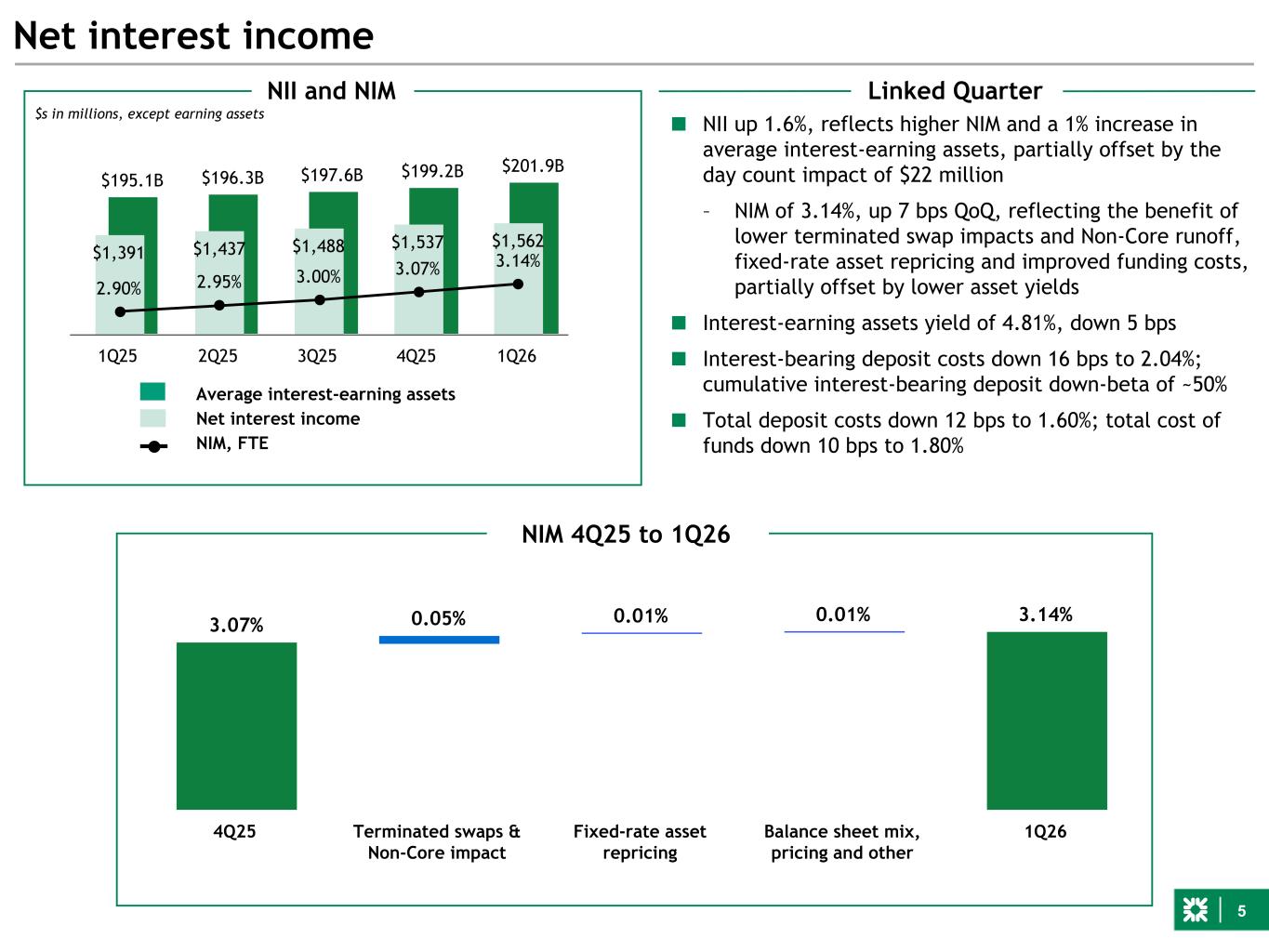 5 3.07% 0.05% 0.01% 0.01% 3.14% 4Q25 Terminated swaps & Non-Core impact Fixed-rate asset repricing Balance sheet mix, pricing and other 1Q26 $195.1B $196.3B $197.6B $199.2B $201.9B $1,391 $1,437 $1,488 $1,537 $1,562 2.90% 2.95% 3.00% 3.07% 3.14% 1Q25 2Q25 3Q25 4Q25 1Q26 ■ NII up 1.6%, reflects higher NIM and a 1% increase in average interest-earning assets, partially offset by the day count impact of $22 million – NIM of 3.14%, up 7 bps QoQ, reflecting the benefit of lower terminated swap impacts and Non-Core runoff, fixed-rate asset repricing and improved funding costs, partially offset by lower asset yields ■ Interest-earning assets yield of 4.81%, down 5 bps ■ Interest-bearing deposit costs down 16 bps to 2.04%; cumulative interest-bearing deposit down-beta of ~50% ■ Total deposit costs down 12 bps to 1.60%; total cost of funds down 10 bps to 1.80% Net interest income NII and NIM Average interest-earning assets Net interest income NIM, FTE Linked Quarter NIM 4Q25 to 1Q26 $s in millions, except earning assets *