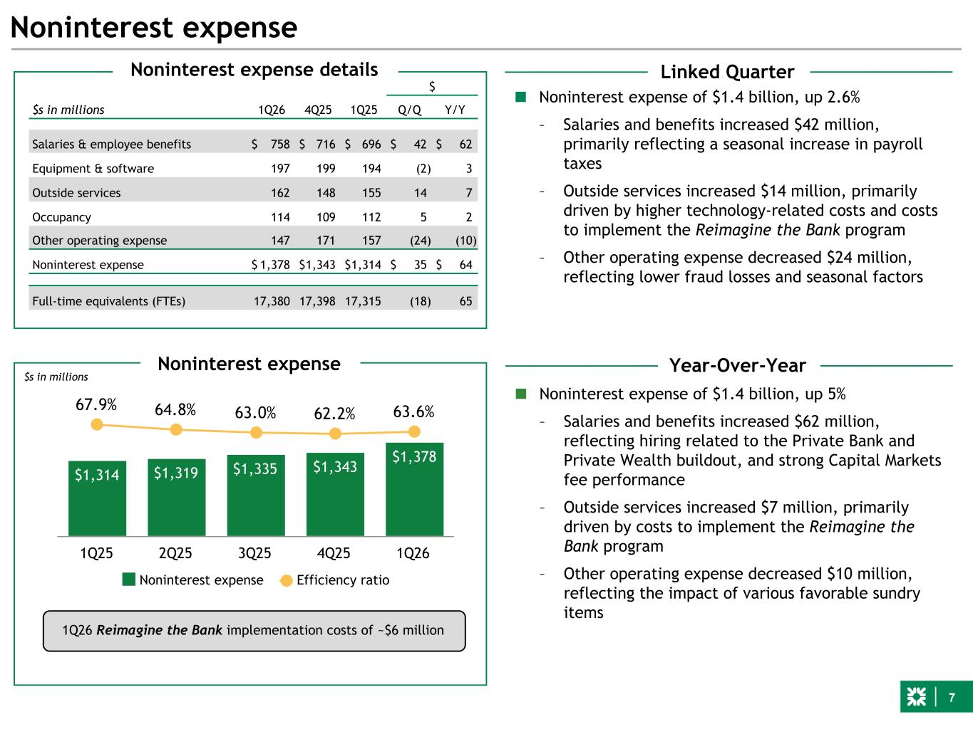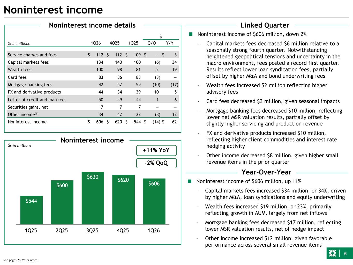 6 $544 $600 $630 $620 $606 1Q25 2Q25 3Q25 4Q25 1Q26 Noninterest income $s in millions Linked Quarter Year-Over-Year Noninterest income $s in millions 1Q26 4Q25 1Q25 $ Q/Q Y/Y Service charges and fees $ 112 $ 112 $ 109 $ — $ 3 Capital markets fees 134 140 100 (6) 34 Wealth fees 100 98 81 2 19 Card fees 83 86 83 (3) — Mortgage banking fees 42 52 59 (10) (17) FX and derivative products 44 34 39 10 5 Letter of credit and loan fees 50 49 44 1 6 Securities gains, net 7 7 7 — — Other income(1) 34 42 22 (8) 12 Noninterest income $ 606 $ 620 $ 544 $ (14) $ 62 Noninterest income details ■ Noninterest income of $606 million, up 11% – Capital markets fees increased $34 million, or 34%, driven by higher M&A, loan syndications and equity underwriting – Wealth fees increased $19 million, or 23%, primarily reflecting growth in AUM, largely from net inflows – Mortgage banking fees decreased $17 million, reflecting lower MSR valuation results, net of hedge impact – Other income increased $12 million, given favorable performance across several small revenue items +11% YoY -2% QoQ ■ Noninterest income of $606 million, down 2% – Capital markets fees decreased $6 million relative to a seasonally strong fourth quarter. Notwithstanding heightened geopolitical tensions and uncertainty in the macro environment, fees posted a record first quarter. Results reflect lower loan syndication fees, partially offset by higher M&A and bond underwriting fees – Wealth fees increased $2 million reflecting higher advisory fees – Card fees decreased $3 million, given seasonal impacts – Mortgage banking fees decreased $10 million, reflecting lower net MSR valuation results, partially offset by slightly higher servicing and production revenue – FX and derivative products increased $10 million, reflecting higher client commodities and interest rate hedging activity – Other income decreased $8 million, given higher small revenue items in the prior quarter See pages 28-29 for notes.