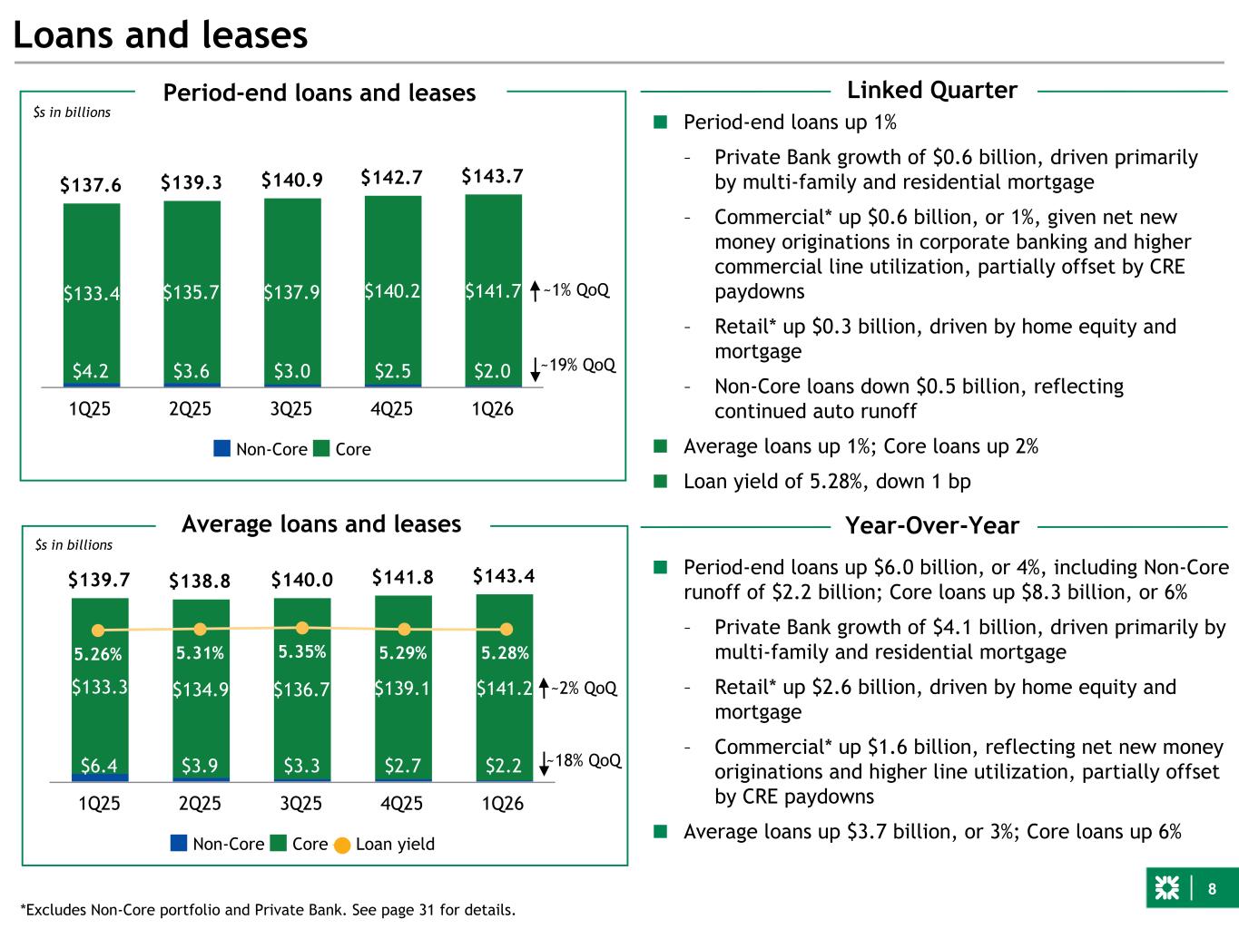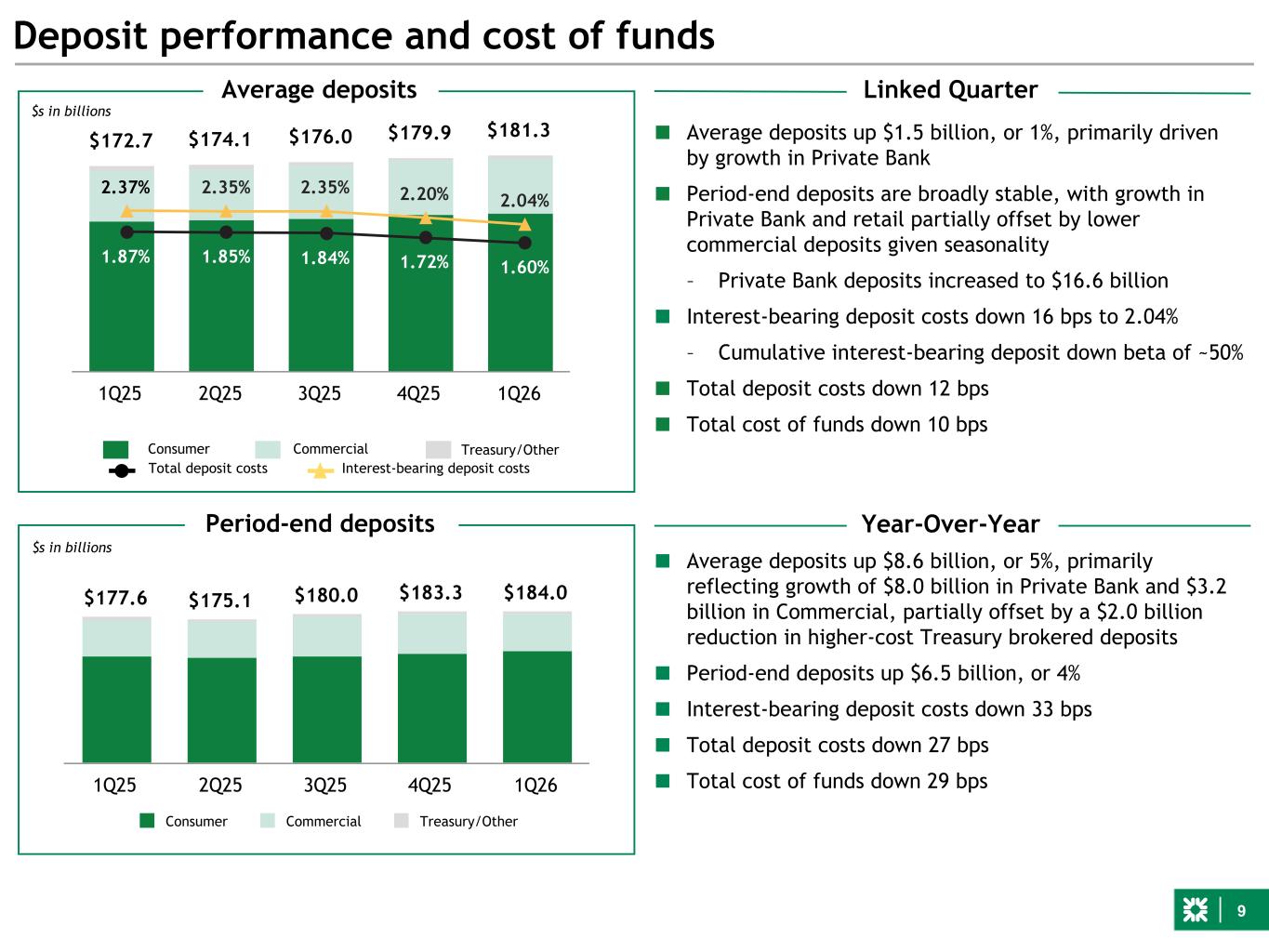 8 $139.7 $138.8 $140.0 $141.8 $143.4 $6.4 $3.9 $3.3 $2.7 $2.2 $133.3 $134.9 $136.7 $139.1 $141.2 Non-Core Core Loan yield 1Q25 2Q25 3Q25 4Q25 1Q26 ~18% QoQ ■ Period-end loans up 1% – Private Bank growth of $0.6 billion, driven primarily by multi-family and residential mortgage – Commercial* up $0.6 billion, or 1%, given net new money originations in corporate banking and higher commercial line utilization, partially offset by CRE paydowns – Retail* up $0.3 billion, driven by home equity and mortgage – Non-Core loans down $0.5 billion, reflecting continued auto runoff ■ Average loans up 1%; Core loans up 2% ■ Loan yield of 5.28%, down 1 bp Loans and leases $s in billions Average loans and leases $137.6 $139.3 $140.9 $142.7 $143.7 $4.2 $3.6 $3.0 $2.5 $2.0 $133.4 $135.7 $137.9 $140.2 $141.7 Non-Core Core 1Q25 2Q25 3Q25 4Q25 1Q26 $s in billions Period-end loans and leases 5.26% 5.31% 5.35% 5.29% 5.28% Linked Quarter Year-Over-Year ~19% QoQ ~1% QoQ ~2% QoQ *Excludes Non-Core portfolio and Private Bank. See page 31 for details. ■ Period-end loans up $6.0 billion, or 4%, including Non-Core runoff of $2.2 billion; Core loans up $8.3 billion, or 6% – Private Bank growth of $4.1 billion, driven primarily by multi-family and residential mortgage – Retail* up $2.6 billion, driven by home equity and mortgage – Commercial* up $1.6 billion, reflecting net new money originations and higher line utilization, partially offset by CRE paydowns ■ Average loans up $3.7 billion, or 3%; Core loans up 6%