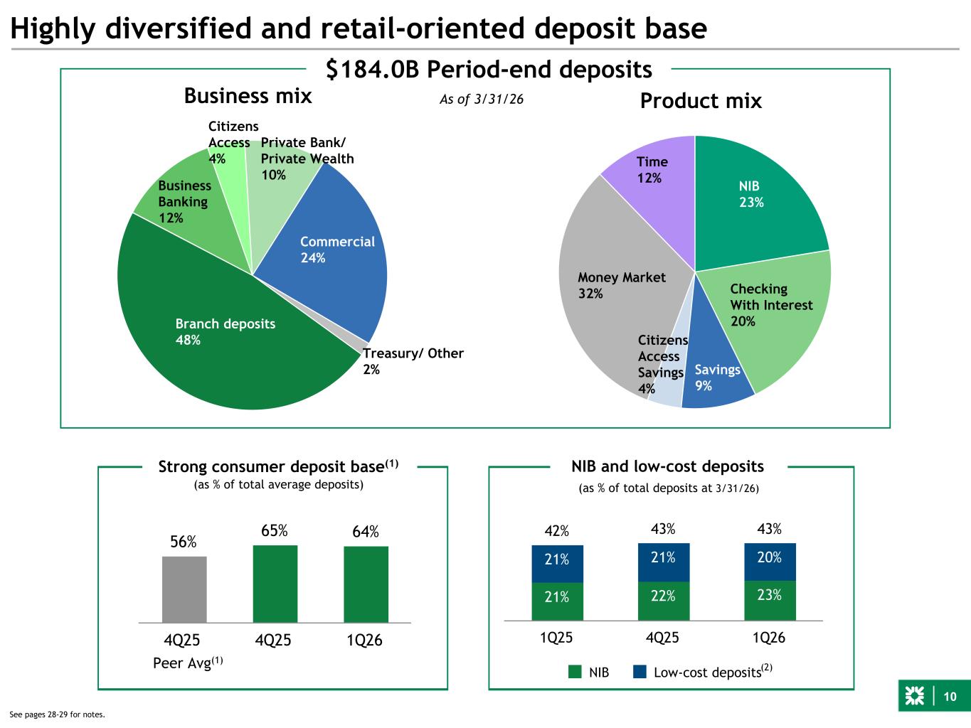 9 $172.7 $174.1 $176.0 $179.9 $181.3 1Q25 2Q25 3Q25 4Q25 1Q26 Deposit performance and cost of funds $s in billions Average deposits 1.87% 1.85% 1.84% 1.72% 1.60% 2.37% 2.35% 2.35% 2.20% 2.04% Total deposit costs Interest-bearing deposit costs CommercialConsumer Treasury/Other Year-Over-YearPeriod-end deposits Linked Quarter ■ Average deposits up $1.5 billion, or 1%, primarily driven by growth in Private Bank ■ Period-end deposits are broadly stable, with growth in Private Bank and retail partially offset by lower commercial deposits given seasonality – Private Bank deposits increased to $16.6 billion ■ Interest-bearing deposit costs down 16 bps to 2.04% – Cumulative interest-bearing deposit down beta of ~50% ■ Total deposit costs down 12 bps ■ Total cost of funds down 10 bps $s in billions ■ Average deposits up $8.6 billion, or 5%, primarily reflecting growth of $8.0 billion in Private Bank and $3.2 billion in Commercial, partially offset by a $2.0 billion reduction in higher-cost Treasury brokered deposits ■ Period-end deposits up $6.5 billion, or 4% ■ Interest-bearing deposit costs down 33 bps ■ Total deposit costs down 27 bps ■ Total cost of funds down 29 bps $177.6 $175.1 $180.0 $183.3 $184.0 Consumer Commercial Treasury/Other 1Q25 2Q25 3Q25 4Q25 1Q26