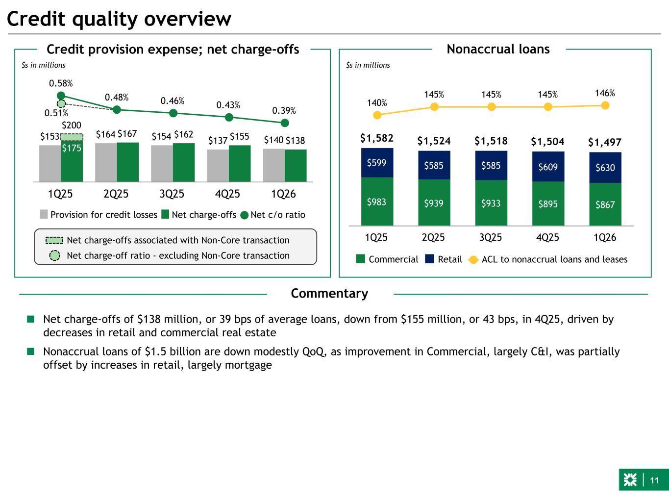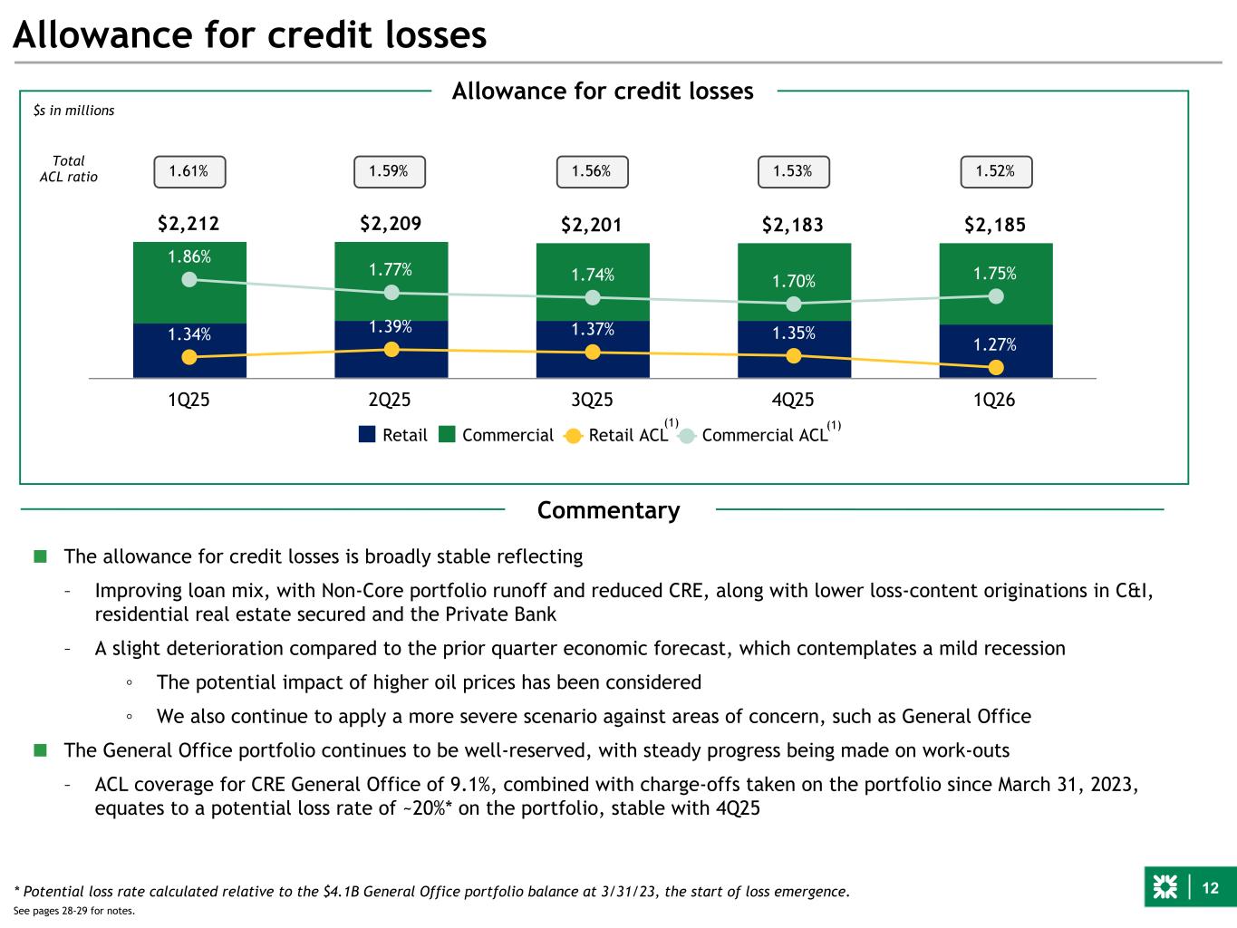 11 $153 $164 $154 $137 $140 $200 $167 $162 $155 $138 0.58% 0.48% 0.46% 0.43% 0.39% Provision for credit losses Net charge-offs Net c/o ratio 1Q25 2Q25 3Q25 4Q25 1Q26 0.51% Credit quality overview $s in millions $s in millions Credit provision expense; net charge-offs $1,582 $1,524 $1,518 $1,504 $1,497 $983 $939 $933 $895 $867 $599 $585 $585 $609 $630 140% 145% 145% 145% 146% Commercial Retail ACL to nonaccrual loans and leases 1Q25 2Q25 3Q25 4Q25 1Q26 Nonaccrual loans Net charge-offs associated with Non-Core transaction $175 Net charge-off ratio - excluding Non-Core transaction Commentary ■ Net charge-offs of $138 million, or 39 bps of average loans, down from $155 million, or 43 bps, in 4Q25, driven by decreases in retail and commercial real estate ■ Nonaccrual loans of $1.5 billion are down modestly QoQ, as improvement in Commercial, largely C&I, was partially offset by increases in retail, largely mortgage