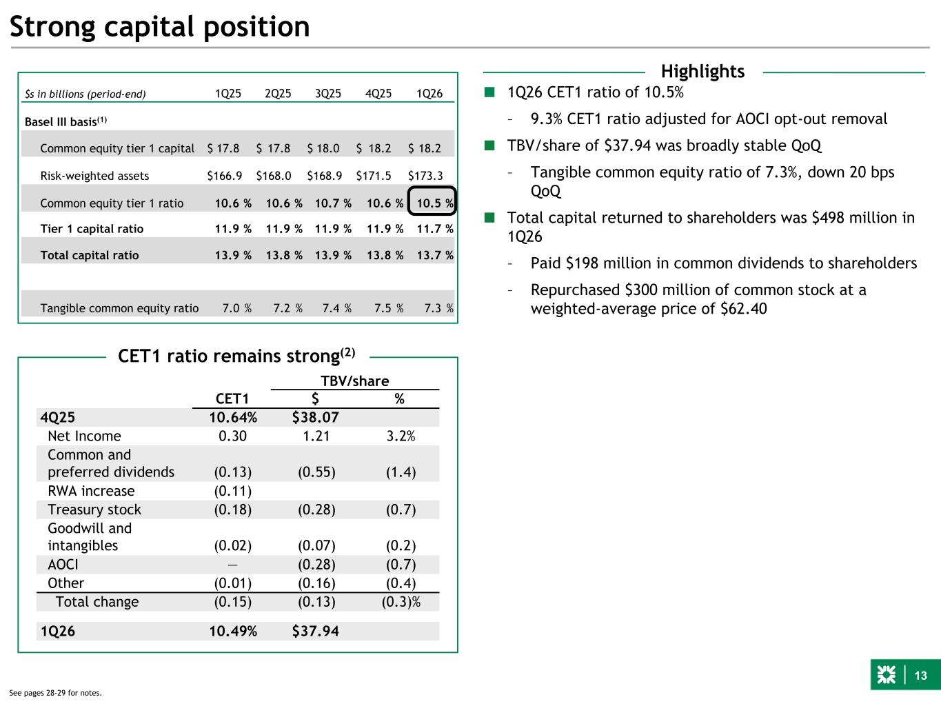 12 ■ The allowance for credit losses is broadly stable reflecting – Improving loan mix, with Non-Core portfolio runoff and reduced CRE, along with lower loss-content originations in C&I, residential real estate secured and the Private Bank – A slight deterioration compared to the prior quarter economic forecast, which contemplates a mild recession ◦ The potential impact of higher oil prices has been considered ◦ We also continue to apply a more severe scenario against areas of concern, such as General Office ■ The General Office portfolio continues to be well-reserved, with steady progress being made on work-outs – ACL coverage for CRE General Office of 9.1%, combined with charge-offs taken on the portfolio since March 31, 2023, equates to a potential loss rate of ~20%* on the portfolio, stable with 4Q25 Allowance for credit losses $2,212 $2,209 $2,201 $2,183 $2,185 1.34% 1.39% 1.37% 1.35% 1.27% 1.86% 1.77% 1.74% 1.70% 1.75% Retail Commercial Retail ACL Commercial ACL 1Q25 2Q25 3Q25 4Q25 1Q26 $s in millions Allowance for credit losses (1) * Potential loss rate calculated relative to the $4.1B General Office portfolio balance at 3/31/23, the start of loss emergence. Commentary 1.61% 1.59% 1.56% 1.53% 1.52% Total ACL ratio See pages 28-29 for notes. (1)