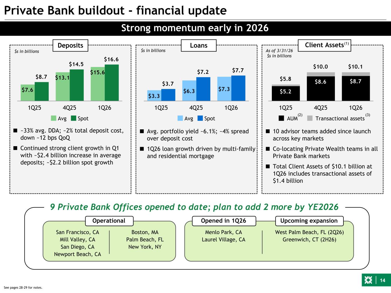 14 ■ ~33% avg. DDA; ~2% total deposit cost, down ~12 bps QoQ ■ Continued strong client growth in Q1 with ~$2.4 billion increase in average deposits; ~$2.2 billion spot growth Deposits $3.3 $6.3 $7.3 $3.7 $7.2 $7.7 Avg Spot 1Q25 4Q25 1Q26 $7.6 $13.1 $15.6 $8.7 $14.5 $16.6 Avg Spot 1Q25 4Q25 1Q26 Loans Private Bank buildout - financial update Strong momentum early in 2026 $s in billions $5.8 $10.0 $10.1 $5.2 $8.6 $8.7 AUM Transactional assets 1Q25 4Q25 1Q26 As of 3/31/26 $s in billions Client Assets ■ Avg. portfolio yield ~6.1%; ~4% spread over deposit cost ■ 1Q26 loan growth driven by multi-family and residential mortgage (2) (1) (3) 9 Private Bank Offices opened to date; plan to add 2 more by YE2026 $s in billions ■ 10 advisor teams added since launch across key markets ■ Co-locating Private Wealth teams in all Private Bank markets ■ Total Client Assets of $10.1 billion at 1Q26 includes transactional assets of $1.4 billion Operational San Francisco, CA Boston, MA Menlo Park, CA West Palm Beach, FL (2Q26) Mill Valley, CA Palm Beach, FL Laurel Village, CA Greenwich, CT (2H26) San Diego, CA New York, NY Newport Beach, CA Opened in 1Q26 Upcoming expansion See pages 28-29 for notes.