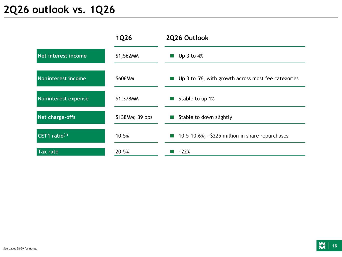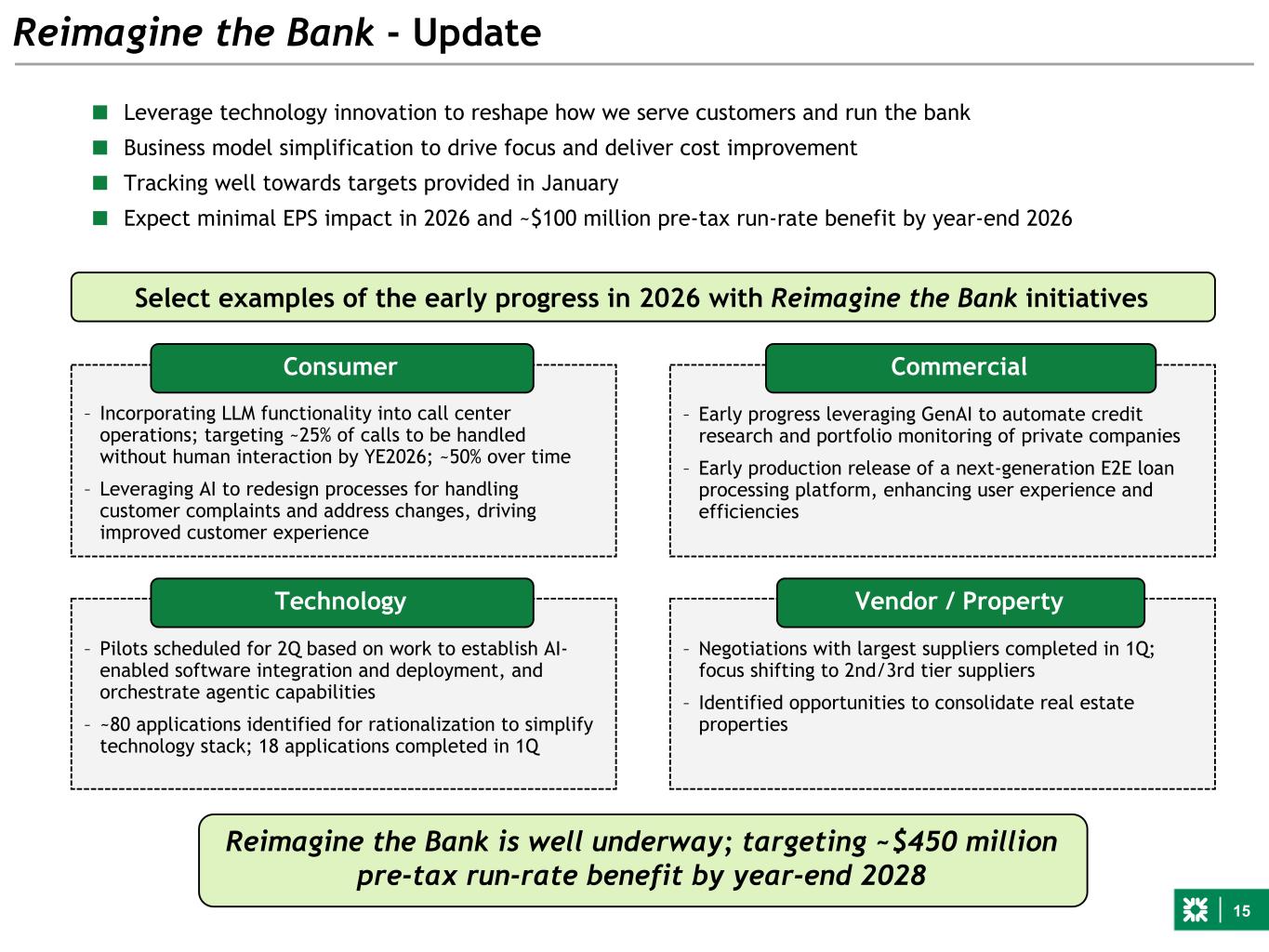 15 Reimagine the Bank - Update ■ Leverage technology innovation to reshape how we serve customers and run the bank ■ Business model simplification to drive focus and deliver cost improvement ■ Tracking well towards targets provided in January ■ Expect minimal EPS impact in 2026 and ~$100 million pre-tax run-rate benefit by year-end 2026 Consumer Commercial Technology Vendor / Property Select examples of the early progress in 2026 with Reimagine the Bank initiatives – Incorporating LLM functionality into call center operations; targeting ~25% of calls to be handled without human interaction by YE2026; ~50% over time – Leveraging AI to redesign processes for handling customer complaints and address changes, driving improved customer experience – Early progress leveraging GenAI to automate credit research and portfolio monitoring of private companies – Early production release of a next-generation E2E loan processing platform, enhancing user experience and efficiencies – Pilots scheduled for 2Q based on work to establish AI- enabled software integration and deployment, and orchestrate agentic capabilities – ~80 applications identified for rationalization to simplify technology stack; 18 applications completed in 1Q – Negotiations with largest suppliers completed in 1Q; focus shifting to 2nd/3rd tier suppliers – Identified opportunities to consolidate real estate properties Reimagine the Bank is well underway; targeting ~$450 million pre-tax run-rate benefit by year-end 2028
