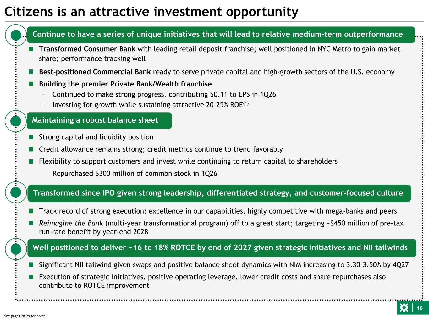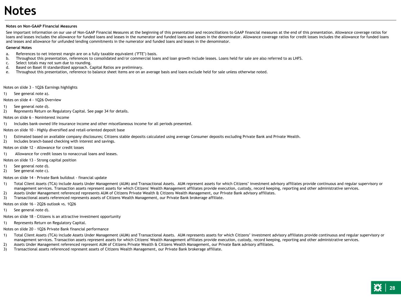 28 Notes on Non-GAAP Financial Measures See important information on our use of Non-GAAP Financial Measures at the beginning of this presentation and reconciliations to GAAP financial measures at the end of this presentation. Allowance coverage ratios for loans and leases includes the allowance for funded loans and leases in the numerator and funded loans and leases in the denominator. Allowance coverage ratios for credit losses includes the allowance for funded loans and leases and allowance for unfunded lending commitments in the numerator and funded loans and leases in the denominator. General Notes a. References to net interest margin are on a fully taxable equivalent ("FTE") basis. b. Throughout this presentation, references to consolidated and/or commercial loans and loan growth include leases. Loans held for sale are also referred to as LHFS. c. Select totals may not sum due to rounding. d. Based on Basel III standardized approach. Capital Ratios are preliminary. e. Throughout this presentation, reference to balance sheet items are on an average basis and loans exclude held for sale unless otherwise noted. Notes Notes on slide 3 - 1Q26 Earnings highlights 1) See general note a). Notes on slide 4 - 1Q26 Overview 1) See general note d). 2) Represents Return on Regulatory Capital. See page 34 for details. Notes on slide 6 - Noninterest income 1) Includes bank-owned life insurance income and other miscellaneous income for all periods presented. Notes on slide 10 - Highly diversified and retail-oriented deposit base 1) Estimated based on available company disclosures; Citizens stable deposits calculated using average Consumer deposits excluding Private Bank and Private Wealth. 2) Includes branch-based checking with interest and savings. Notes on slide 12 - Allowance for credit losses 1) Allowance for credit losses to nonaccrual loans and leases. Notes on slide 13 - Strong capital position 1) See general note d). 2) See general note c). Notes on slide 14 - Private Bank buildout - financial update 1) Total Client Assets (TCA) include Assets Under Management (AUM) and Transactional Assets. AUM represent assets for which Citizens’ investment advisory affiliates provide continuous and regular supervisory or management services. Transaction assets represent assets for which Citizens' Wealth Management affiliates provide execution, custody, record keeping, reporting and other administrative services. 2) Assets Under Management referenced represents AUM of Citizens Private Wealth & Citizens Wealth Management, our Private Bank advisory affiliates. 3) Transactional assets referenced represents assets of Citizens Wealth Management, our Private Bank brokerage affiliate. Notes on slide 16 - 2Q26 outlook vs. 1Q26 1) See general note d). Notes on slide 18 - Citizens is an attractive investment opportunity 1) Represents Return on Regulatory Capital. Notes on slide 20 - 1Q26 Private Bank financial performance 1) Total Client Assets (TCA) include Assets Under Management (AUM) and Transactional Assets. AUM represents assets for which Citizens’ investment advisory affiliates provide continuous and regular supervisory or management services. Transaction assets represent assets for which Citizens' Wealth Management affiliates provide execution, custody, record keeping, reporting and other administrative services. 2) Assets Under Management referenced represent AUM of Citizens Private Wealth & Citizens Wealth Management, our Private Bank advisory affiliates. 3) Transactional assets referenced represent assets of Citizens Wealth Management, our Private Bank brokerage affiliate.