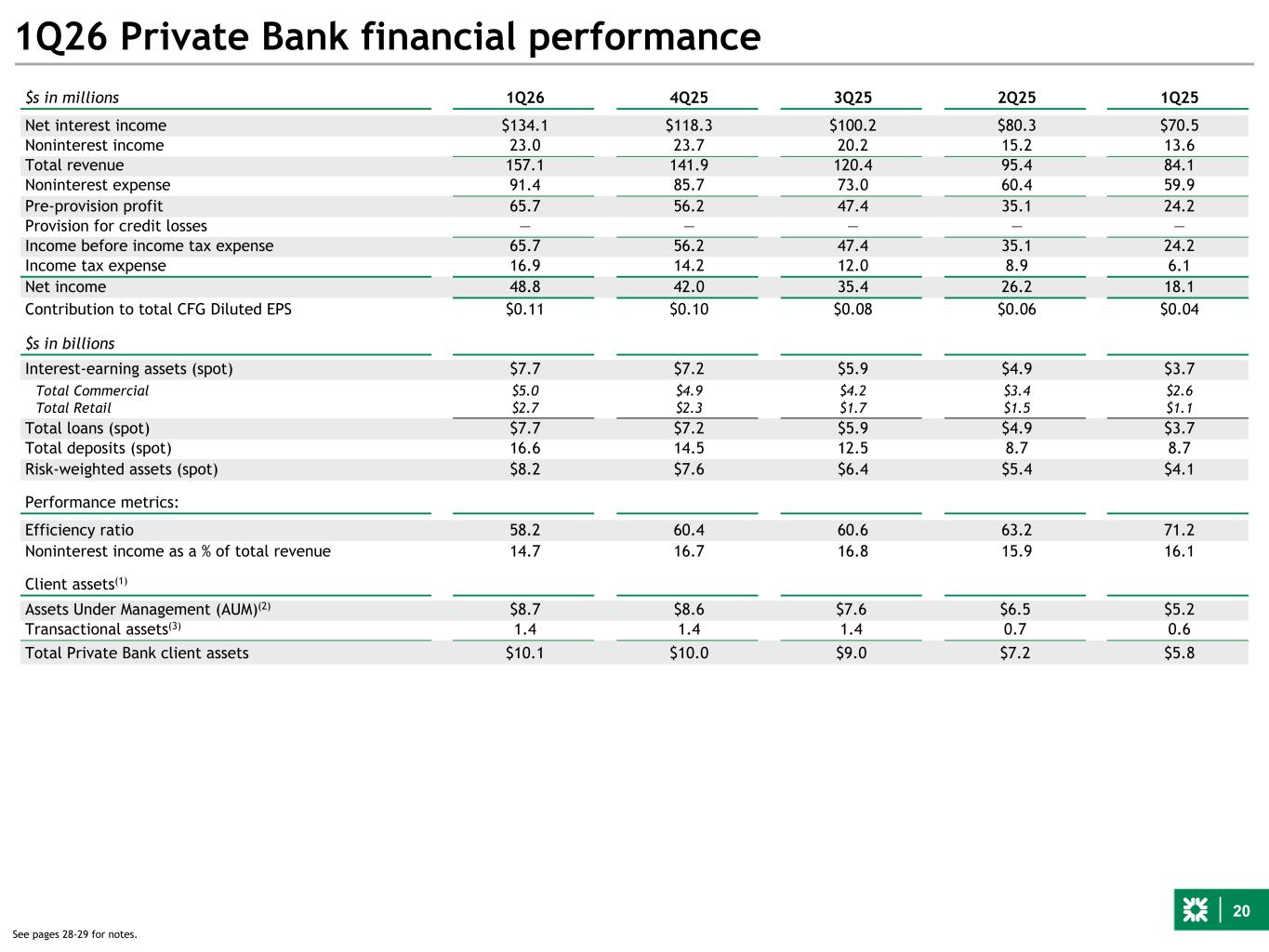 20 1Q26 Private Bank financial performance $s in millions 1Q26 4Q25 3Q25 2Q25 1Q25 Net interest income $134.1 $118.3 $100.2 $80.3 $70.5 Noninterest income 23.0 23.7 20.2 15.2 13.6 Total revenue 157.1 141.9 120.4 95.4 84.1 Noninterest expense 91.4 85.7 73.0 60.4 59.9 Pre-provision profit 65.7 56.2 47.4 35.1 24.2 Provision for credit losses — — — — — Income before income tax expense 65.7 56.2 47.4 35.1 24.2 Income tax expense 16.9 14.2 12.0 8.9 6.1 Net income 48.8 42.0 35.4 26.2 18.1 Contribution to total CFG Diluted EPS $0.11 $0.10 $0.08 $0.06 $0.04 $s in billions Interest-earning assets (spot) $7.7 $7.2 $5.9 $4.9 $3.7 Total Commercial $5.0 $4.9 $4.2 $3.4 $2.6 Total Retail $2.7 $2.3 $1.7 $1.5 $1.1 Total loans (spot) $7.7 $7.2 $5.9 $4.9 $3.7 Total deposits (spot) 16.6 14.5 12.5 8.7 8.7 Risk-weighted assets (spot) $8.2 $7.6 $6.4 $5.4 $4.1 Performance metrics: Efficiency ratio 58.2 60.4 60.6 63.2 71.2 Noninterest income as a % of total revenue 14.7 16.7 16.8 15.9 16.1 Client assets(1) Assets Under Management (AUM)(2) $8.7 $8.6 $7.6 $6.5 $5.2 Transactional assets(3) 1.4 1.4 1.4 0.7 0.6 Total Private Bank client assets $10.1 $10.0 $9.0 $7.2 $5.8 See pages 28-29 for notes.