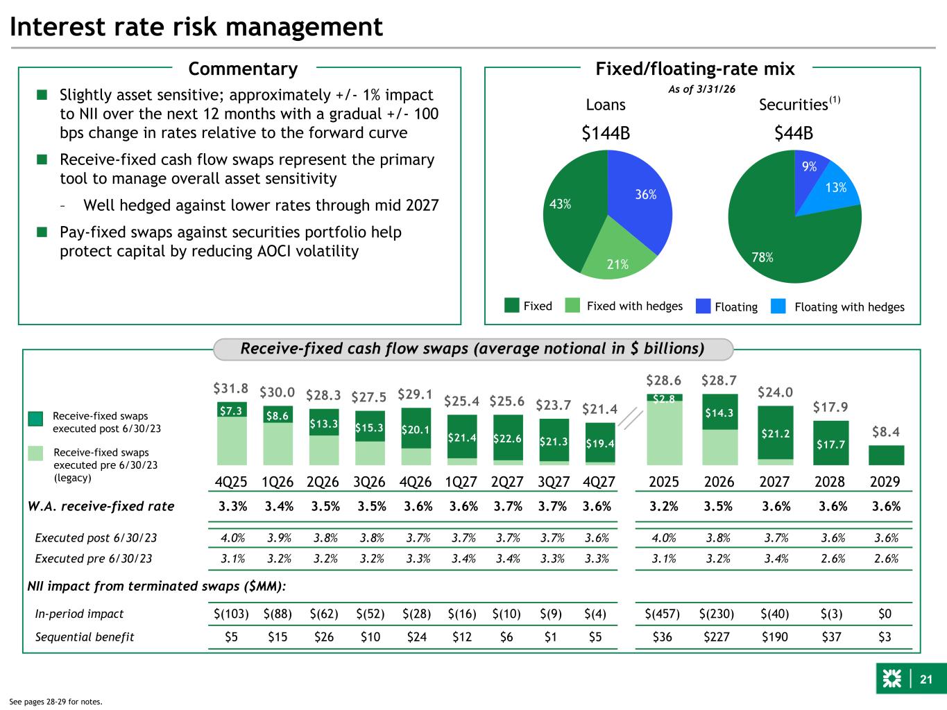 21 $31.8 $30.0 $28.3 $27.5 $29.1 $25.4 $25.6 $23.7 $21.4$7.3 $8.6 $13.3 $15.3 $20.1 $21.4 $22.6 $21.3 $19.4 4Q25 1Q26 2Q26 3Q26 4Q26 1Q27 2Q27 3Q27 4Q27 $28.6 $28.7 $24.0 $17.9 $8.4 $2.8 $14.3 $21.2 $17.7 2025 2026 2027 2028 2029 Interest rate risk management W.A. receive-fixed rate 3.3% 3.4% 3.5% 3.5% 3.6% 3.6% 3.7% 3.7% 3.6% 3.2% 3.5% 3.6% 3.6% 3.6% Executed post 6/30/23 4.0% 3.9% 3.8% 3.8% 3.7% 3.7% 3.7% 3.7% 3.6% 4.0% 3.8% 3.7% 3.6% 3.6% Executed pre 6/30/23 3.1% 3.2% 3.2% 3.2% 3.3% 3.4% 3.4% 3.3% 3.3% 3.1% 3.2% 3.4% 2.6% 2.6% NII impact from terminated swaps ($MM): In-period impact $(103) $(88) $(62) $(52) $(28) $(16) $(10) $(9) $(4) $(457) $(230) $(40) $(3) $0 Sequential benefit $5 $15 $26 $10 $24 $12 $6 $1 $5 $36 $227 $190 $37 $3 Receive-fixed cash flow swaps (average notional in $ billions) ■ Slightly asset sensitive; approximately +/- 1% impact to NII over the next 12 months with a gradual +/- 100 bps change in rates relative to the forward curve ■ Receive-fixed cash flow swaps represent the primary tool to manage overall asset sensitivity – Well hedged against lower rates through mid 2027 ■ Pay-fixed swaps against securities portfolio help protect capital by reducing AOCI volatility Receive-fixed swaps executed post 6/30/23 Receive-fixed swaps executed pre 6/30/23 (legacy) Fixed/floating-rate mix 9% 13% 78% Securities $44B 36% 21% 43% Loans $144B Fixed Fixed with hedges Floating Floating with hedges Commentary 15% 15% 70% As of 3/31/26 (1) See pages 28-29 for notes.
